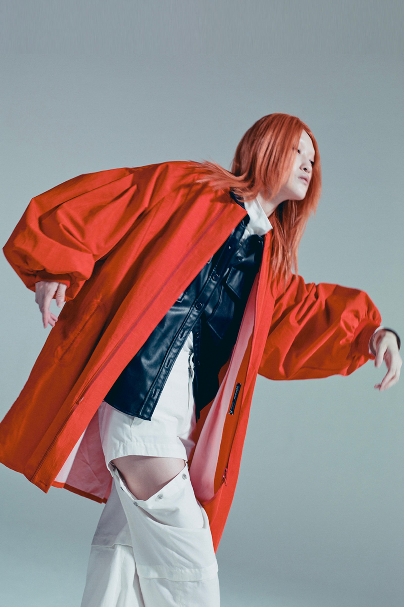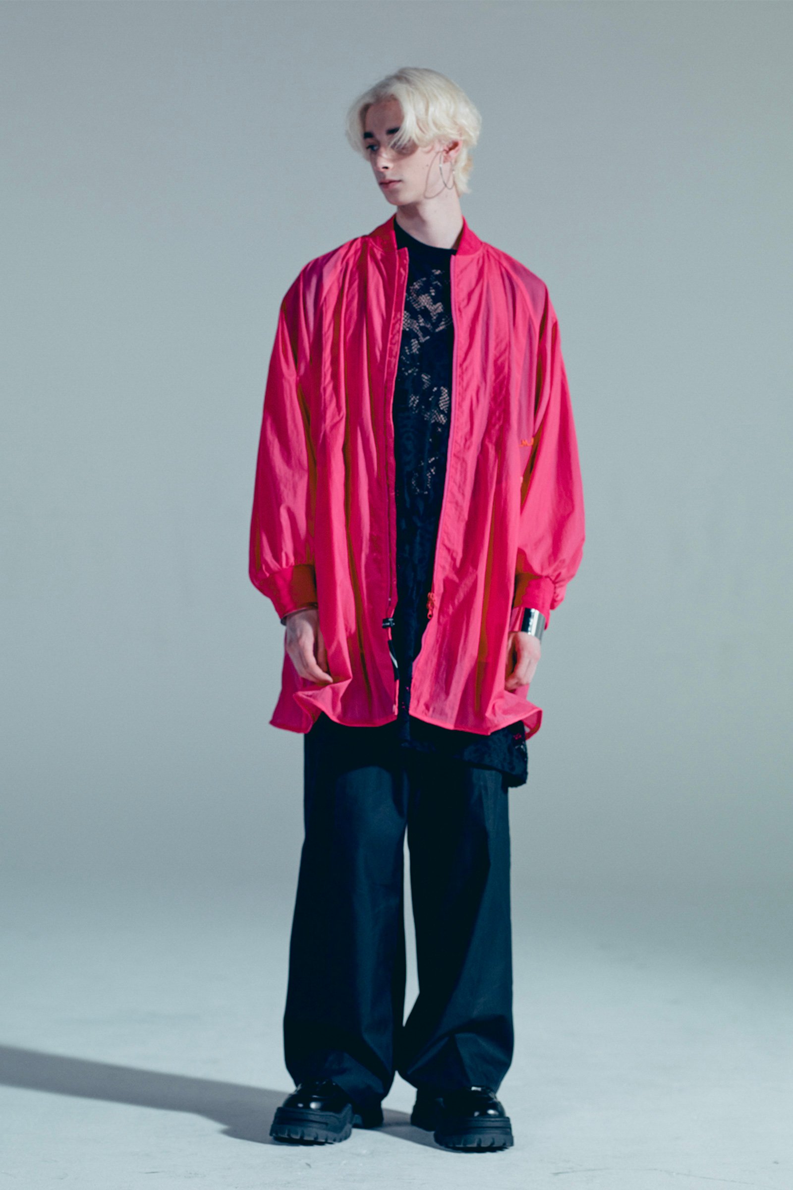 新作コレクションでは特定のテーマを設けず、ブランドコンセプトである「エイジレス」「ジェンダレス」「ボディポジティブ」の3つのキーワードにフォーカス。春夏コレクションにおいて、アウターブランドとしてこの3点をどう表現できるかに注力したという。軽さや機能性を実現するために、シャツ地に防風フィルムのボンディングを施したアイテムを製作。また、「コロナ禍で自然が恋しくなった」と三浦が語るように、動物や植物からインスピレーションを得たというピンクやレッド、イエローなどビビッドなカラーも目立った。