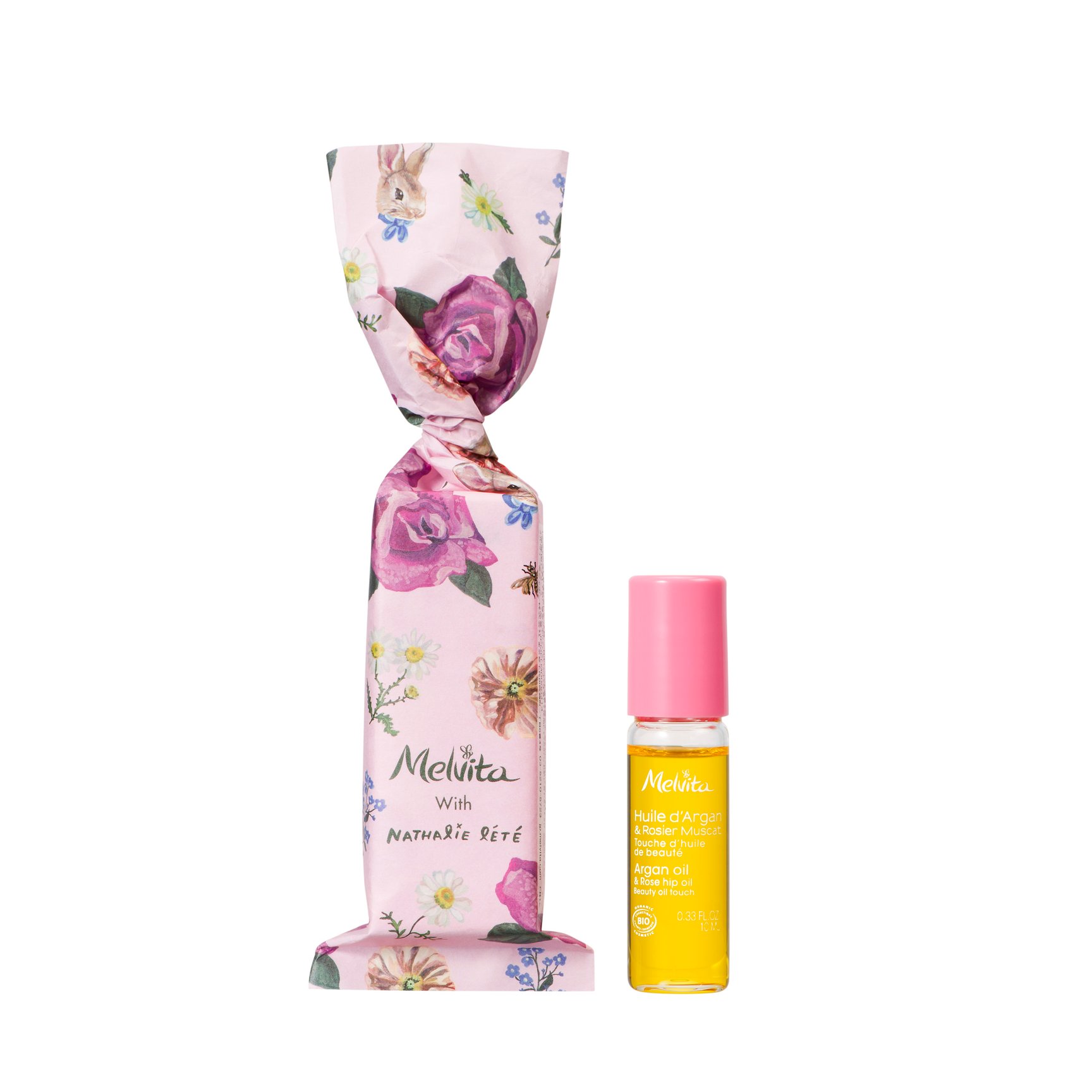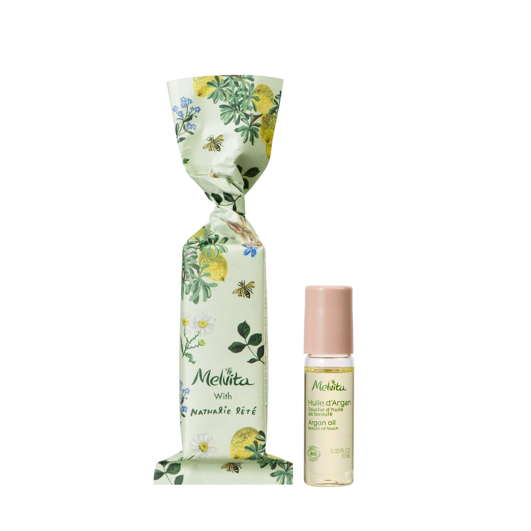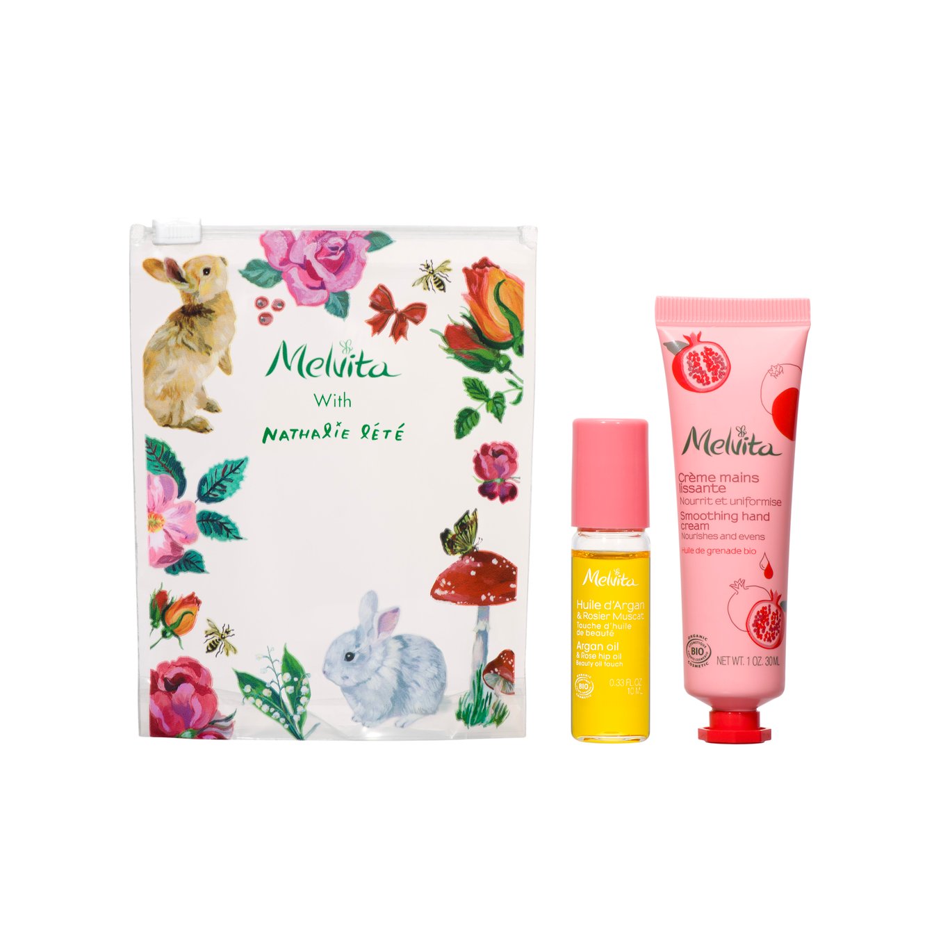 ナタリー・レテ書き下ろしのスライダーポーチに、アルガンオイルのロールオンとハンドクリームをセット。プチギフトにもおすすめです。