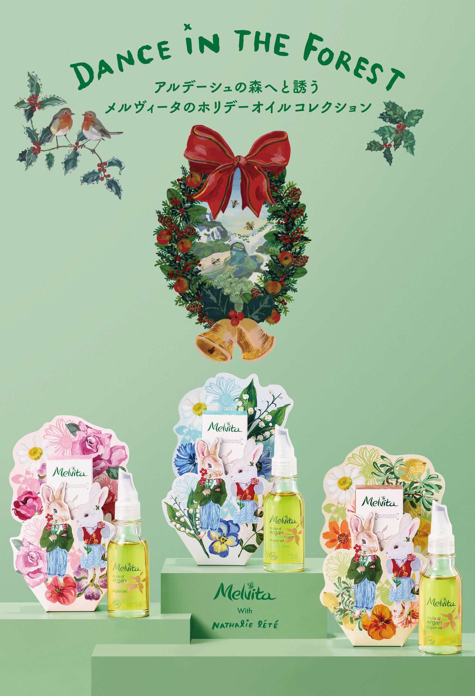 メルヴィータの故郷、フランス南東部にある自然豊かなアルデーシュの風景と、フランス人アーティストのナタリー・レテが織りなすハッピーな世界観が広がるホリデーコレクション。レテが描き下ろしたアルデーシュの森の案内人ラパン(うさぎ)が特別な時間に導いてくれます。