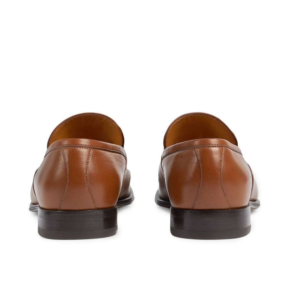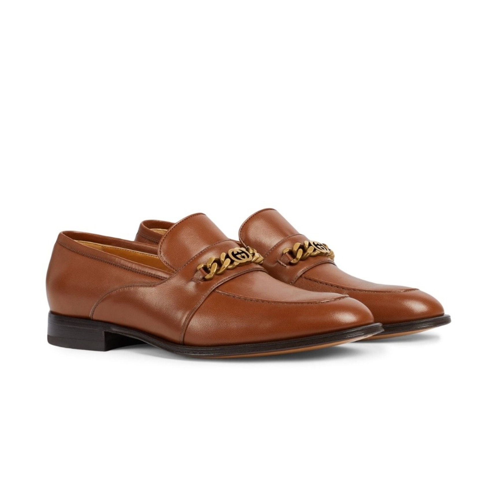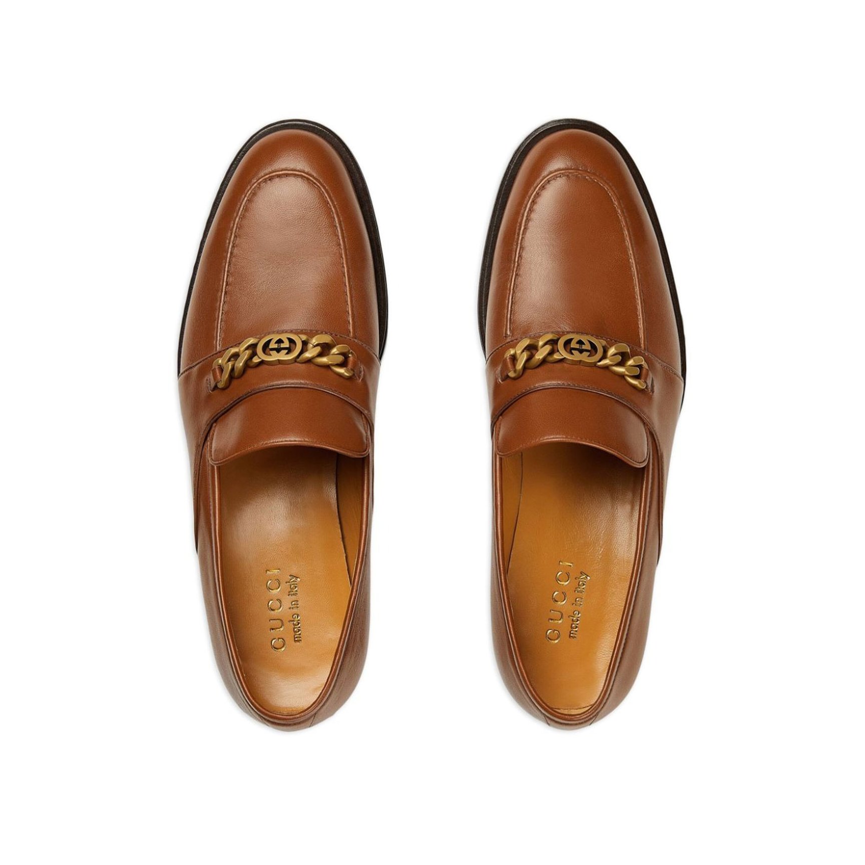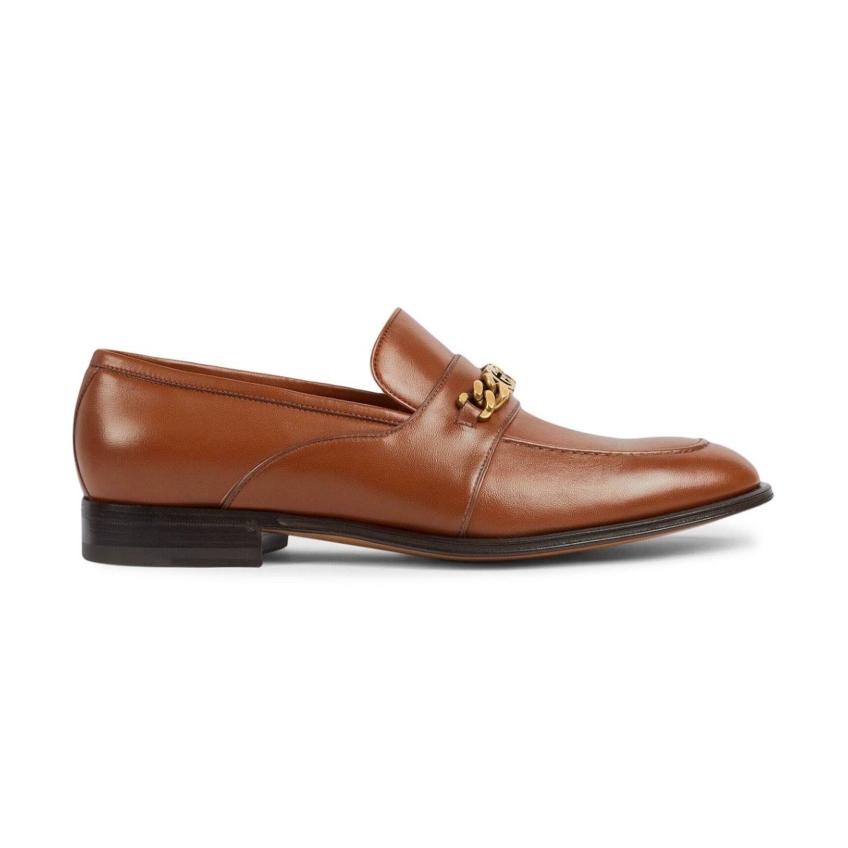 発色が美しいブラウンレザーに魅了される「グッチ(GUCCI)」のローファー。伝統あるデザインをベースにつくりあげた一足は、スモールサイズのインターロッキングGと、パラジウムトーンのチェーンがアクセント。ジュエリーさながらの輝きを満喫できます。