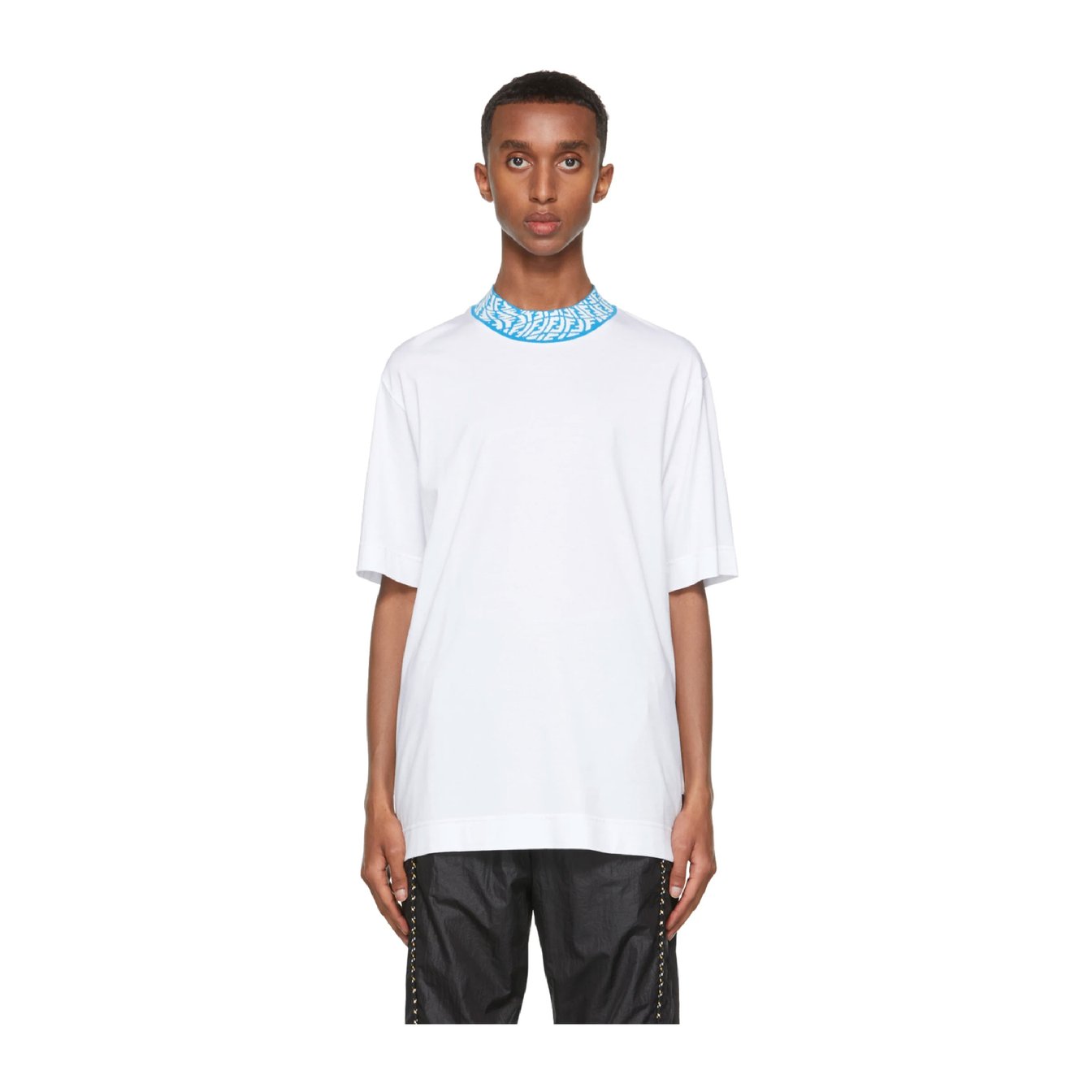 ニューヨークを拠点に活動しているアーティスト、サラ・コールマンとコラボレーションした「フェンディ(FENDI)」のカプセルコレクション。ハイネックにあしらった、鮮やかなライトブルーのFFヴァーティゴが夏らしく涼しげな印象に。