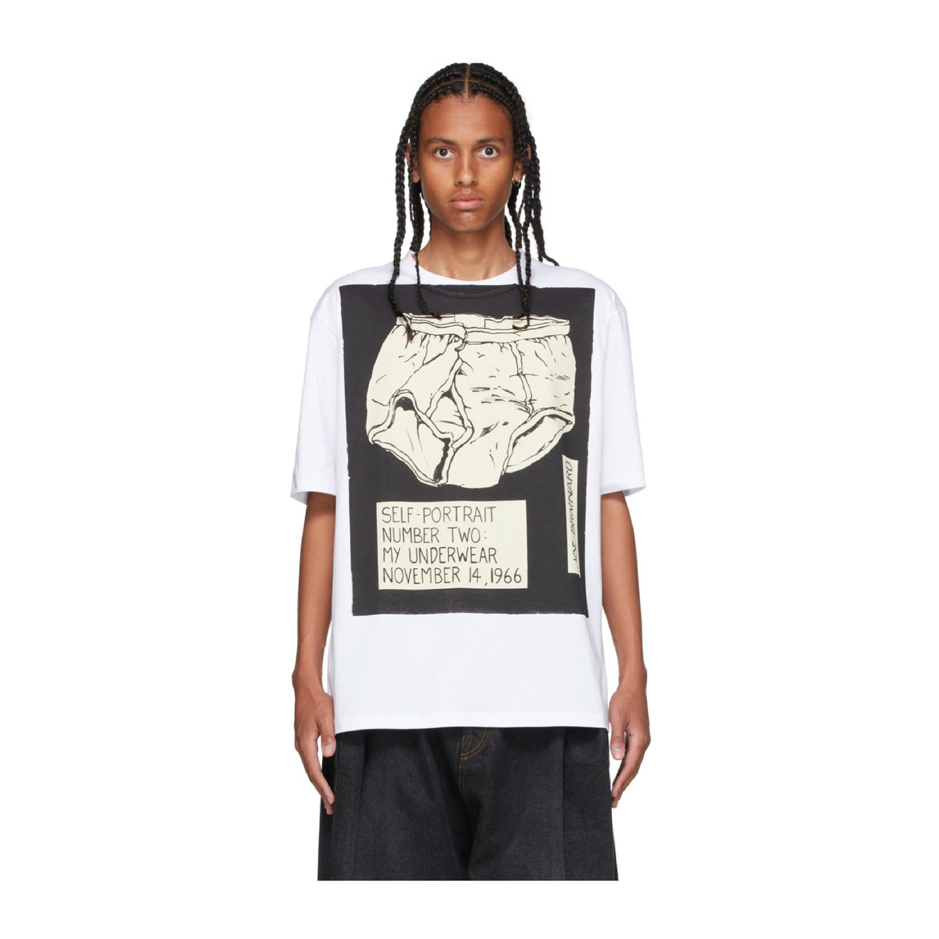 アメリカ人アーティスト、ジョー・ブレイナードの作品がプリントされた「ロエベ(LOEWE)」の半袖Tシャツ。アイコニックな絵や皮肉が効いた詩は、アートや工芸に造詣が深いロエベならではの一枚。