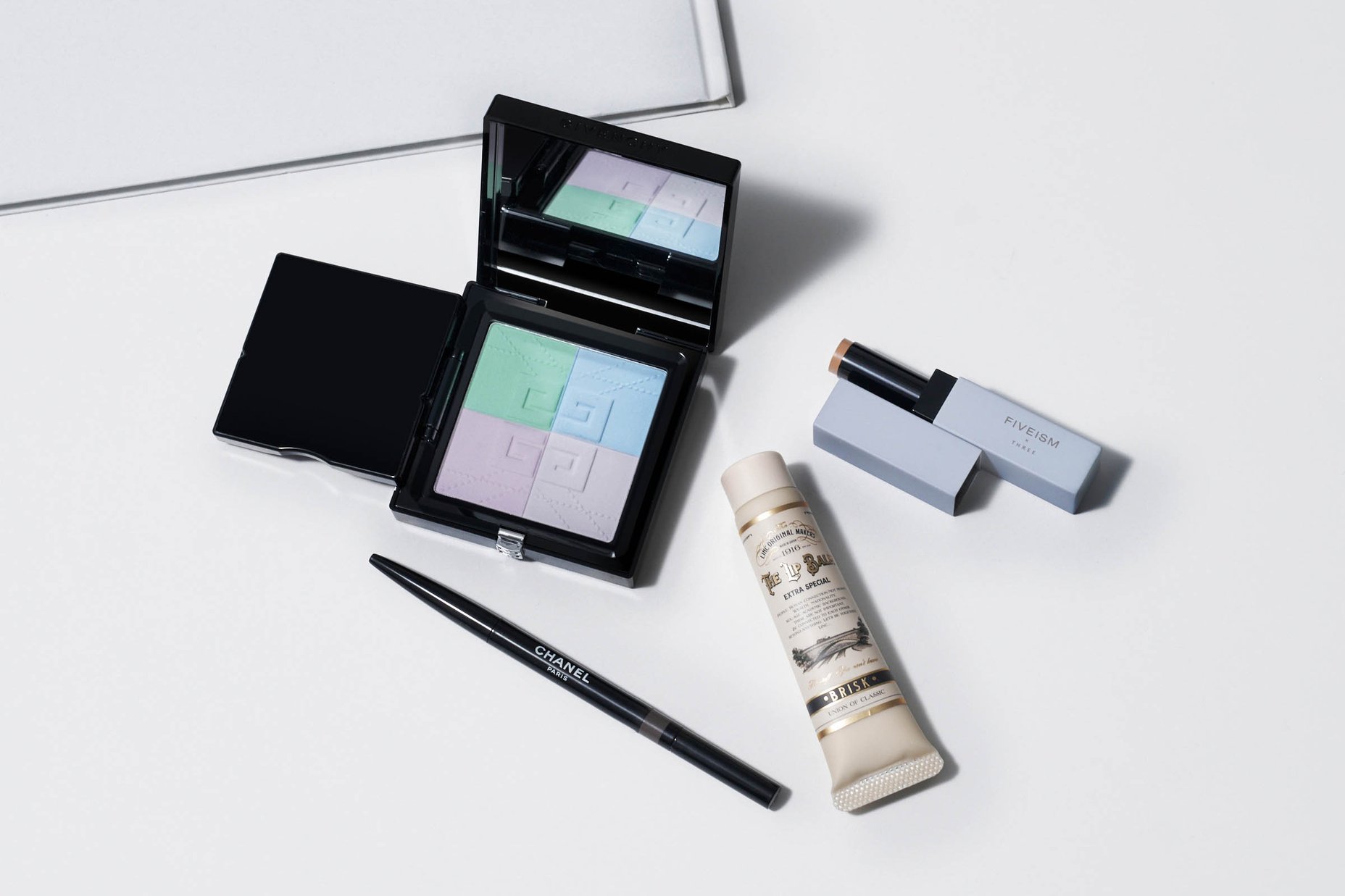 左上から時計まわりに、ジバンシイ プリズム リーヴル プレストパウダー、ファイブイズム×スリー コンシールバー S、リンク オリジナル メーカーズ リップバーム、シャネル スティロ スルスィル オート プレシジョン