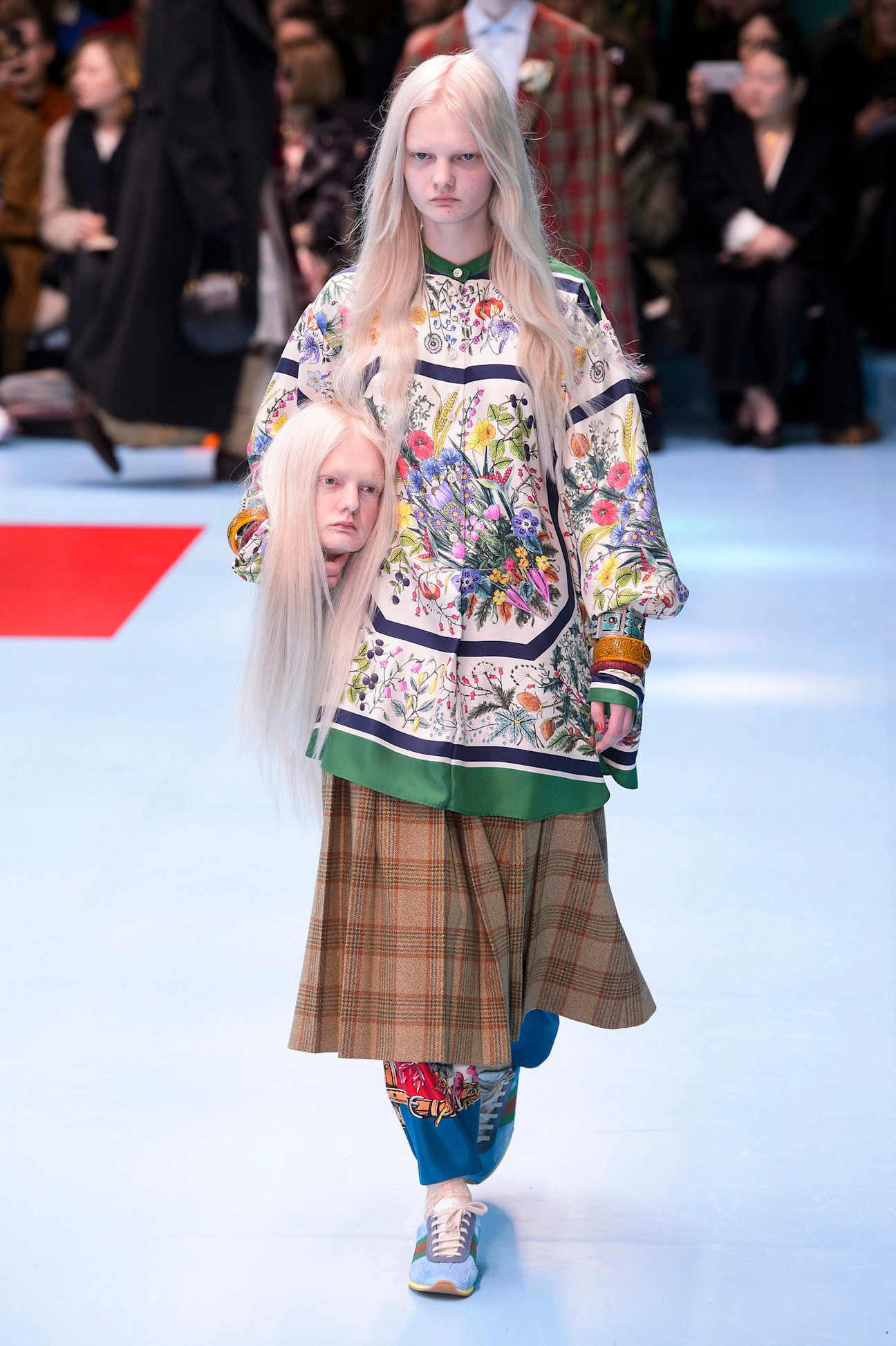 「グッチ」時代のミケーレで、大きな特徴と言えるのは大胆なアイデアだ。2018-19年秋冬コレクションはアメリカの哲学者ダナ・ハラウェイ(Donna Haraway)の論文「サイボーグ宣言」から着想を得て製作され、ショーには驚きのアイテムも登場した。