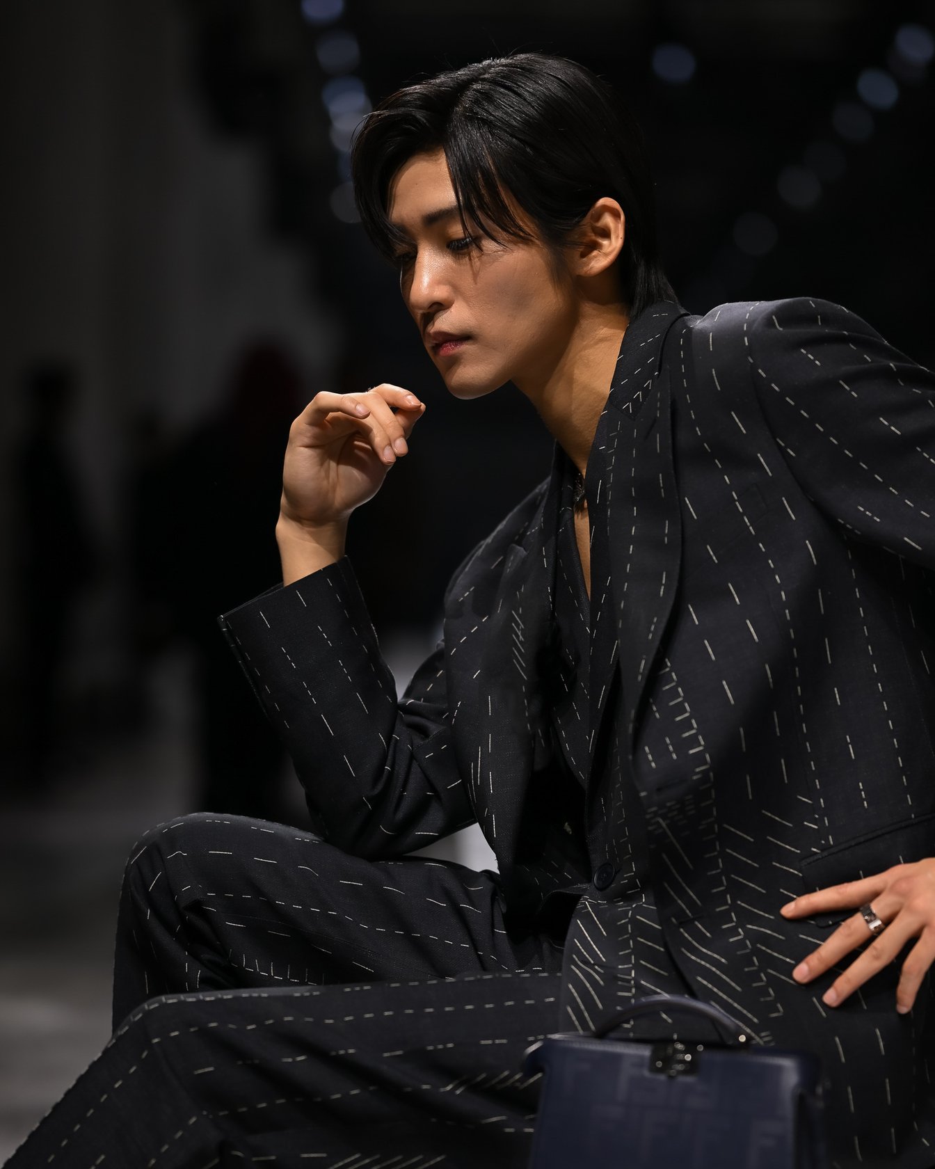 目黒さんは、2024春夏メンズコレクションのラストを飾ったルックで、サルトリアの精神が息づくステッチワークが表現されたセットアップを素肌にまとい、「FF」ロゴがきらめくシルバーのネックレスとリングが映える装い。ブランドのアイコンバッグ ピーカブーのミニサイズ「ピーカブー アイシーユー エックスクロス」を合わせ、シックにまとめました。
