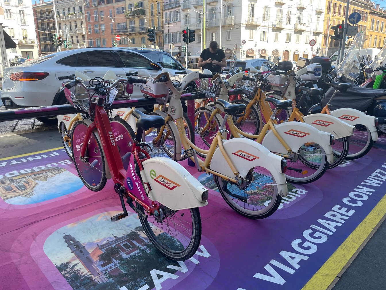 歩道の脇にはシェアサイクル「バイクミー(BikeMi)」。アプリを登録すればミラノ市内で使用できます。ピンクやイエローといったカラーリングがおしゃれ。