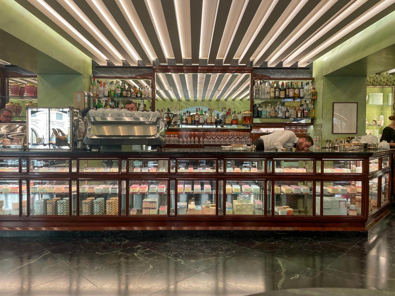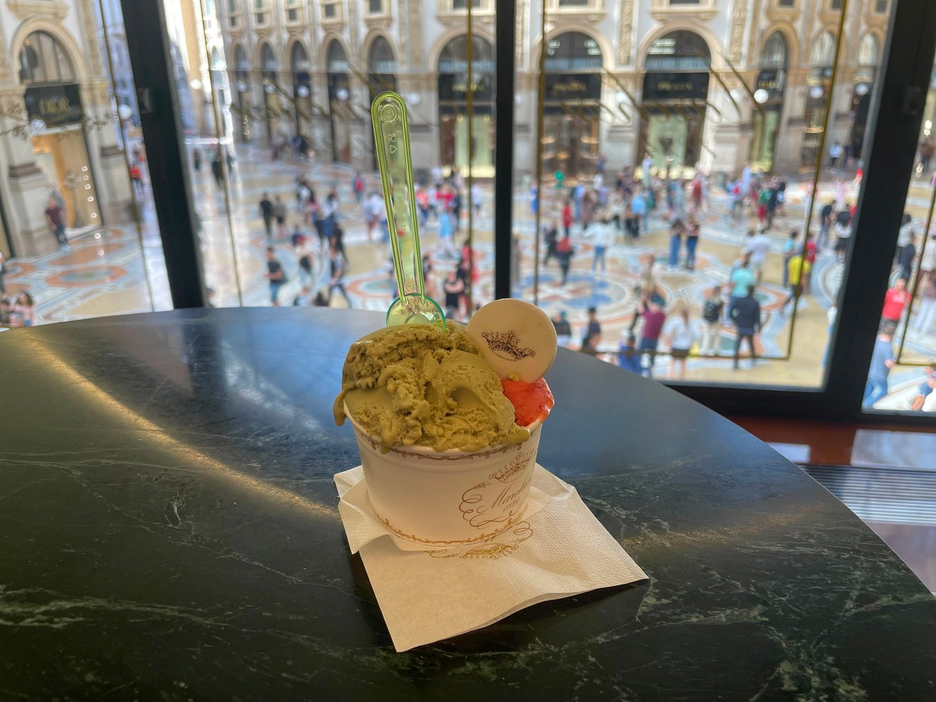 デザートは、これまたミラノ定番のジェラート!プラダグループ傘下の老舗洋菓子店で、日本未上陸の「マルケージ」へ。ウェス・アンダーソンの映画のような世界観の内装でした。濃厚なピスタチオと爽やかなストロベリーのダブルをセレクト。価格は4ユーロ程度です。