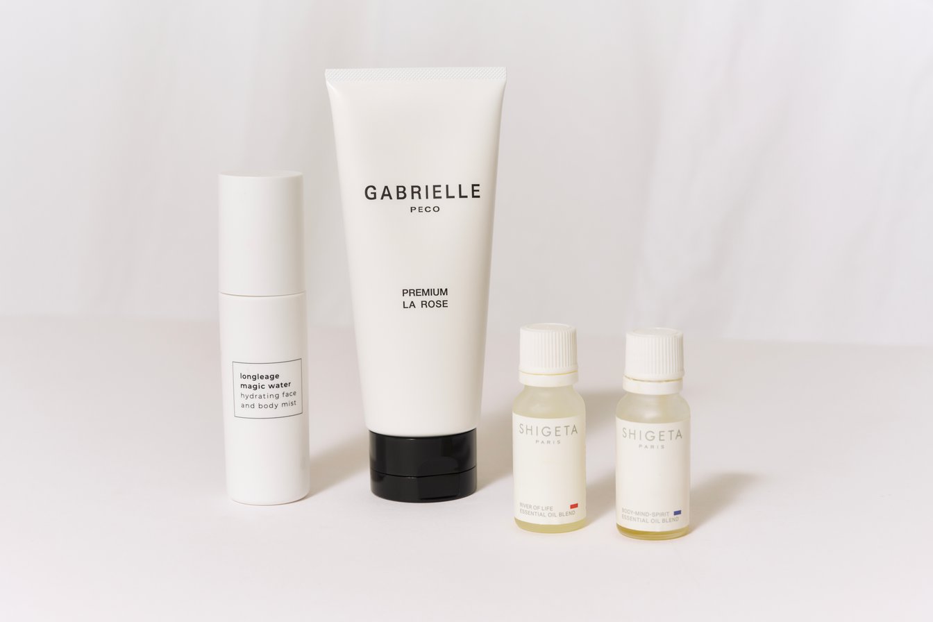 私は敏感肌で皮膚科で処方してもらったものをずっと愛用しているので、それ以外で今の私に欠かせないものたちですね。左から、「ロングルアージュ(LONGLEAGE)」の「マジックウォーター」、「ガブリエルペコ(GABRIELLE PECO)」のバストマッサージクリーム「Premium La Rose」、「シゲタ パリ(SHIGETA PARIS)」の「エッセンシャルオイル」でリバーオブライフとボディー・マインド・スピリットです。