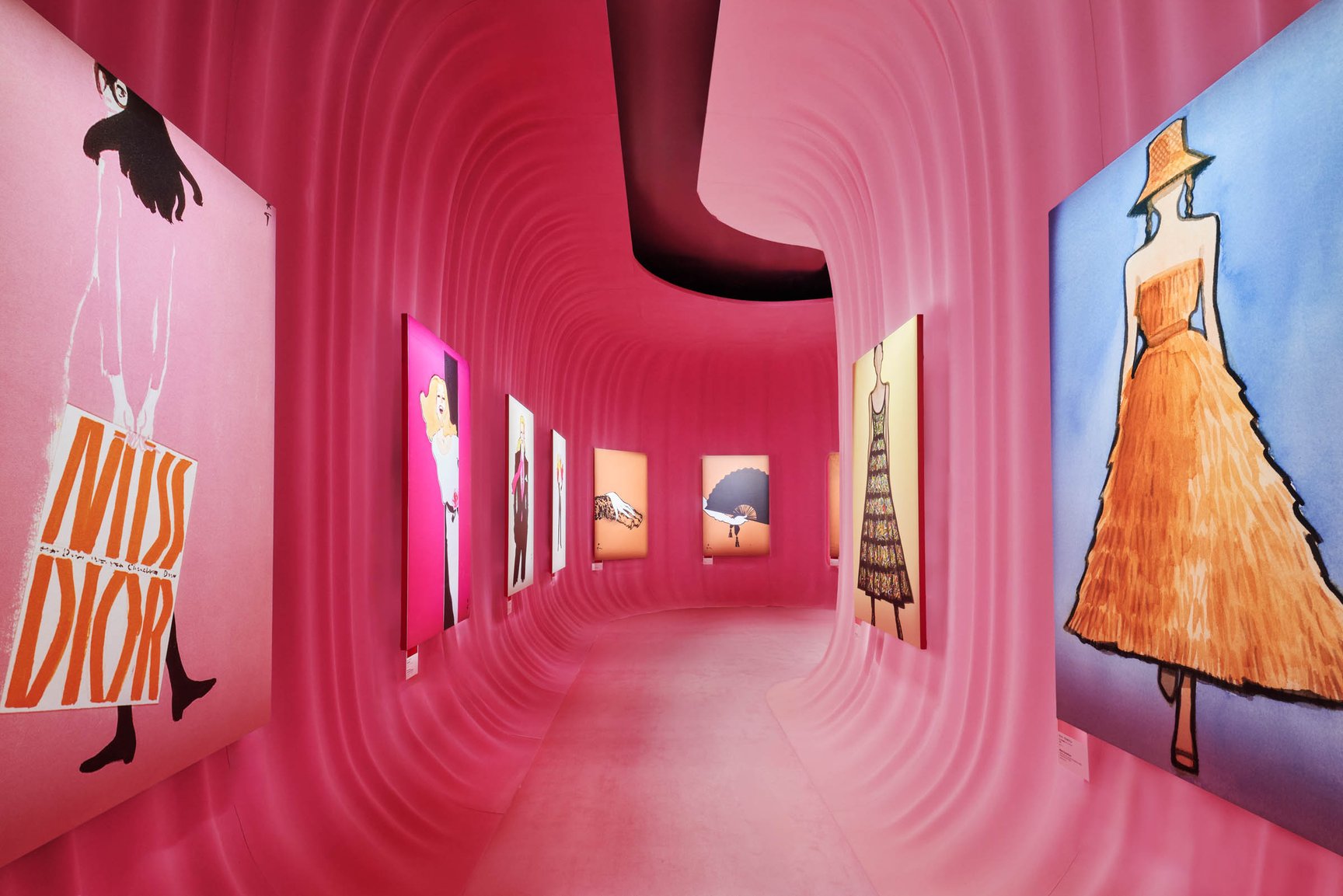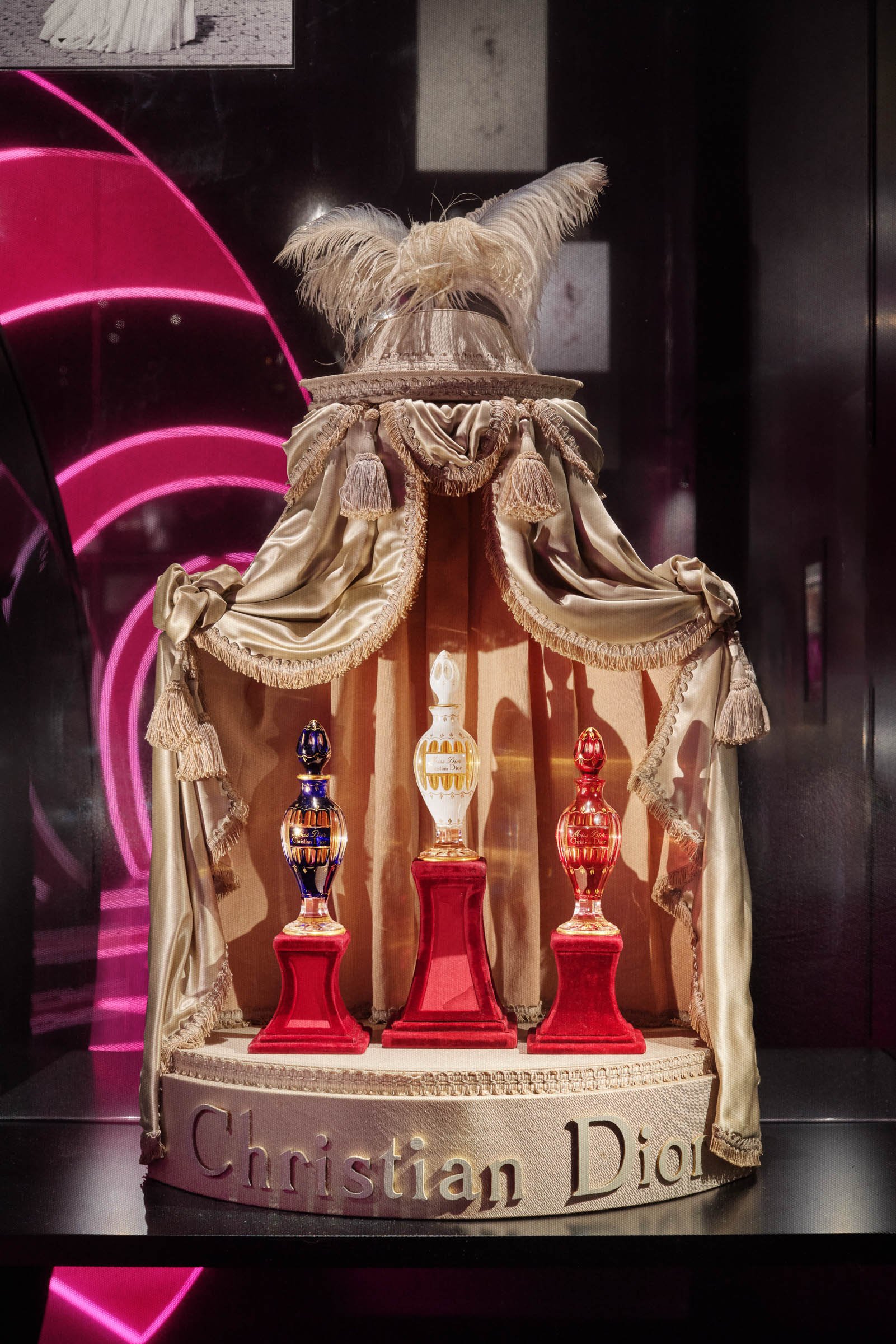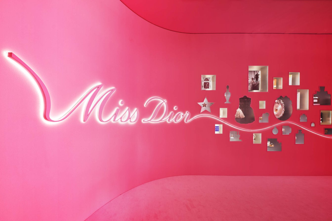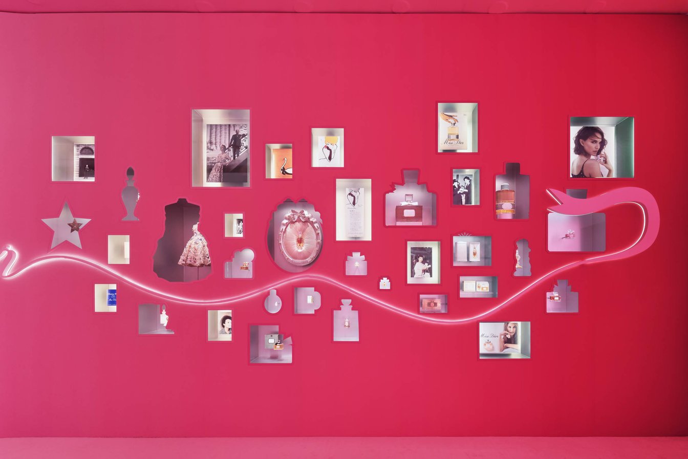 伝説的なミス ディオールのリボンに導かれながら会場へ。鮮やかなピンクの世界の中に飾られているのは、パリの道端でディオールが発見したラッキースターからミス ディオール ミニチュアドレス、パルファン・クリスチャン・ディオールの初版広告、カトリーヌのポートレート。さらにはナタリー・ポートマンのアンバサダー就任後、初の広告キャンペーンイメージ、そしてクルジャンが調香したミス ディオール パルファンまで、歴史を刻んできた象徴的なアイテムたちが出迎えてくれます。