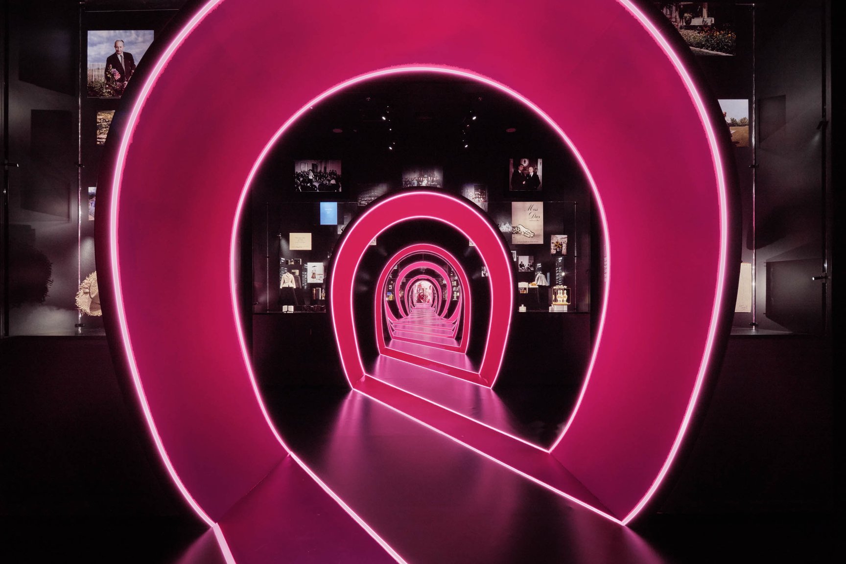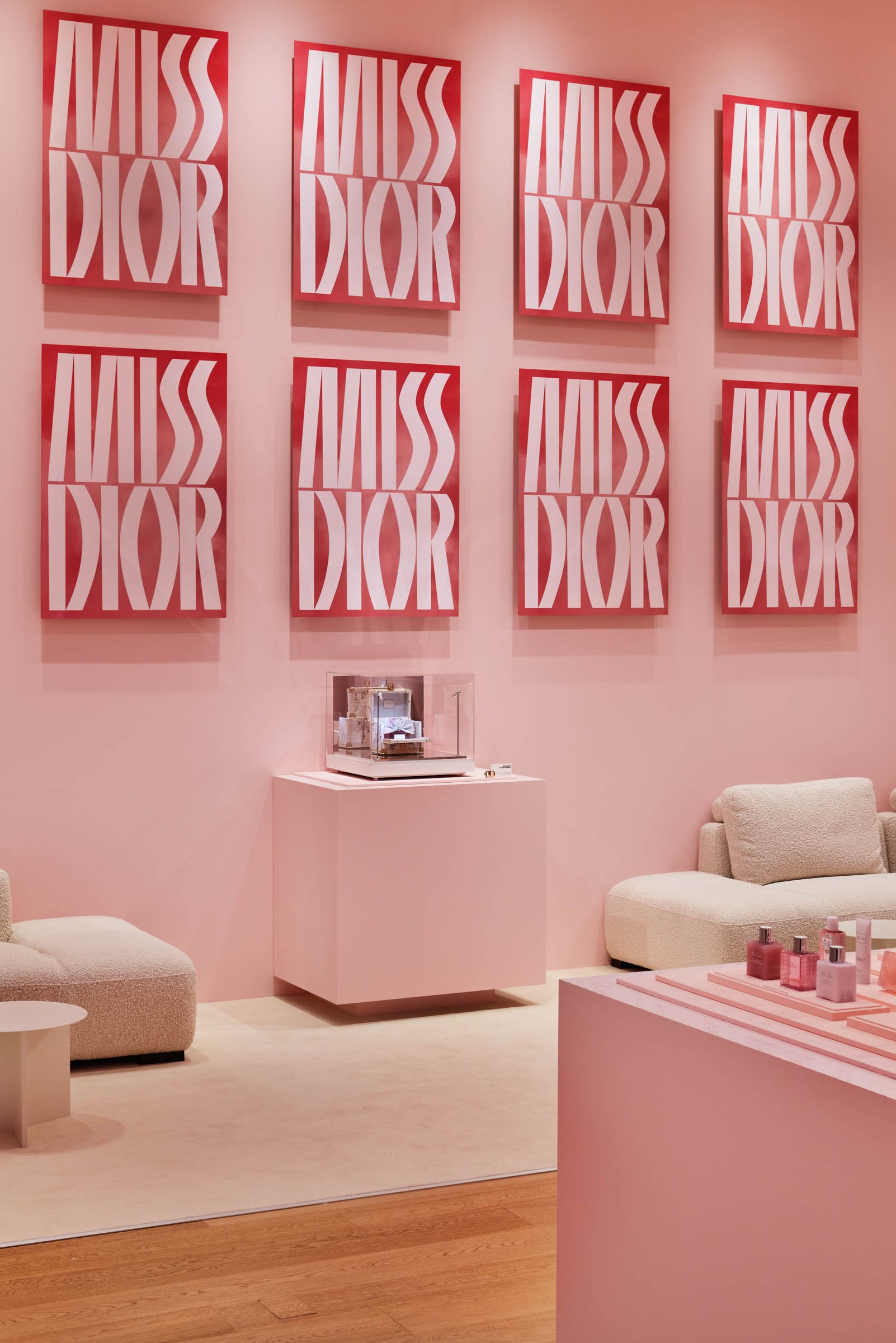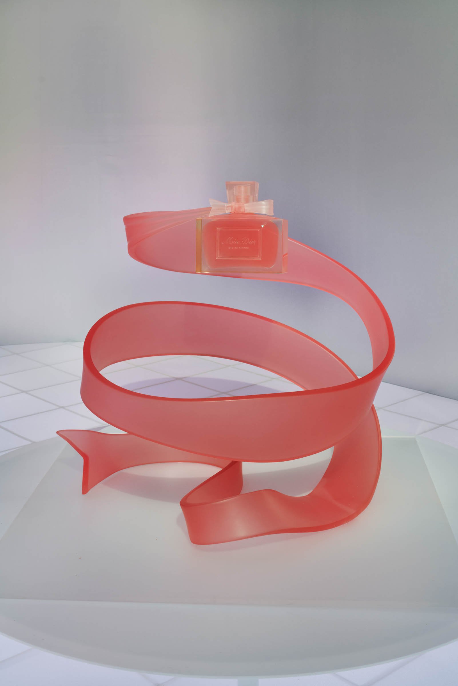 伝説的なミス ディオールのリボンに導かれながら会場へ。鮮やかなピンクの世界の中に飾られているのは、パリの道端でディオールが発見したラッキースターからミス ディオール ミニチュアドレス、パルファン・クリスチャン・ディオールの初版広告、カトリーヌのポートレート。さらにはナタリー・ポートマンのアンバサダー就任後、初の広告キャンペーンイメージ、そしてクルジャンが調香したミス ディオール パルファンまで、歴史を刻んできた象徴的なアイテムたちが出迎えてくれます。