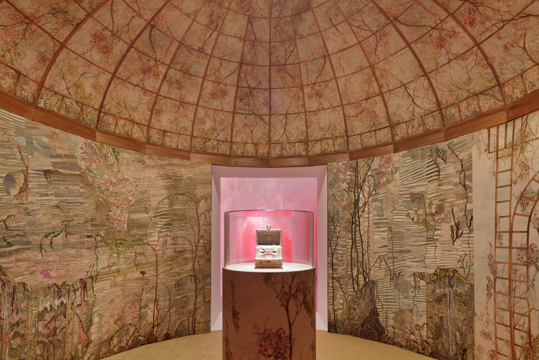 フランス人ヴィジュアルアーティストのエヴァ・ジョスパン(Eva Jospin)によって施された「ミス ディオール パルファン限定エディション」が飾られた部屋へ。天上まで一面に、ムンバイのチャーナキヤ工場で職人たちと女性たちによって編み上げられた繊細な刺しゅうが施されたフローラル ガーデンはまるで鳥籠の中にいるよう。花に囲まれる庭園の世界で時間を忘れるイマーシブな世界へ導いてくれます。