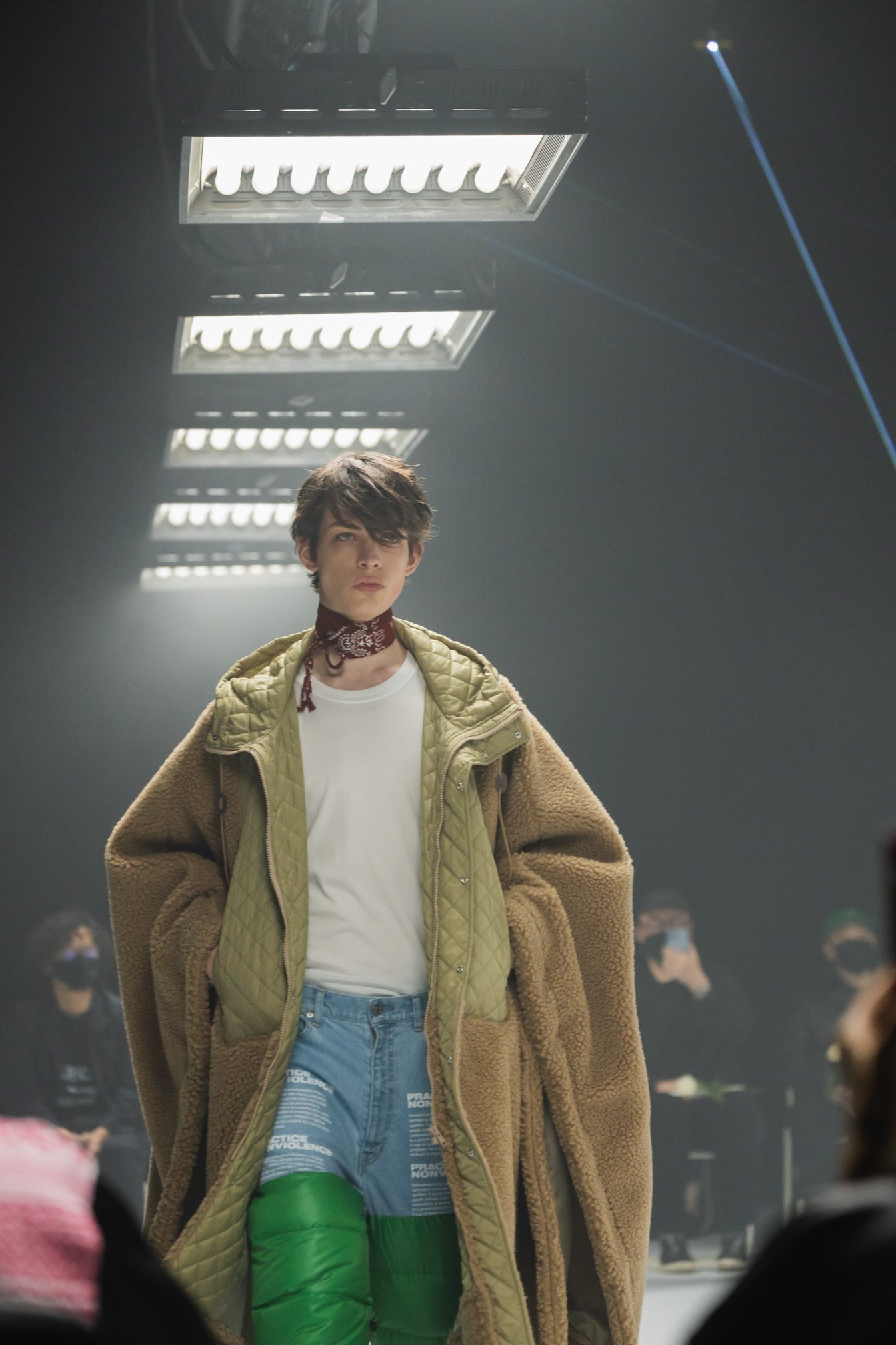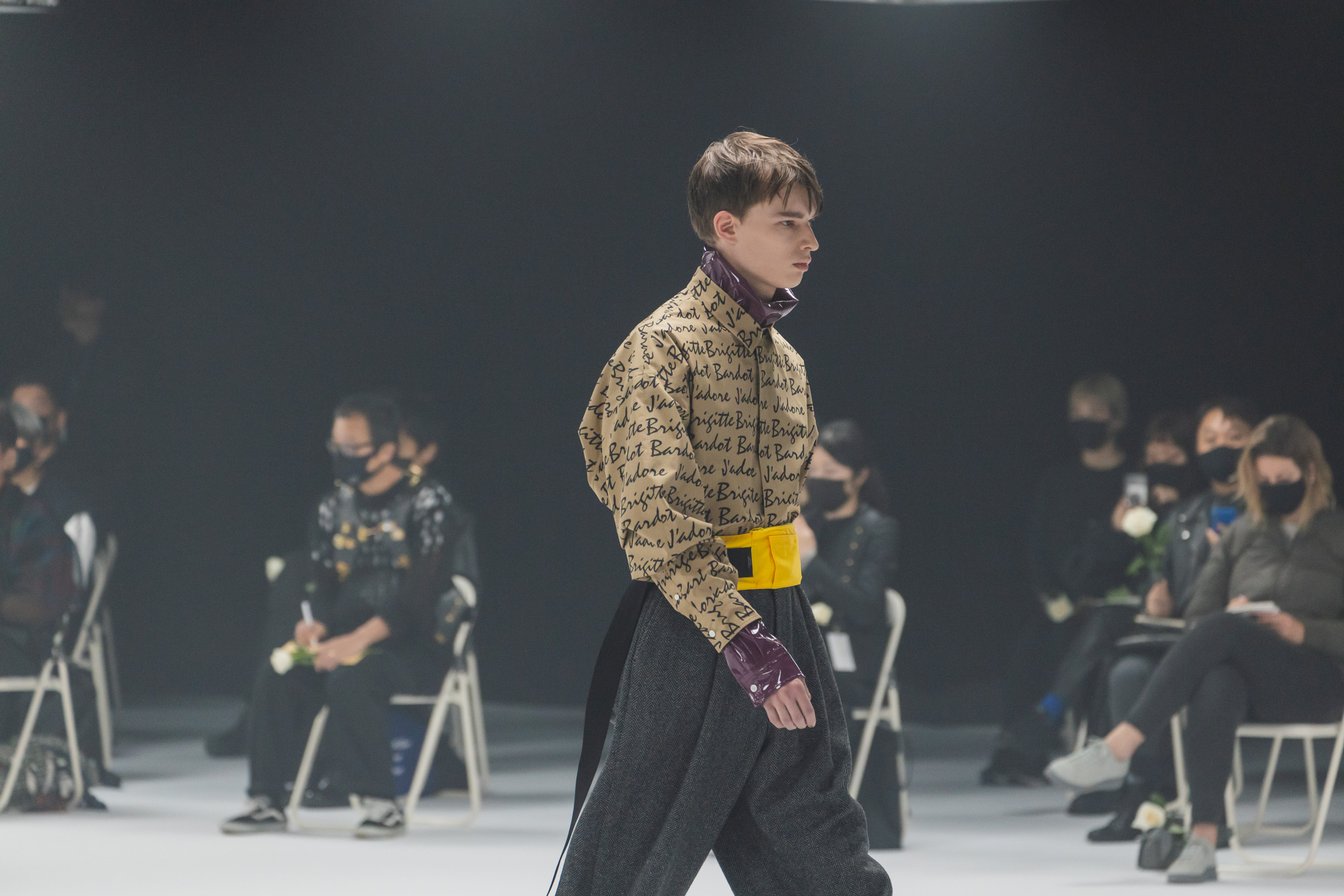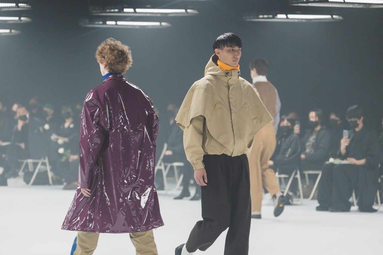 クリーンなレイヤードスタイルの中で際立ったのが、ベージュとパープルの絶妙なカラーリング、そして愛と平和を願う様々なキーワードを落とし込んだグラフィック。ベーシックに一捻り加えながらジャンルをミックスするミスター・ジェントルマンならではのバランスで、ボリュームとディテールで遊ぶ自由なスタイルが提案された。