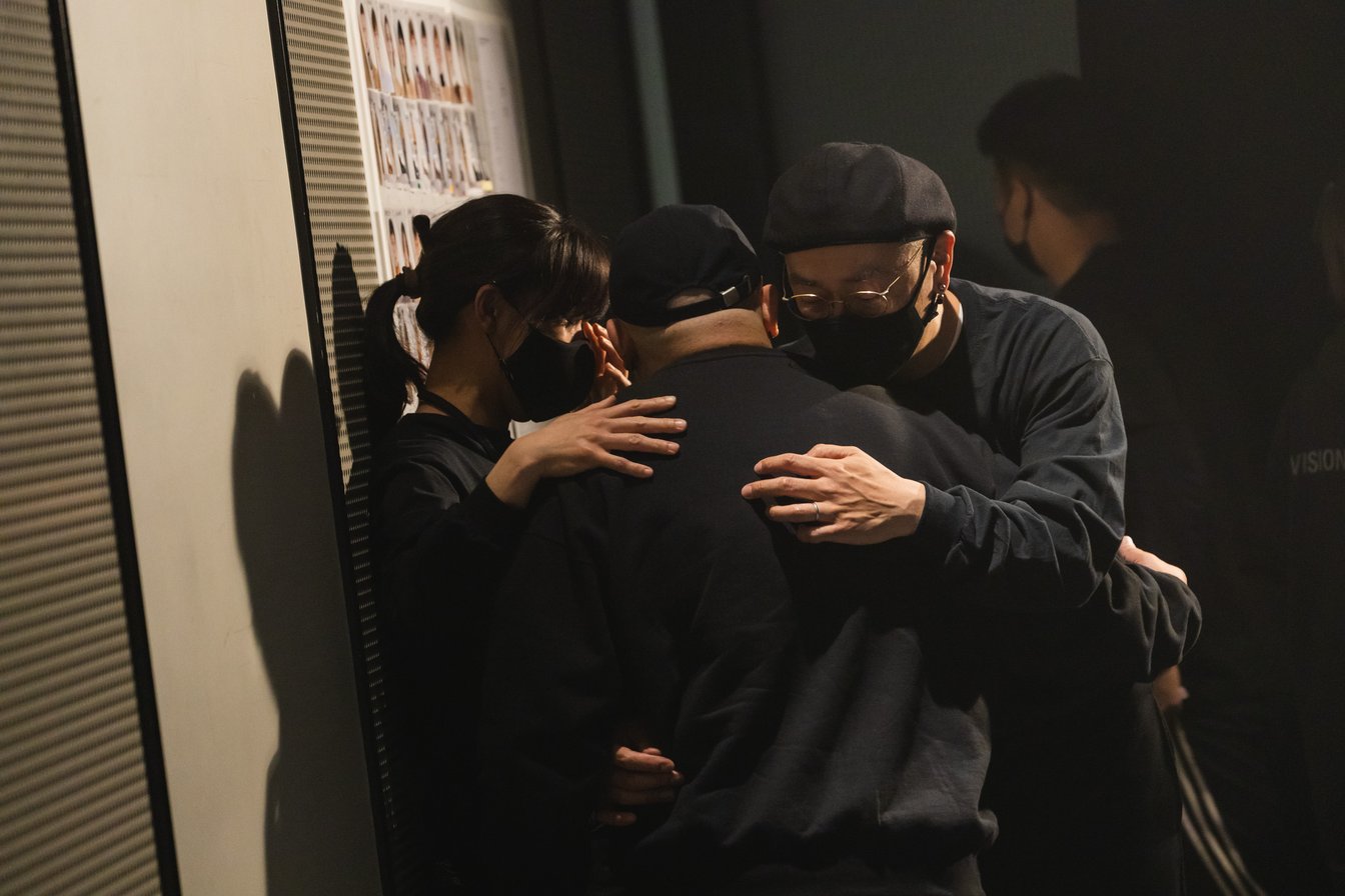 再びバックステージへ。メイクを担当した津田雅世氏とヘアの宇津木剛氏、そしてショーを作り上げたスタッフらが、こみ上げる想いを胸に吉井氏を温かく迎え入れる。