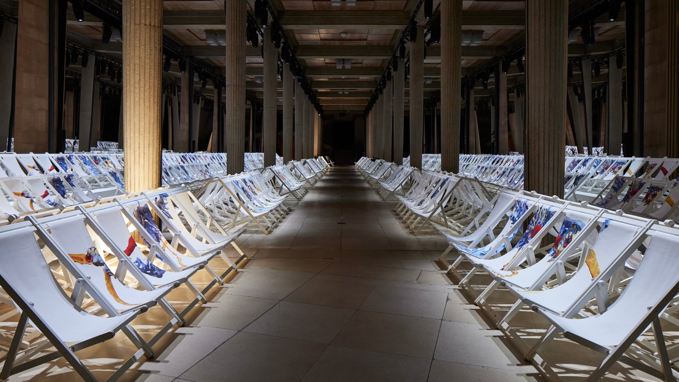 会場となったのはパリのPalais d’Iéna(イエナ宮)。空間デザインを手がけたのは、Rem Koolhaas(レム・コールハース)率いるOMAの研究機関であるAMOだ。会場には、冬には不釣り合いなデッキチェアが置かれている。季節に合わないパラドックス(逆説)の仕掛けはセットだけではなく、「冬に着る半袖やミニスカート」といったアイデアにも取り入れられていた。