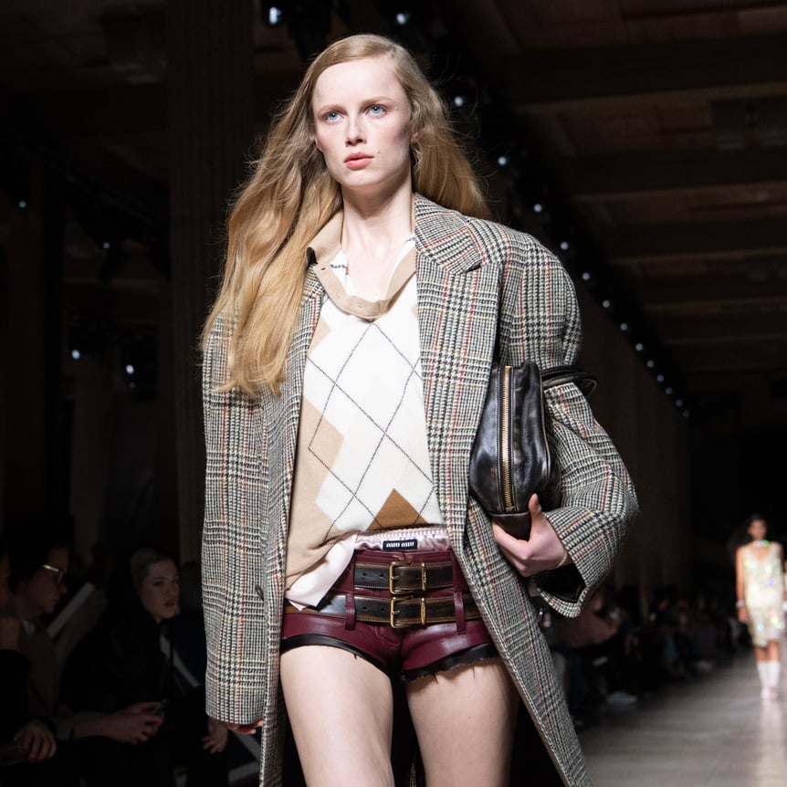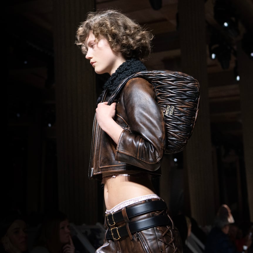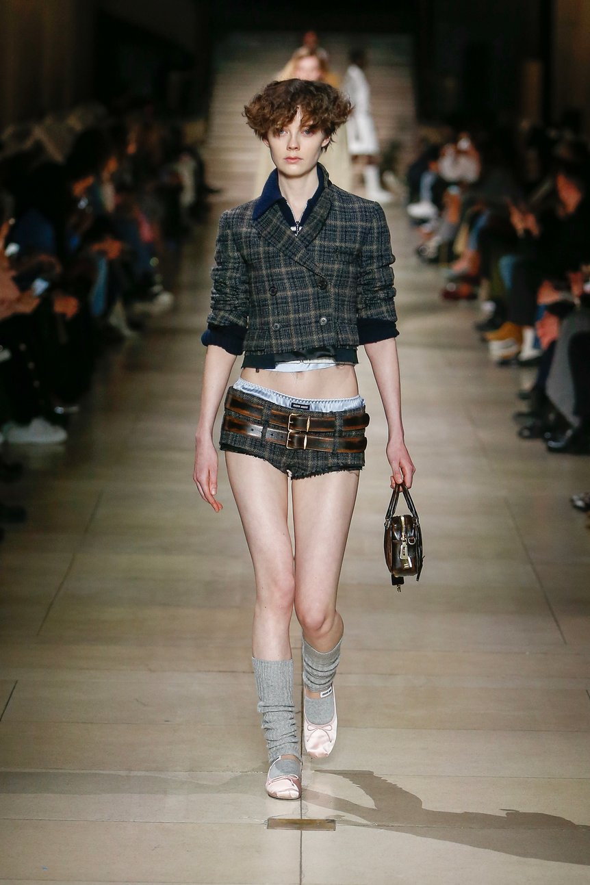 しかしもちろん、ミュウミュウのガーリーは「可愛さ」と同義ではない。チェックのツイードジャケットや、アップサイクルレザーを取り入れたバイカージャケットなどはクラシックで硬派なムードをまとっている。レザーのベルテッドブーツも無骨な印象で、少女たちの強さと賢さを引き立てていた。