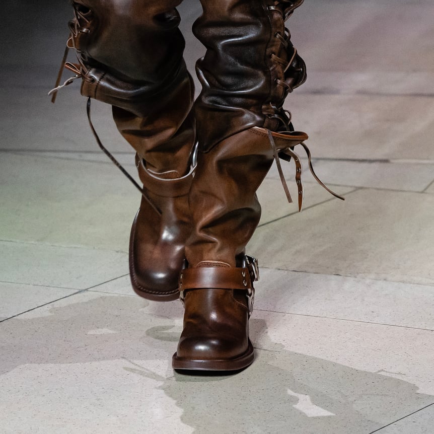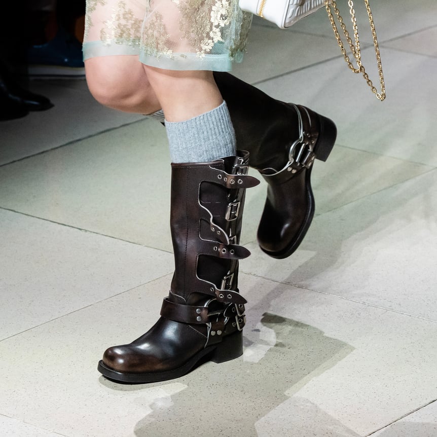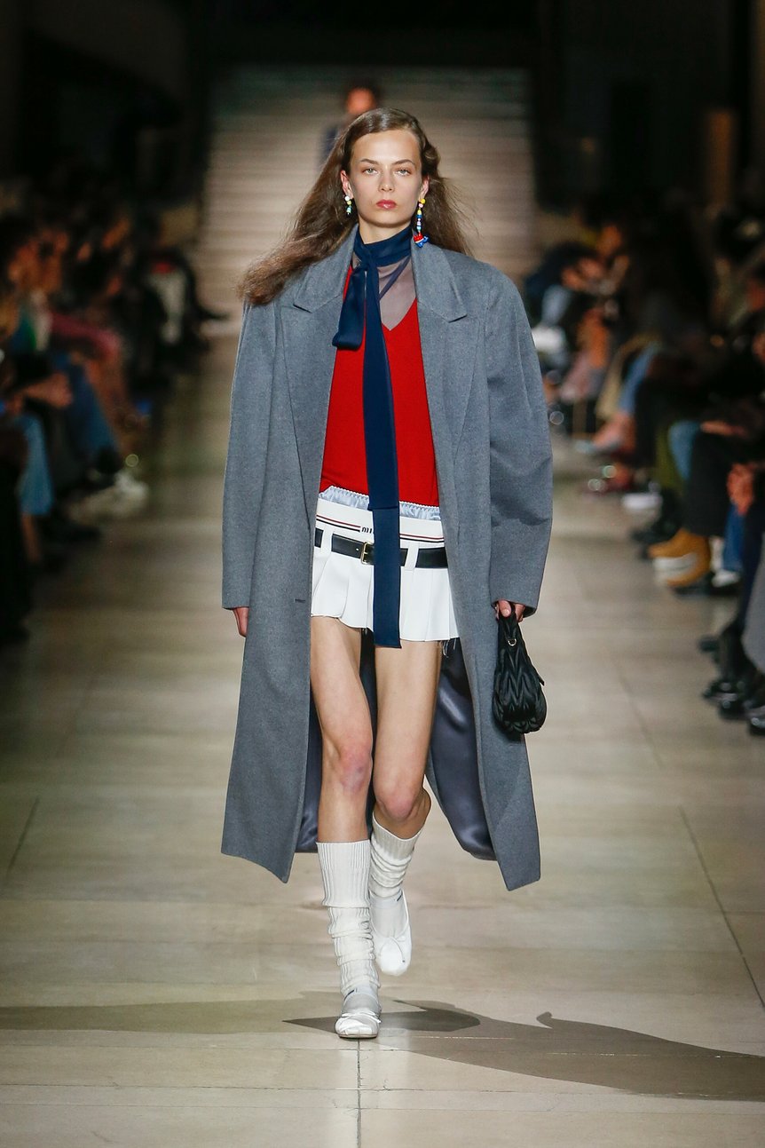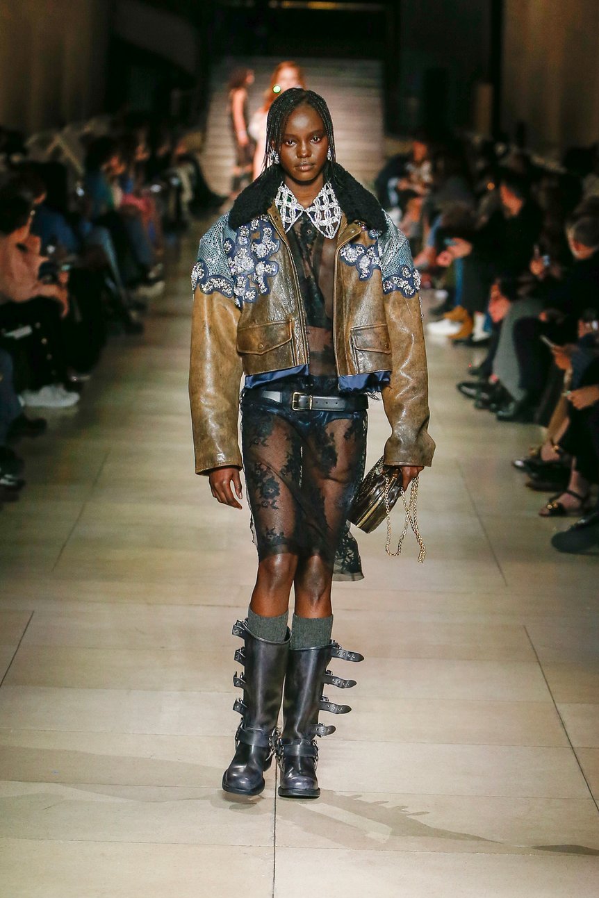 しかしもちろん、ミュウミュウのガーリーは「可愛さ」と同義ではない。チェックのツイードジャケットや、アップサイクルレザーを取り入れたバイカージャケットなどはクラシックで硬派なムードをまとっている。レザーのベルテッドブーツも無骨な印象で、少女たちの強さと賢さを引き立てていた。