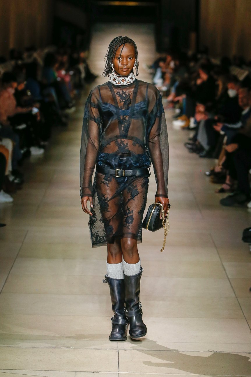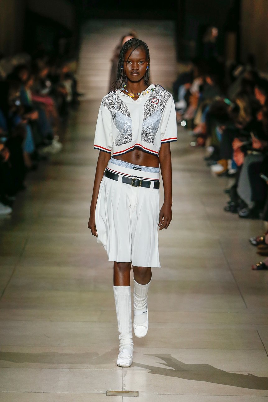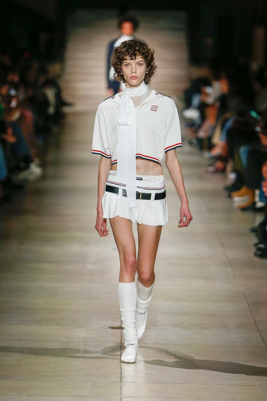 テニスの要素を取り入れたマイクロミニのプリーツスカートやルーズソックス、アーガイルニットを合わせたスタイリングは、日本のギャル文化を彷彿とさせる。また、先シーズンから継続するクロップトトップ&ローライズの組み合わせは、シルキーなランジェリーをちらりと見せるコケティッシュなスタイルに。