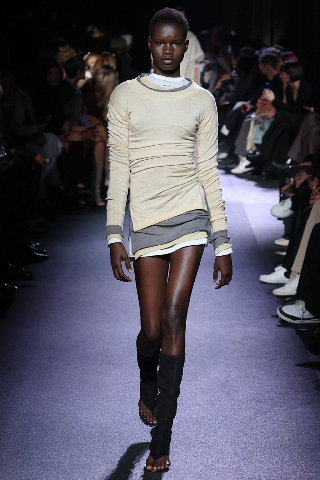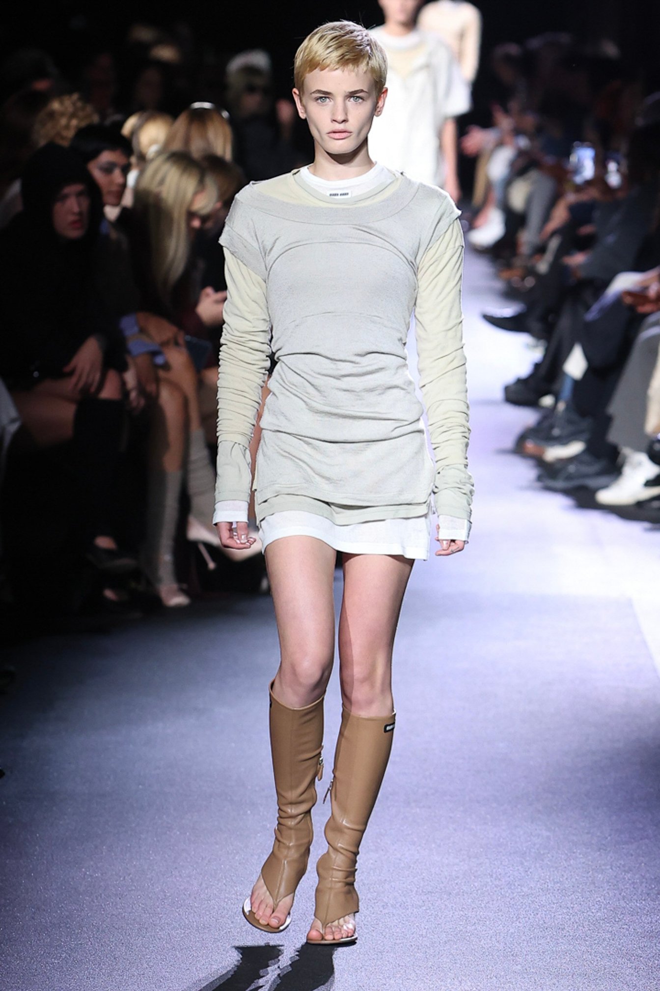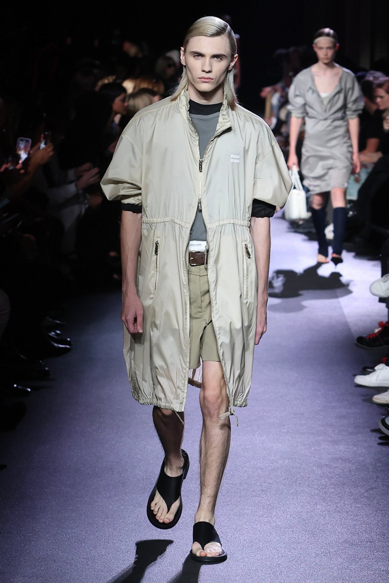 ショーの序盤は、ぴったりとしたシルエットのカットソーのレイヤードスタイル。ライトグレーやライトベージュなどのニュアンスカラーのトップスが弛みが出るように重ねられ、首元のブランドタグがポイントに。アウトドアウェアやスポーツウェアを彷彿とさせる軽やかなナイロンジャケットやコート、ドレスなどがキーアイテムとなった。前シーズンに引き続き性別を問わないモデルのキャスティングで、自然にジェンダーを超越していく。