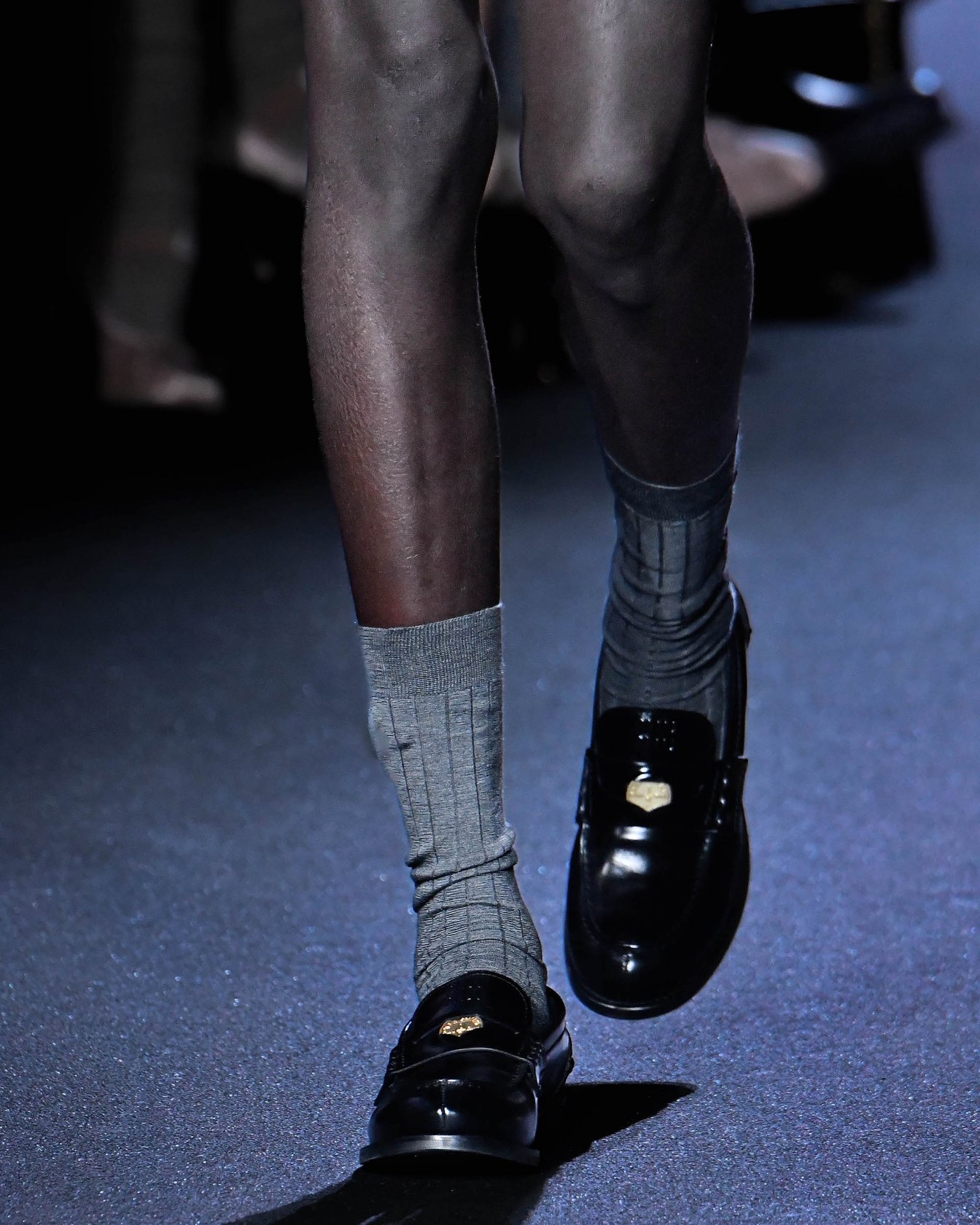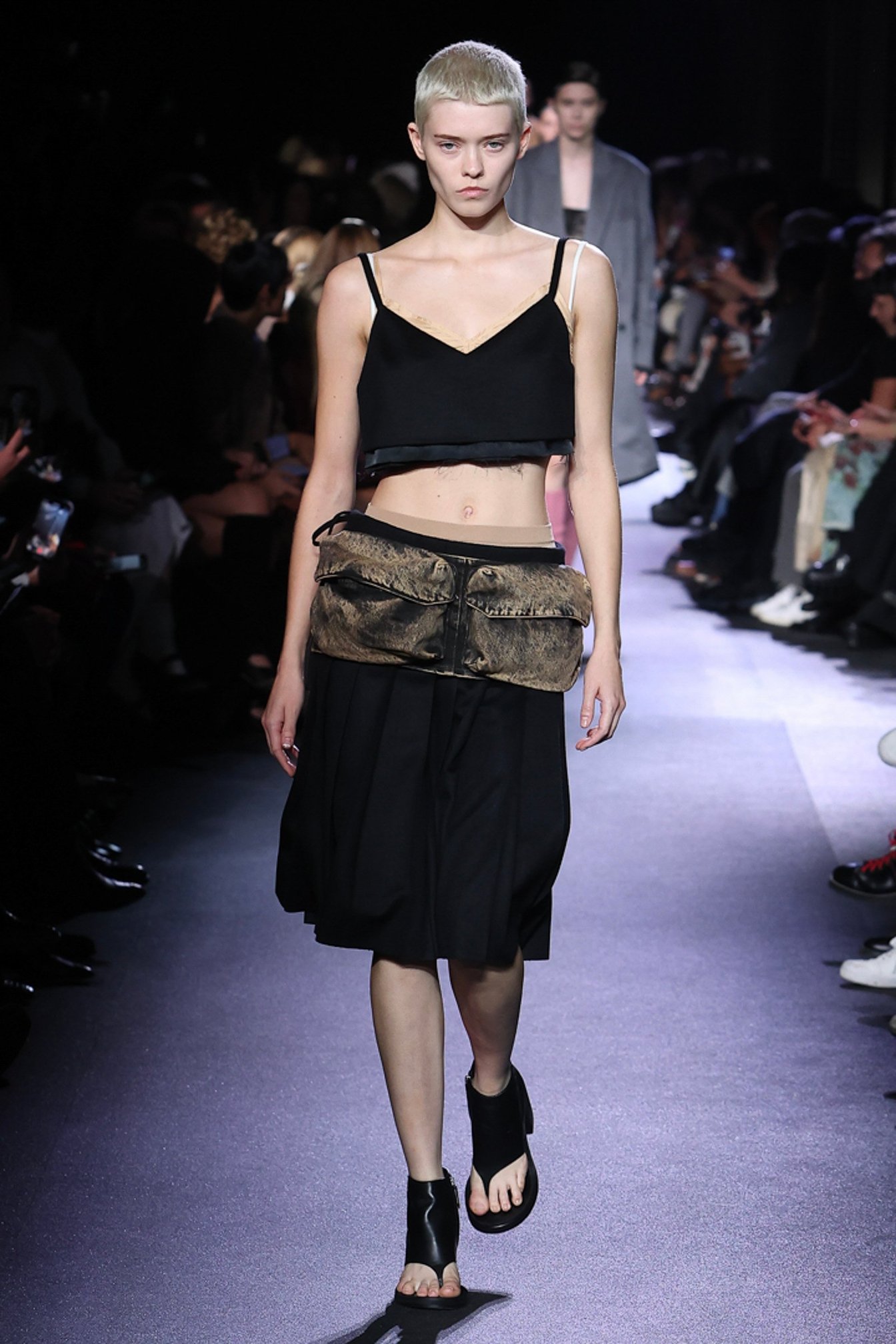 シルエットについても、ミュウミュウが打ち出してきたトレンドスタイルを継続。ローライズのボトムスやマクロミニスカートからショーツを覗かせるコーディネート、またお腹を大胆に見せるクロップドトップなどが、新たなアレンジで提案された。