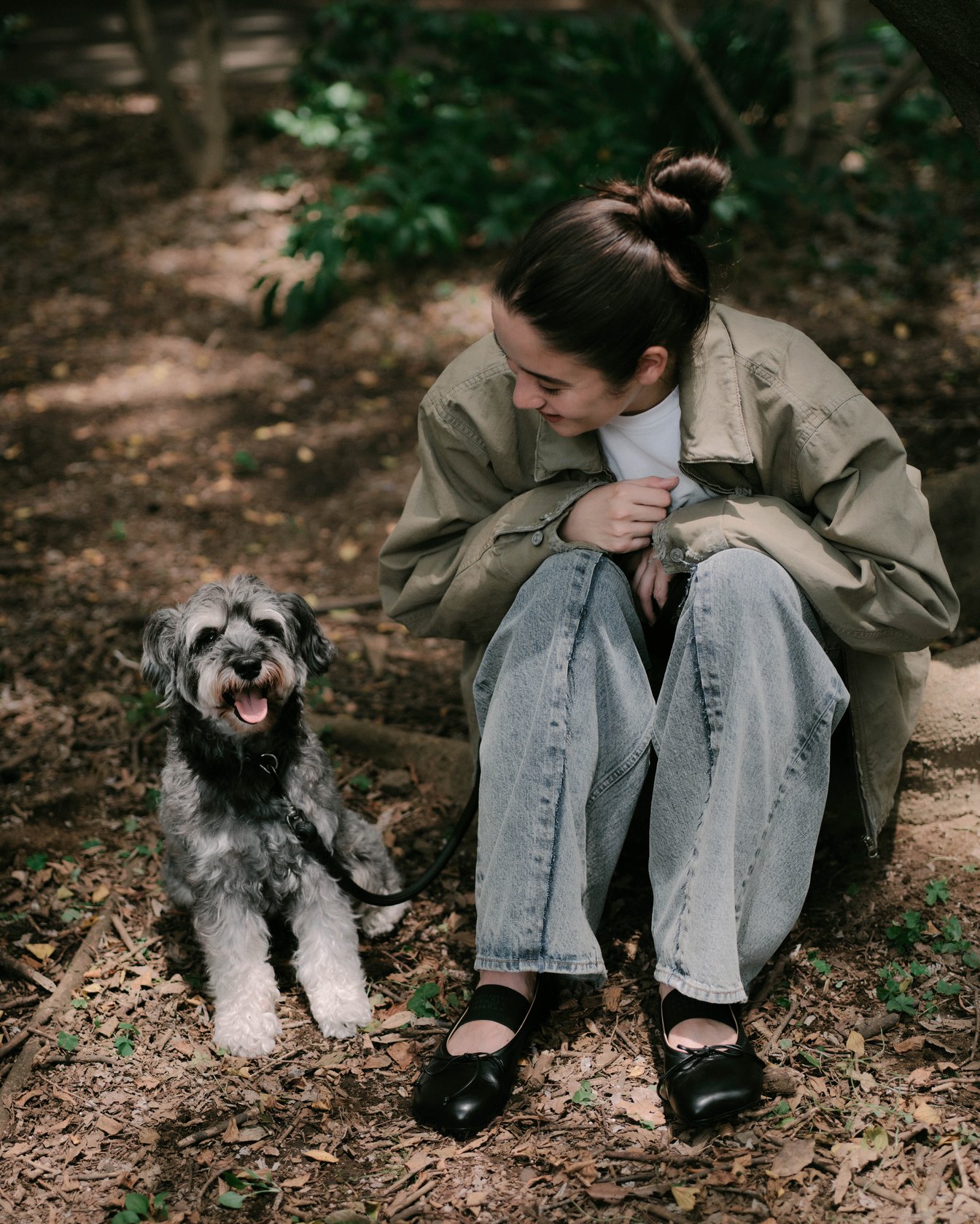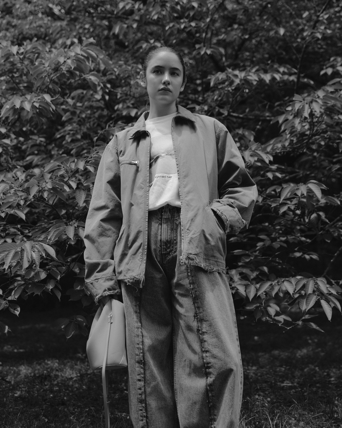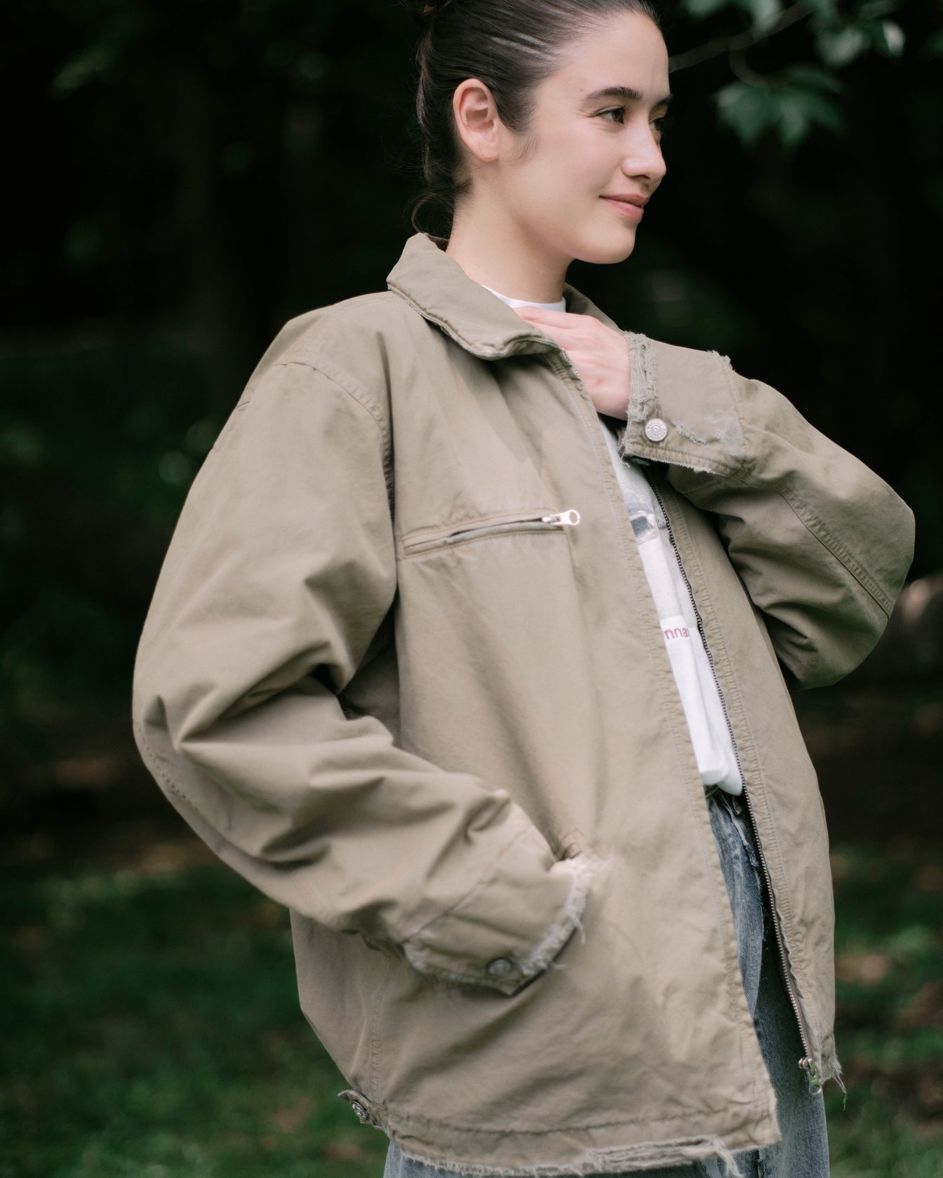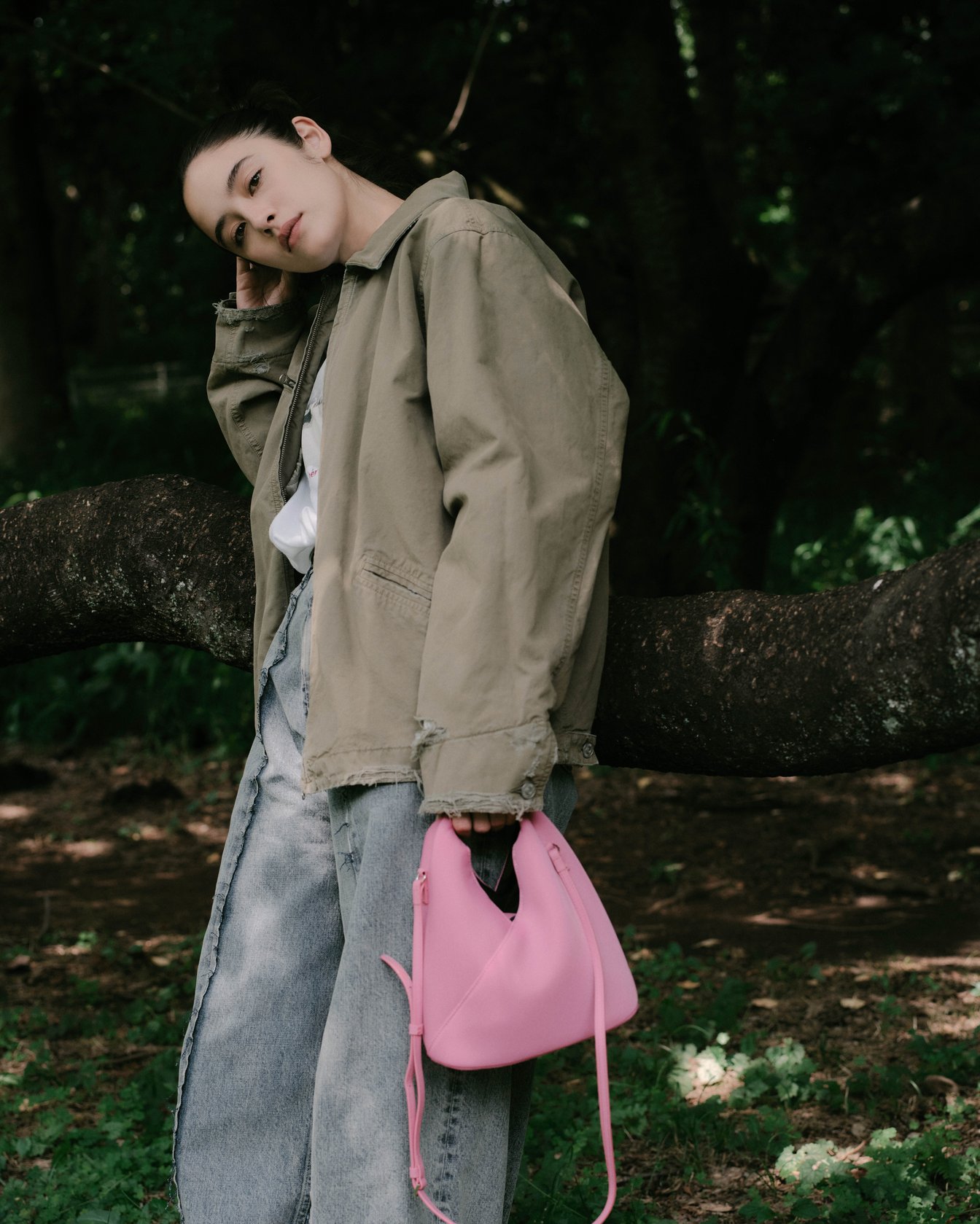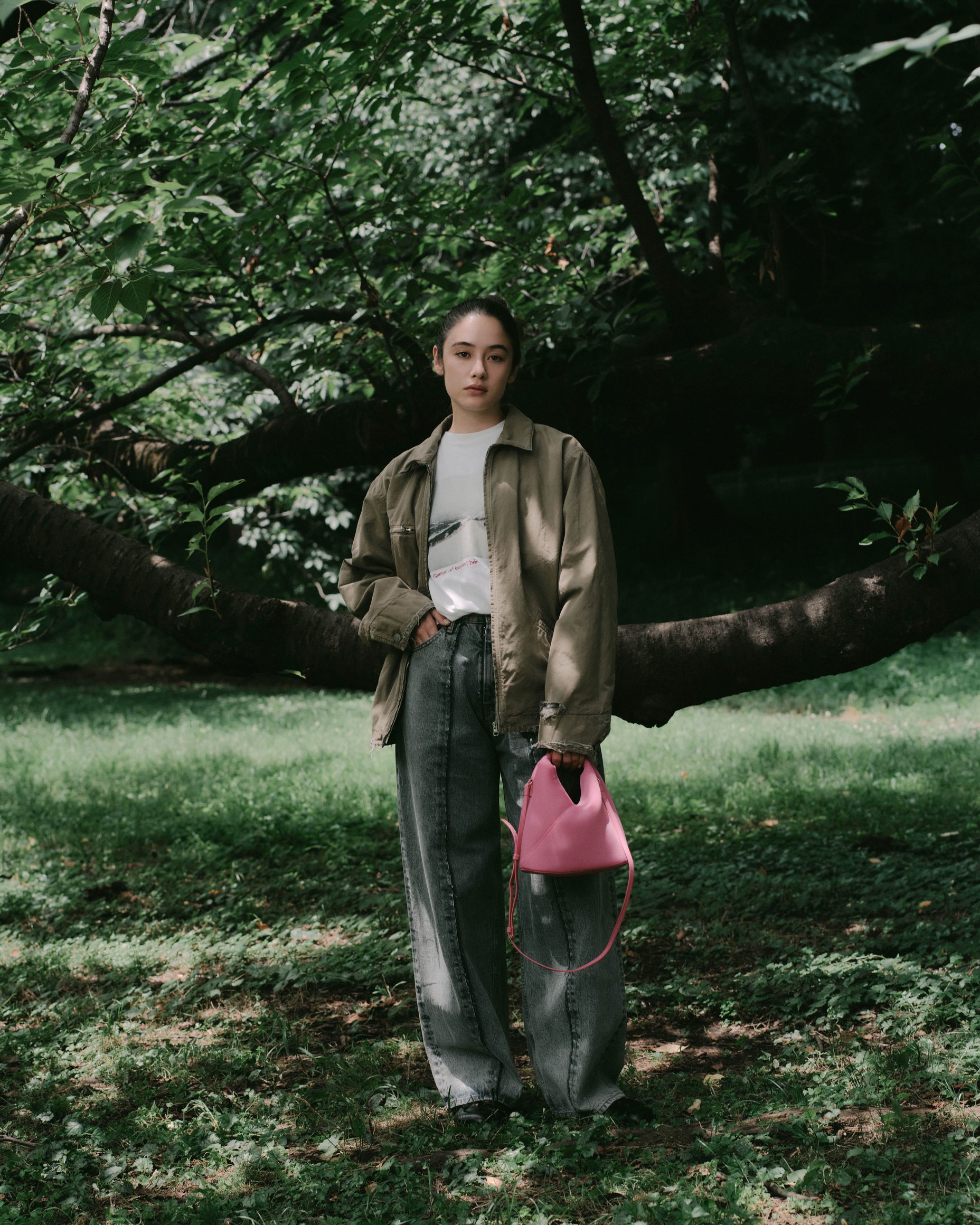 公園で愛犬の散歩をしていたのは琉花。これまで30ヶ国を旅しており、「旅は人生の一部。服は旅に持っていけるものを選ぶ。アウトドアが多いので、動きやすさを重視することが多い」と語る。ブランドの設立以来、MM6を愛用しているという彼女がまとうのは、ダメージ加工のコットンキャンバスジャケット。ボリュームシルエットのデニムは、切り離した生地を縫い合わせたフロントデザインがポイントで、ベーシックな組み合わせの中にも新しさを感じさせる。「MM6の服はどこかエッジが効いていて、シンプルになりすぎないところが好き」。アクセントにピンクの「ジャパニーズ」クロスボディバッグを加え、足下にはエラスティックバンド付きのバレエシューズで甘さをプラスした。琉花が次の旅先として考えているのはモンゴルと、南米ボリビアのウユニ塩湖。その行動力と好奇心が、彼女のクリエイションを支えている。