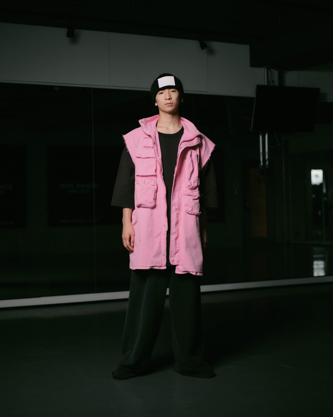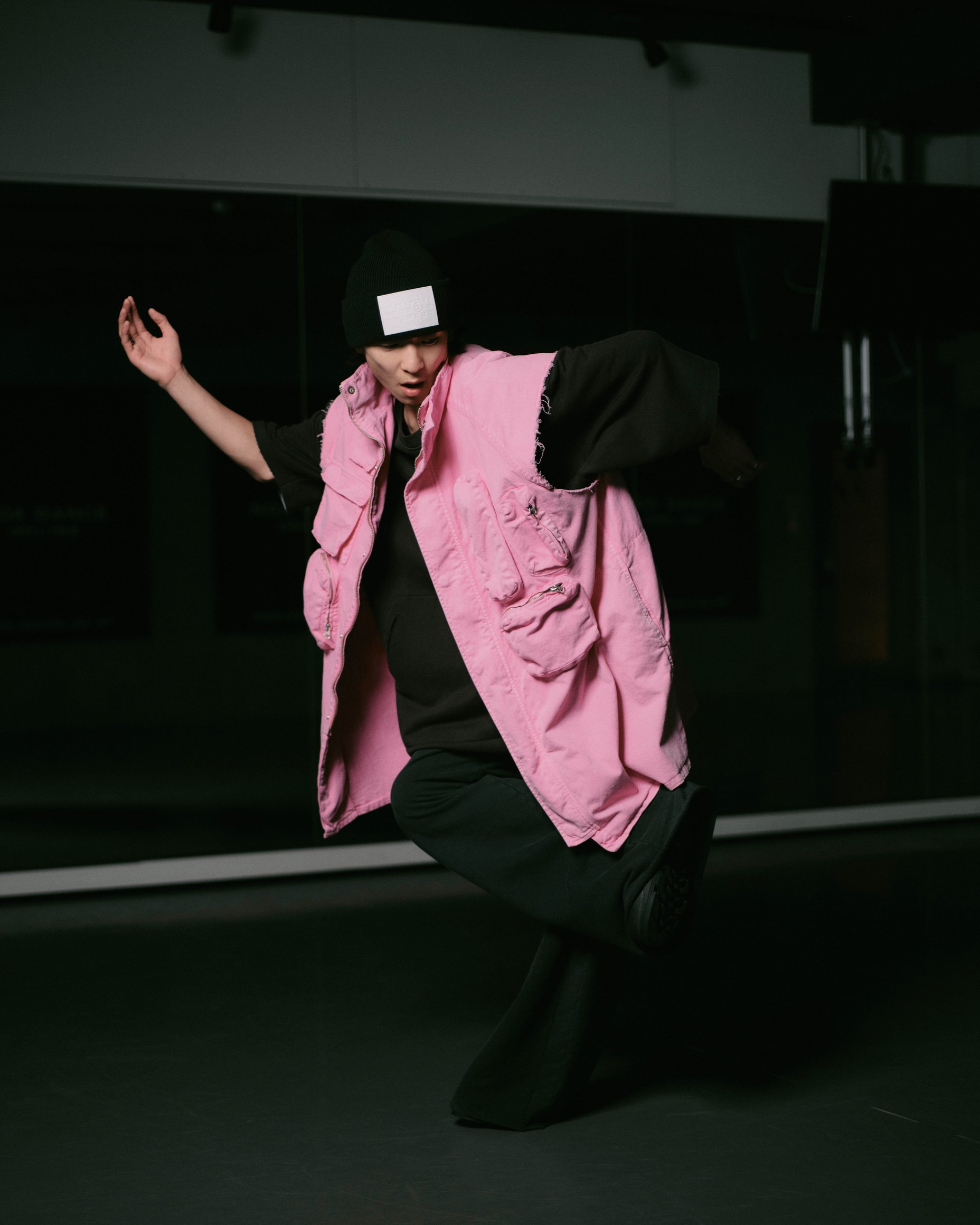 新宿のダンススタジオでリハーサルしていたのは、THE D Soraki。ジレとして着用しているのは、ワークウェアの機能を誇張し、ポケットをアシンメトリーに配置したスリーブレスドレス。タグに「WAYS TO WEAR IT」の文字が記されているように、MM6の服は型にはまらない自由な着方が可能。ボトムには、踊りの妨げにならないジャージー素材のワイドレッグパンツをチョイスした。「色のある服が好き」というSoraKiのダンス歴は17年。世界王者となった今は国内外を飛び回り、躍動感あふれるパフォーマンスで人々を魅了している。「辛い時期も音楽とダンスがあったから生きられた。踊ることは、ライフスタイルそのもの。毎日服を着る感覚と同じ。他人にかっこ悪いと言われても関係ない、自分がかっこいいと思っていればかっこいい」。そのブレない精神が、唯一無二の個性を築き上げる。
