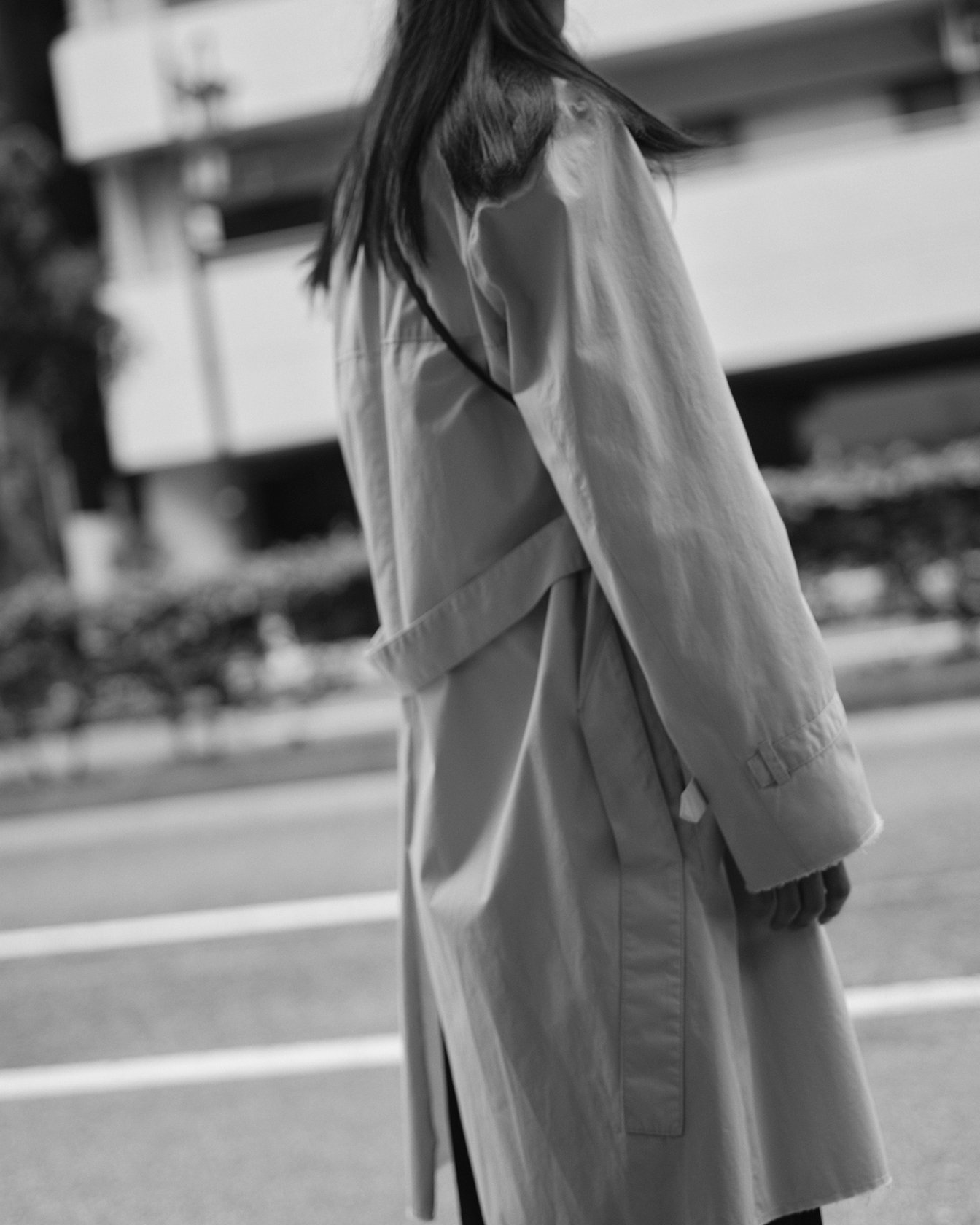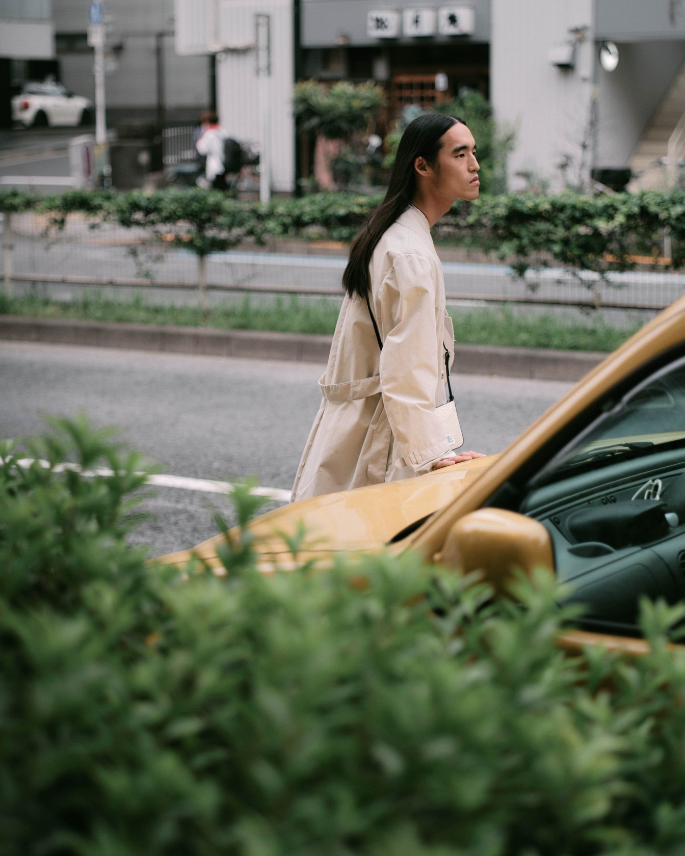 恵比寿の写真屋に向かう服部恭平をスナップ。被写体と撮影の両方を忙しくこなす日々だが「生まれ持った容姿を活かして表現するのがモデル。写真はツールを選択しながら表現できるから自由度は高い。ただ自分がどう生きて、何を見て、何を感じたかを表現する意味では同じ」と語る。この日着ていたのは、襟やポケットをあえて縫い付けて機能性を排除し、デザインへと昇華させたトレンチコート。中に着たシャツもトロンプルイユ(騙し絵)の襟が印象的だ。「MM6の服はシンプルで普遍的だけど、遊び心がある。ファッションにはそういうセンスが大事だと思う。僕は今33歳で、年齢を重ねるごとにそういう服が着たいという気持ちが強くなった」。モデルを目指して上京した頃から憧れていた恵比寿のMM6ストアは「行くたびに静かな高揚感を味わえる場所」だという。そう語る彼自身の佇まいからも内なる情熱が感じられた。