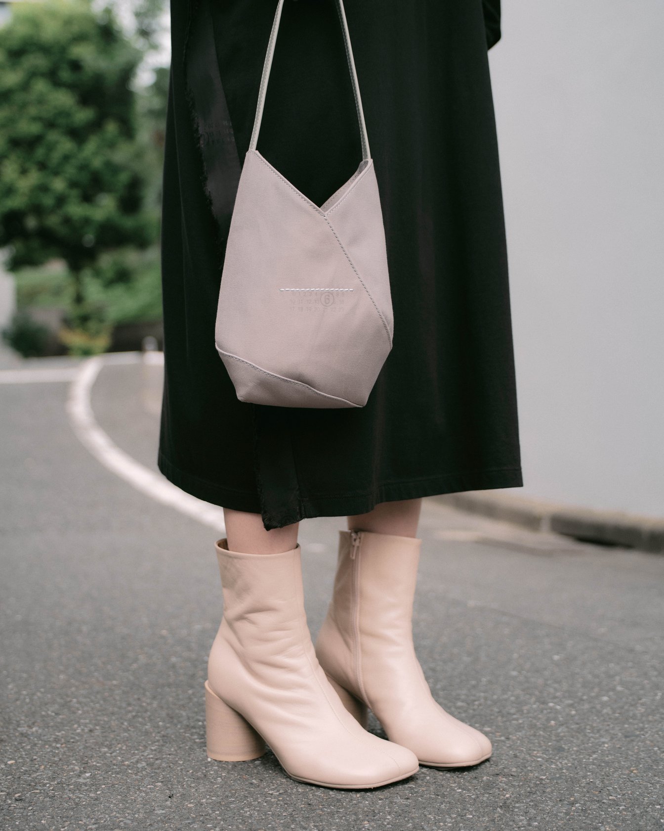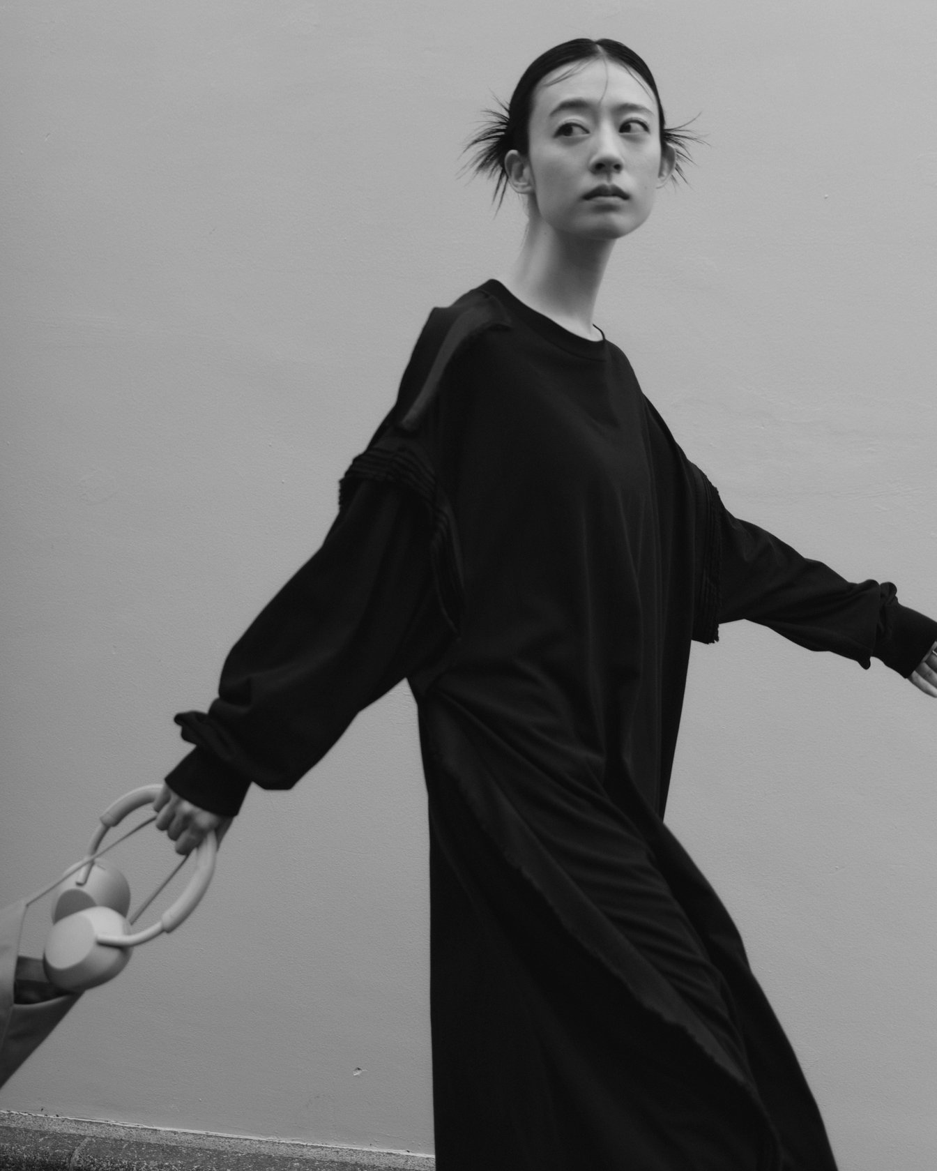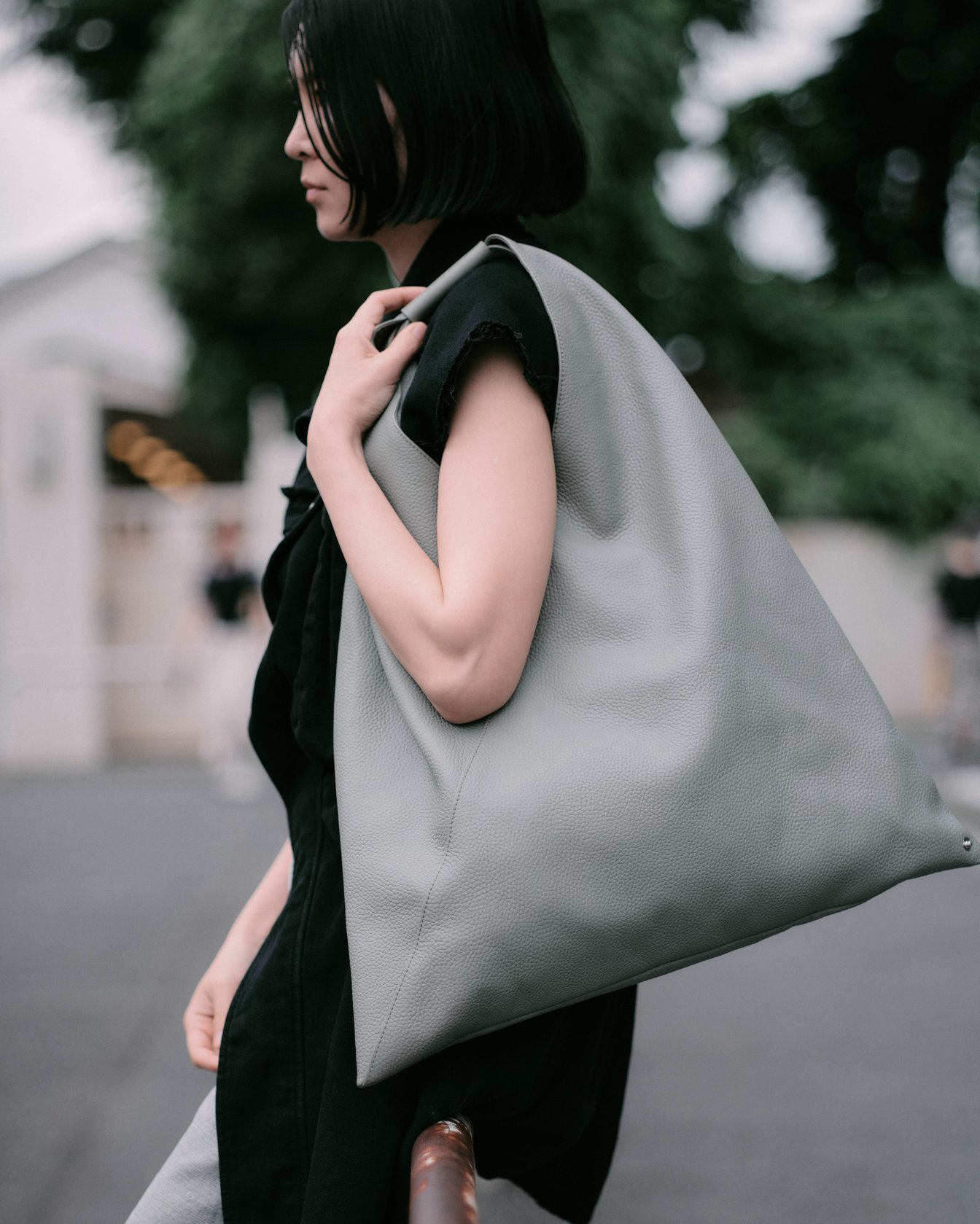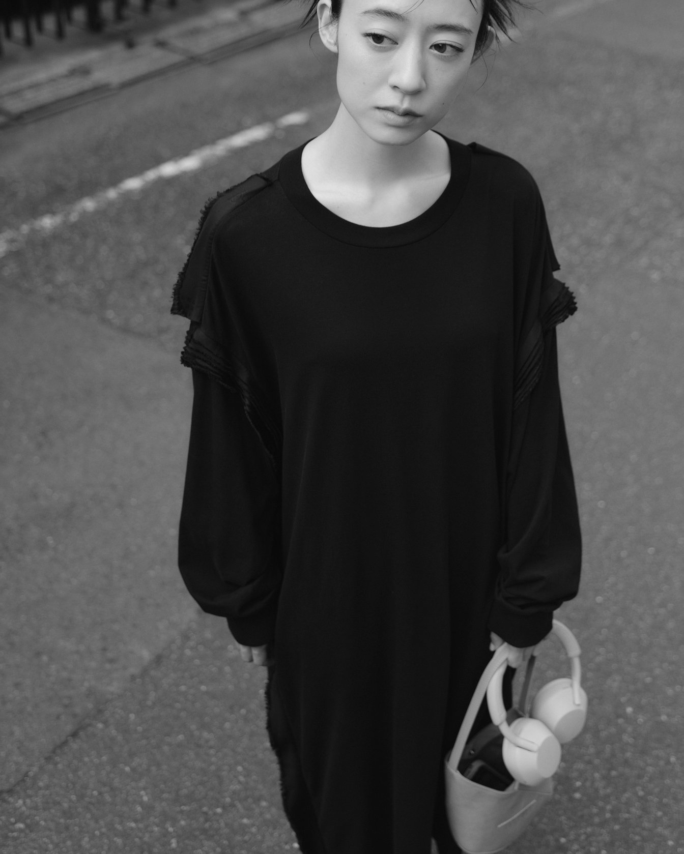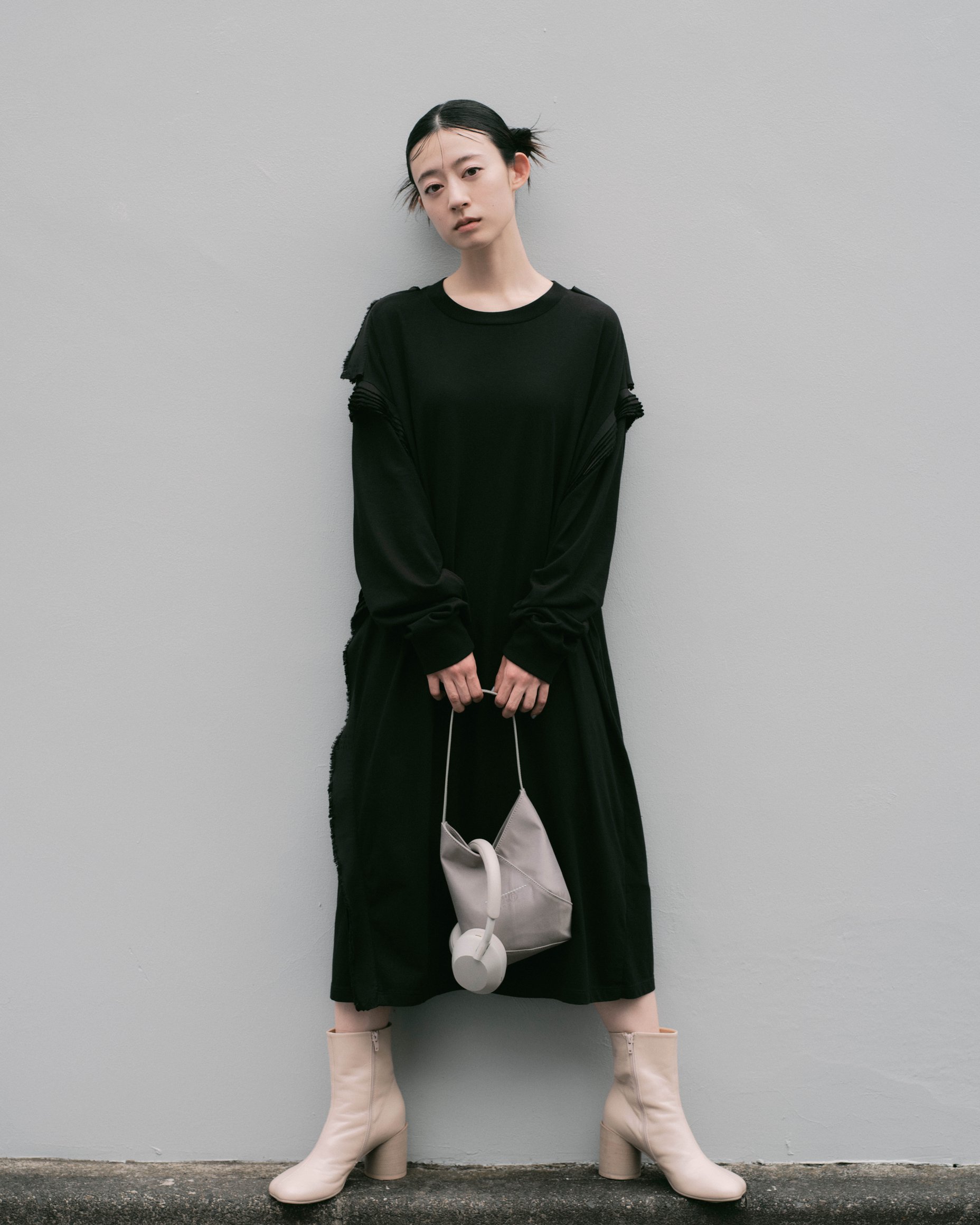 原宿でキャッチしたのは、オルタナティブ・ロックバンド「羊文学」のボーカル・ギター 塩塚モエカ。この日着用していたドロップショルダーのドレスは、MM6ならではのギミックが効いたデザイン。本来、ライニングに使われるビスコース素材が、装飾としてショルダーのシーム部分に重ねられている。手にしているのは、小ぶりながら存在感を放つ「ジャパニーズ」バッグの新シェイプ 。同系色のブルートゥースヘッドホンを首に掛け、音楽とともに街を歩く。「下北沢でライブをやっていた頃は“バンドマンらしくない服を着る”ということを意識したりもした。ロック=泥臭いと敬遠されず、いろいろな人に見てほしかったから。今は力強いメッセージと結び付けたくて、ステージでは黒の衣装を着ることが多い。MM6の黒には、しなやかさやイノセントさを感じる。着る人の内なる強さや美しさを引き出してくれるような服だと思う」。