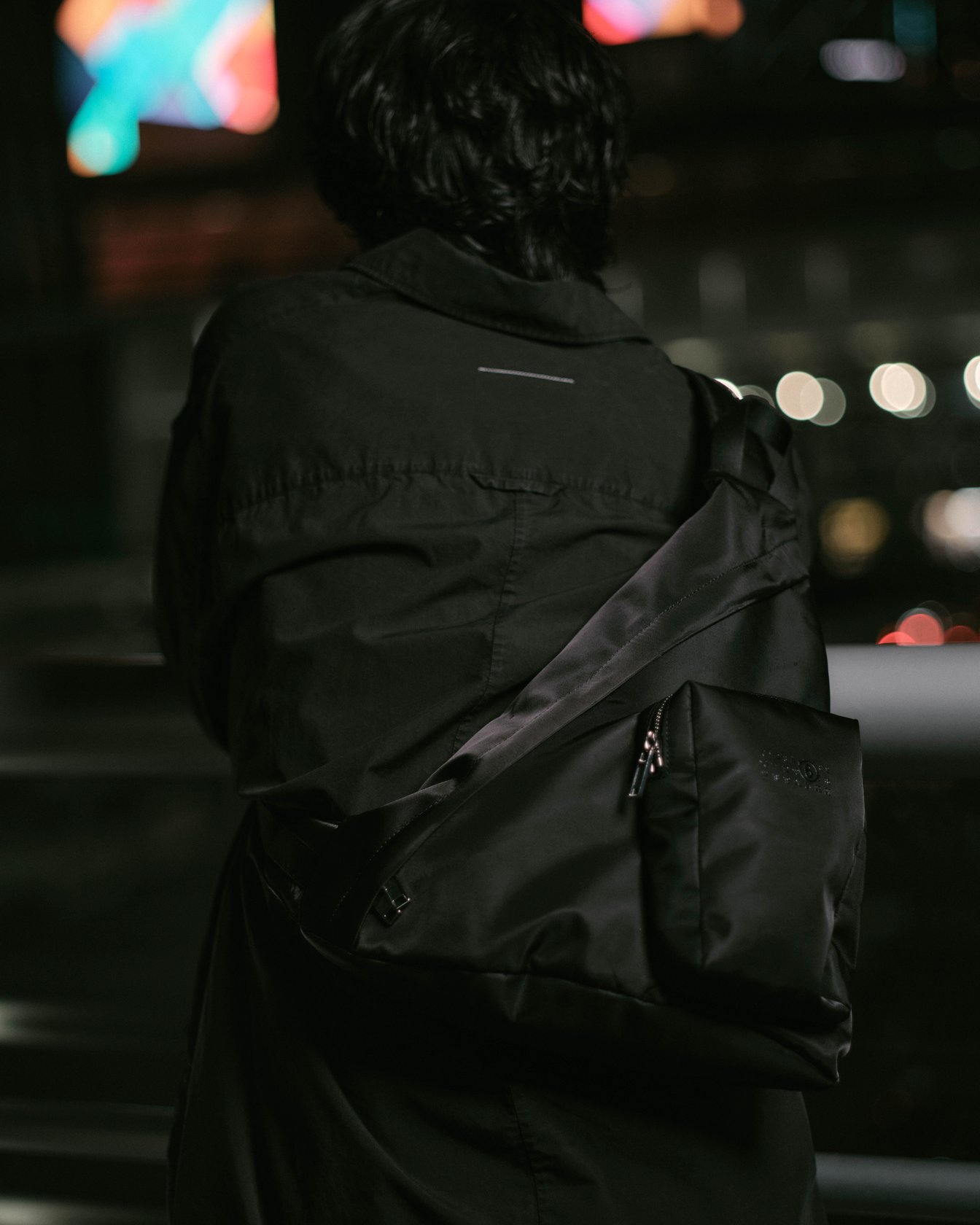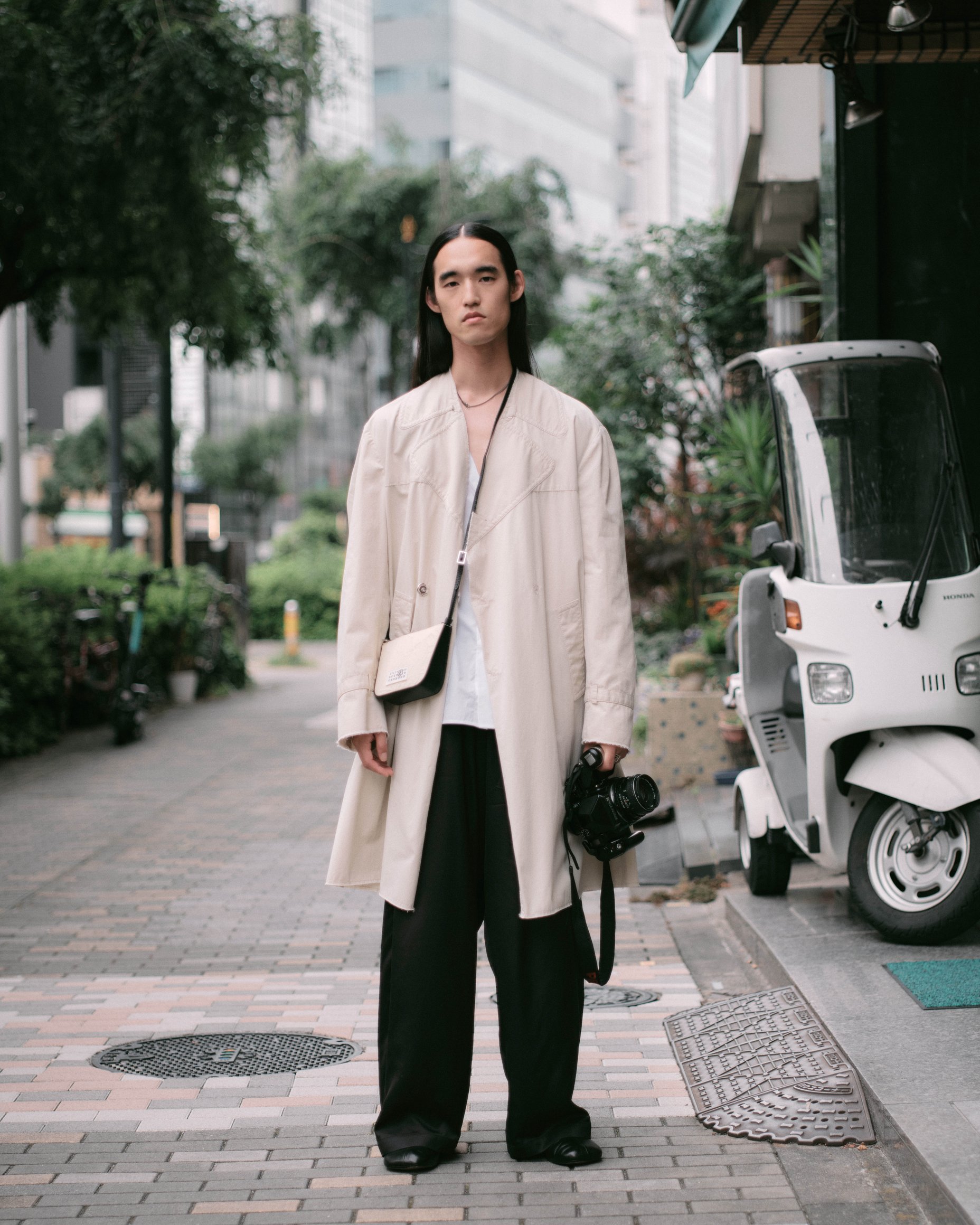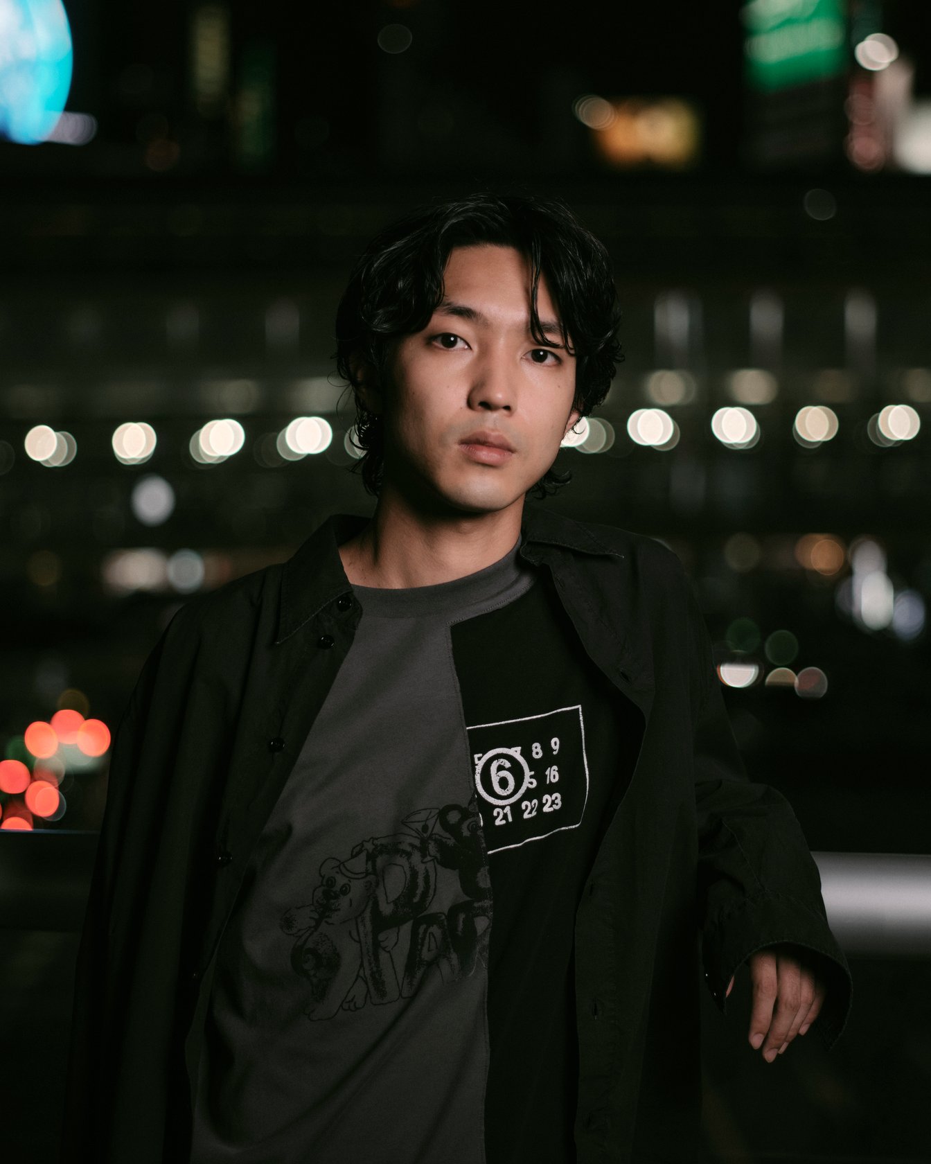 渋谷でキャッチしたのはSpikey Johnこと早矢仕貴之。ライブ感あふれるミュージックビデオで注目され、大物ミュージシャンからのオファーが絶えないクリエイターだ。この日彼が着用していたのは、MM6のナンバリングロゴとプレイフルなキャラクターモチーフという、二つのプリントをミックスしたTシャツ。その上に羽織ったコットンポプリンシャツは洗いがかけられており、ワークウェアのような質感を演出する。渋谷ではゲリラ撮影をすることも多く、「かっこいいと思う基準は、リアルであること。撮影するときも、人物の立ち振る舞いなどがリアルな瞬間を狙う」と明かす。クロスボディフレームのスリングバッグは、ハンズフリーで動けて撮影現場にも最適。チャンキーなラバーソールをあしらったガンベッタスニーカーが、ダークトーンの中でさりげなく主張を加える。彼をインスパイアし続けるのはこの街のリアル感だ。