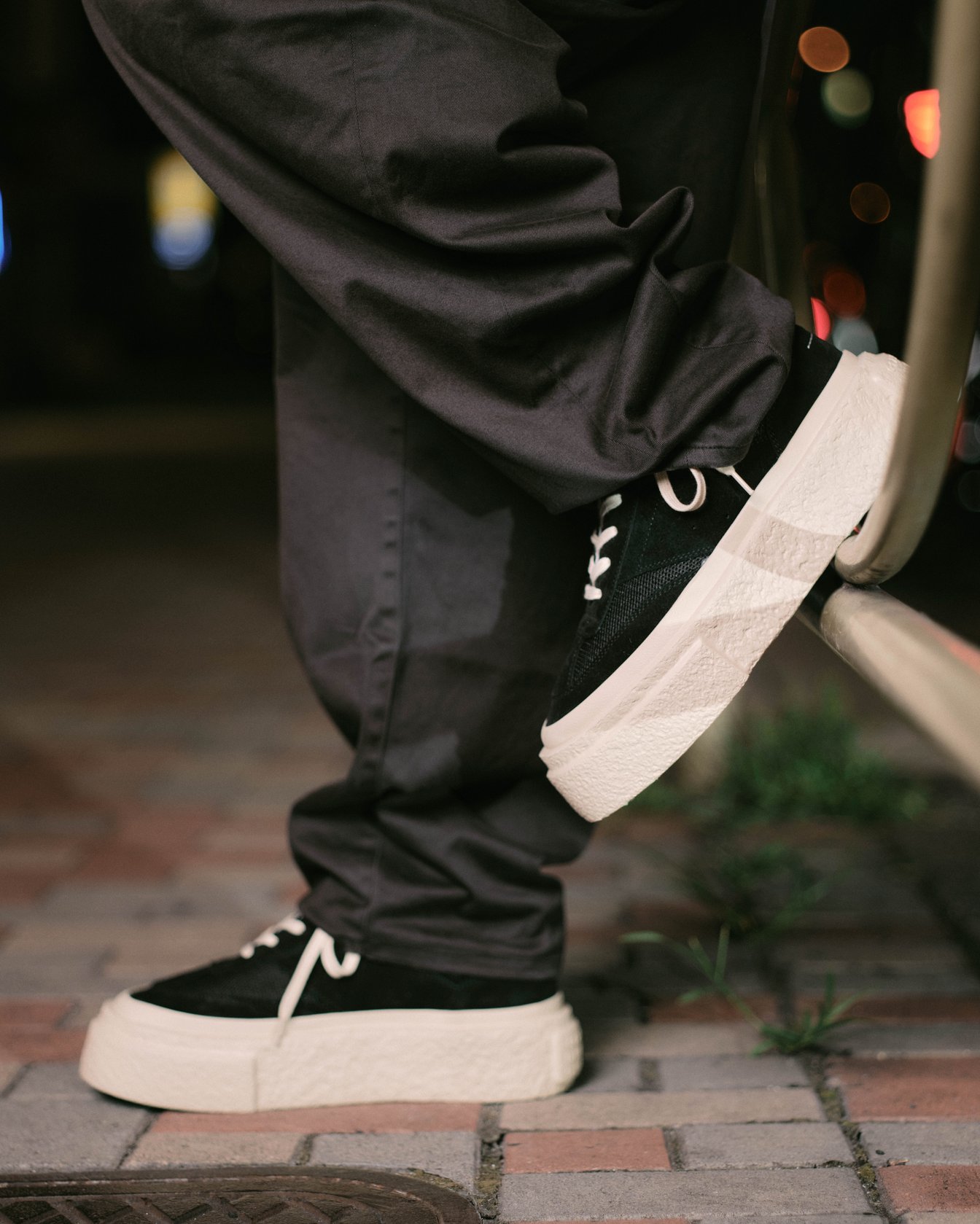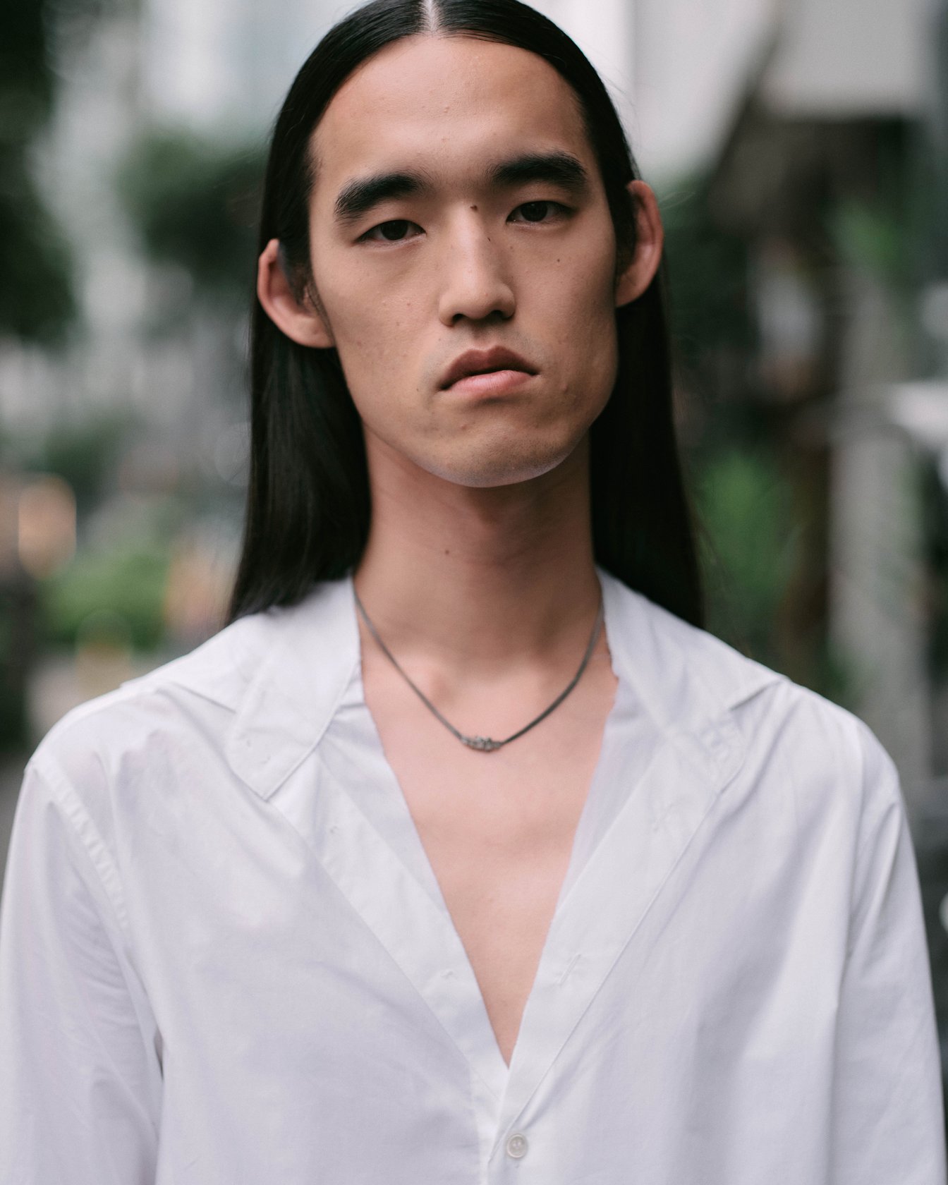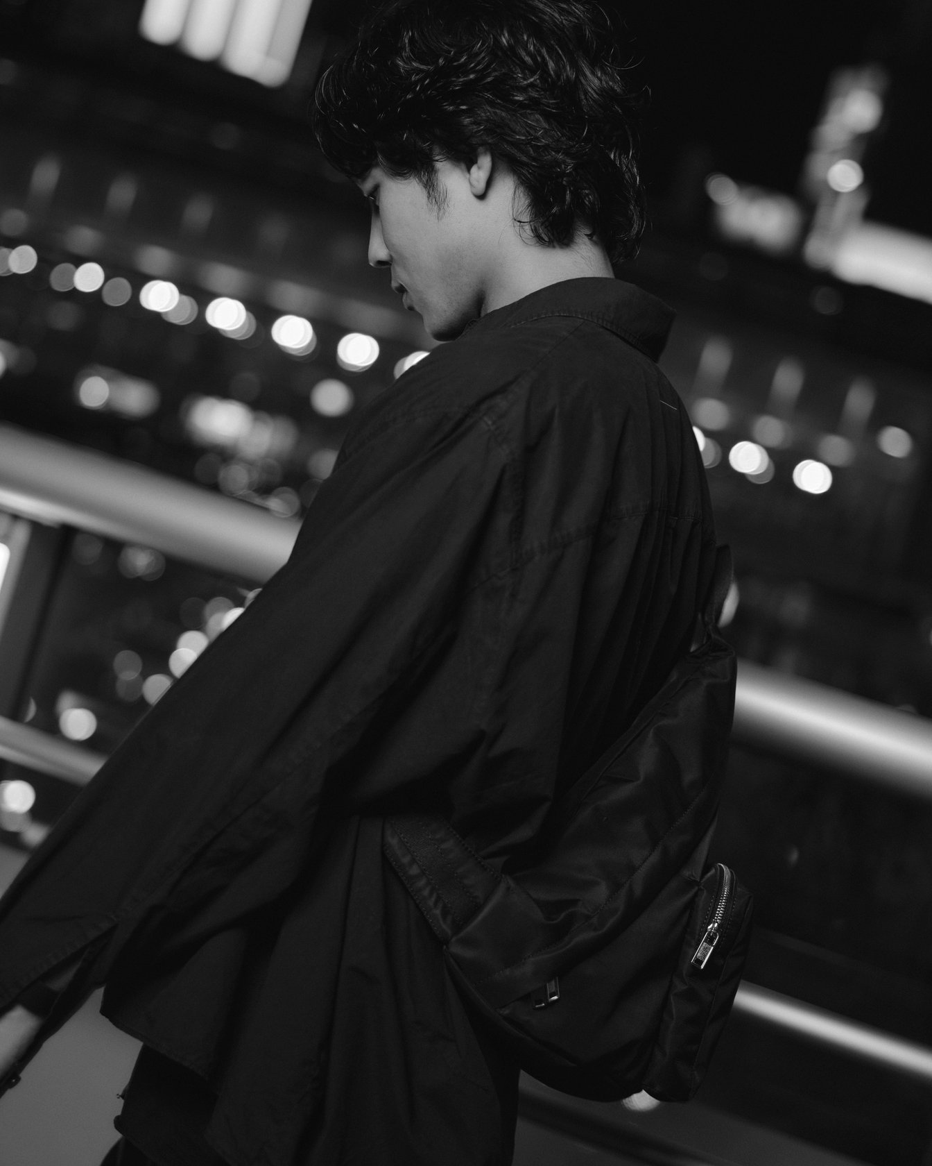 渋谷でキャッチしたのはSpikey Johnこと早矢仕貴之。ライブ感あふれるミュージックビデオで注目され、大物ミュージシャンからのオファーが絶えないクリエイターだ。この日彼が着用していたのは、MM6のナンバリングロゴとプレイフルなキャラクターモチーフという、二つのプリントをミックスしたTシャツ。その上に羽織ったコットンポプリンシャツは洗いがかけられており、ワークウェアのような質感を演出する。渋谷ではゲリラ撮影をすることも多く、「かっこいいと思う基準は、リアルであること。撮影するときも、人物の立ち振る舞いなどがリアルな瞬間を狙う」と明かす。クロスボディフレームのスリングバッグは、ハンズフリーで動けて撮影現場にも最適。チャンキーなラバーソールをあしらったガンベッタスニーカーが、ダークトーンの中でさりげなく主張を加える。彼をインスパイアし続けるのはこの街のリアル感だ。