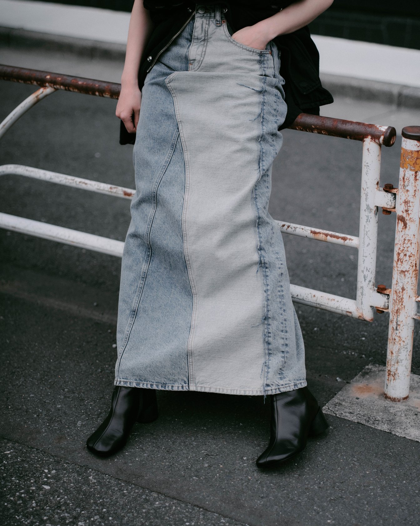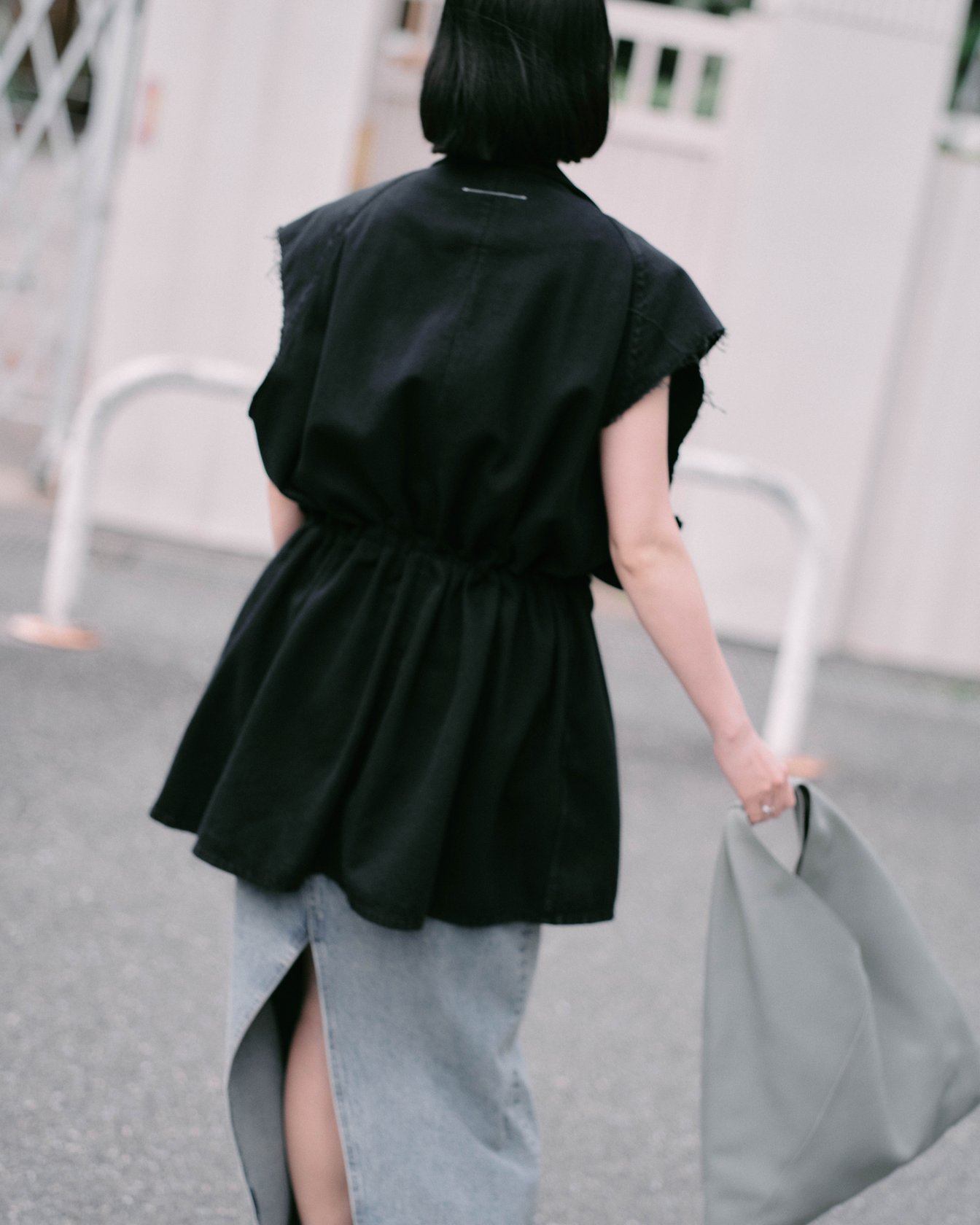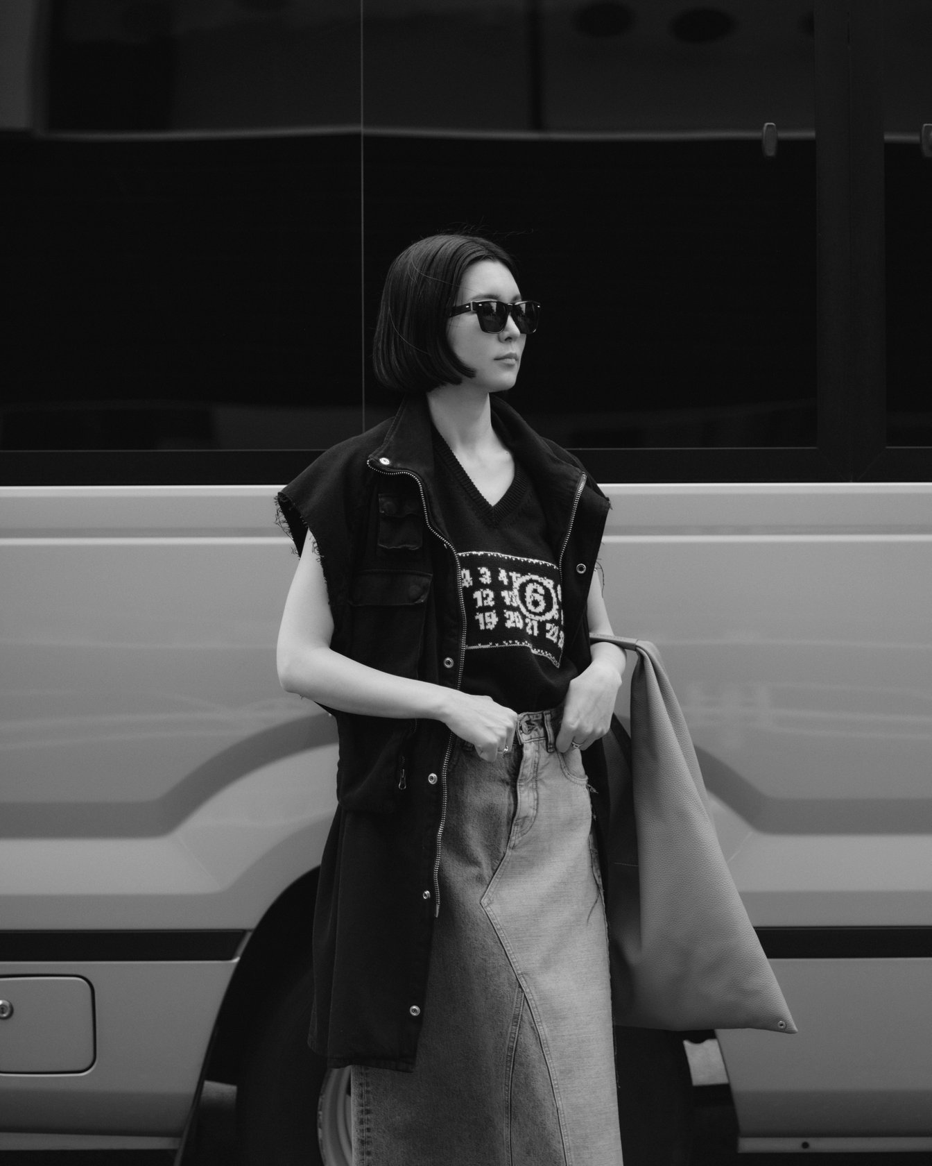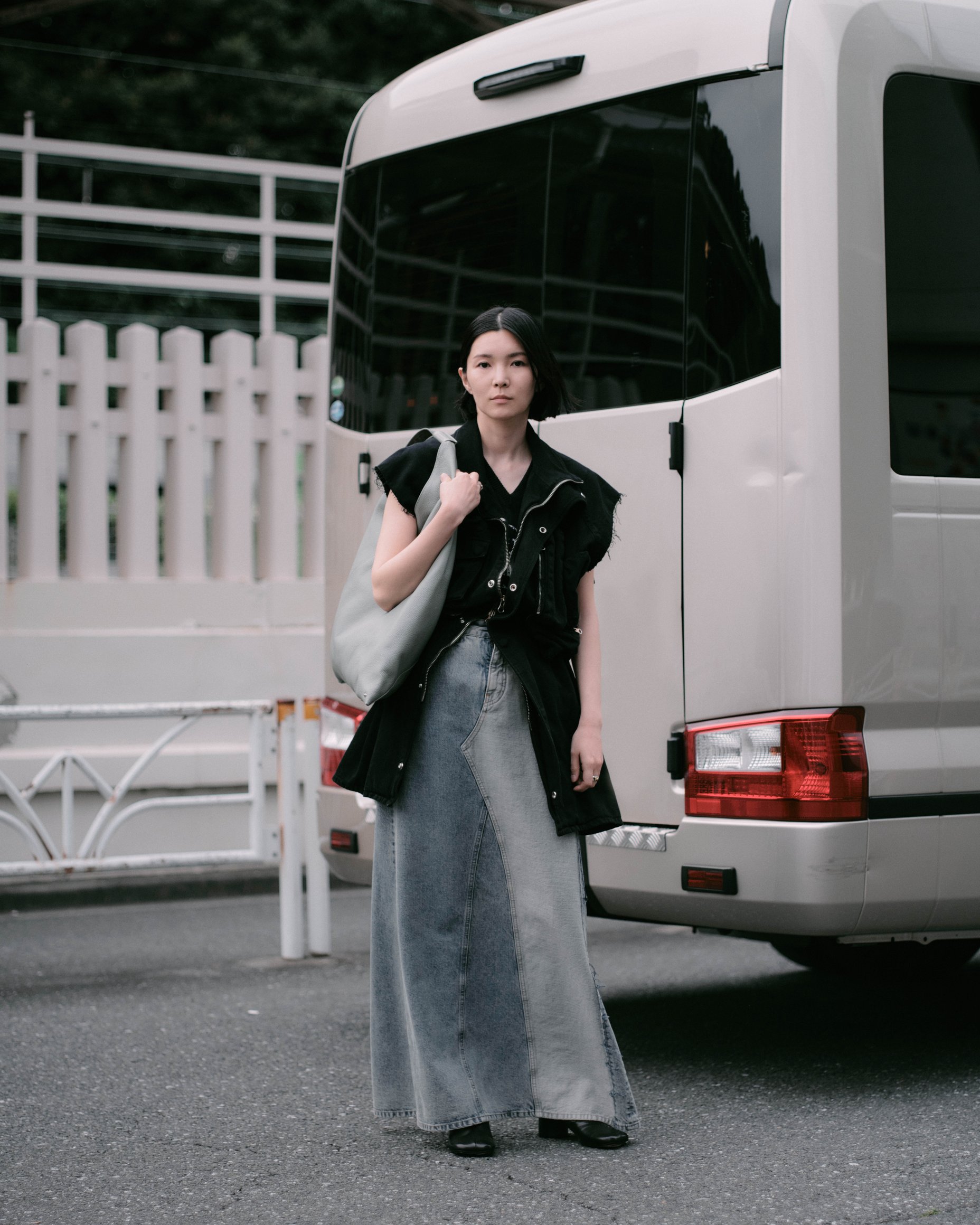 原宿ではロケバスで撮影準備中の早川すみれの姿を捉えた。ベストドレスにウール素材のVネックジレをレイヤードし、ハイウエストのデニムスカートをコーディネート。ジレにはナンバリングロゴが、ベストドレスのバックにはMM6のシグネチャーである1本の白いステッチがあしらわれている。左半分を切り取り、裏返して縫い付けたデニムスカートのデザインが、他にはないスタイルを生み出した。「MM6はベーシックなアイテムにひねりの効いたディテールを加えているから、カジュアルになりすぎない。着る人の個性にマッチしやすい服だと思う」。日々トレンドをリサーチし、撮影のスタイリングやセレブリティのフィッティングなどに追われているが、「この仕事を続けるのは楽しいから。服の組み合わせを考えるとき、『その人だったらどうする? 何が似合う?』と自分の枠からエスケープできてわくわくする」と微笑んだ。