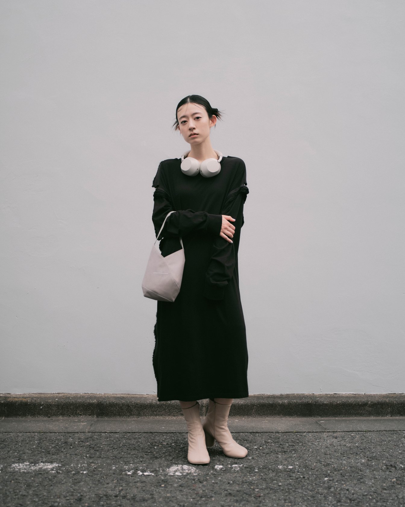 ミディドレス 10万100円、ブーツ(H7cm)9万6800円、「ジャパニーズ」バッグ(H23×W18×D7cm)5万3900円、ヘッドホン(本人私物)