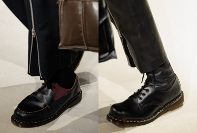 足元はここ数シーズン、「サロモン(SALOMON)」とのコラボが続いていたが、「ドクターマーチン(Dr. Martens)」とタッグ。両者のコラボは今シーズンが初となり、ショーでは2足のシューズをハイブリッドしたようなデザインが披露され、カプセルコレクションの全貌は、12月の発売時までに明かされるという。
