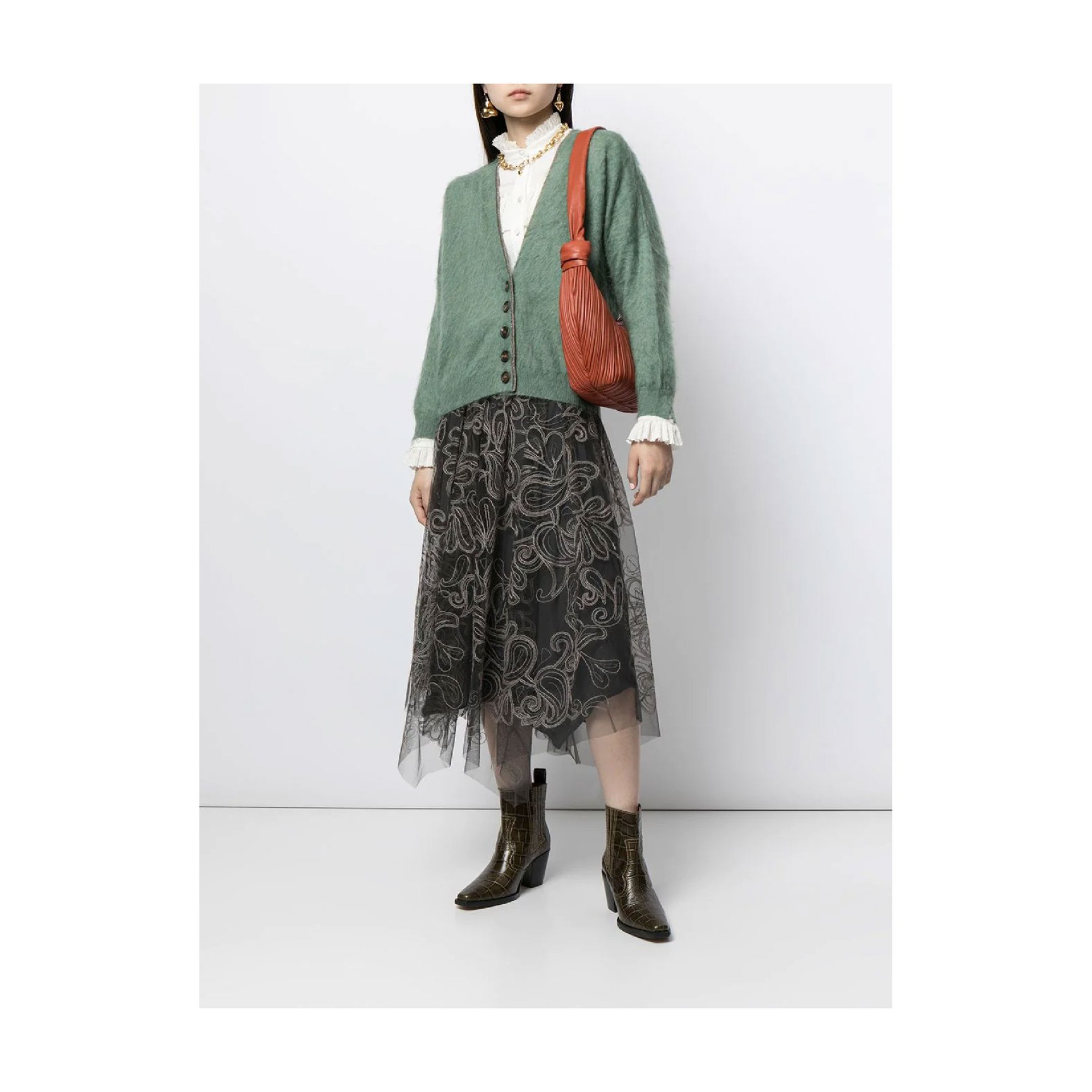 「ブルネロ・クチネリ(Brunello Cucinelli)」のモヘアカーディガンは、絶妙なグリーンカラーが一押しポイント。見た目から、触り心地が良さそうなふわふわ感、イタリアブランドながらもどことなく感じるヴィンテージらしさが特徴です。大きめVネックのカーディガンなので、インナーや胸元のアクセサリーを存分に楽しめます。