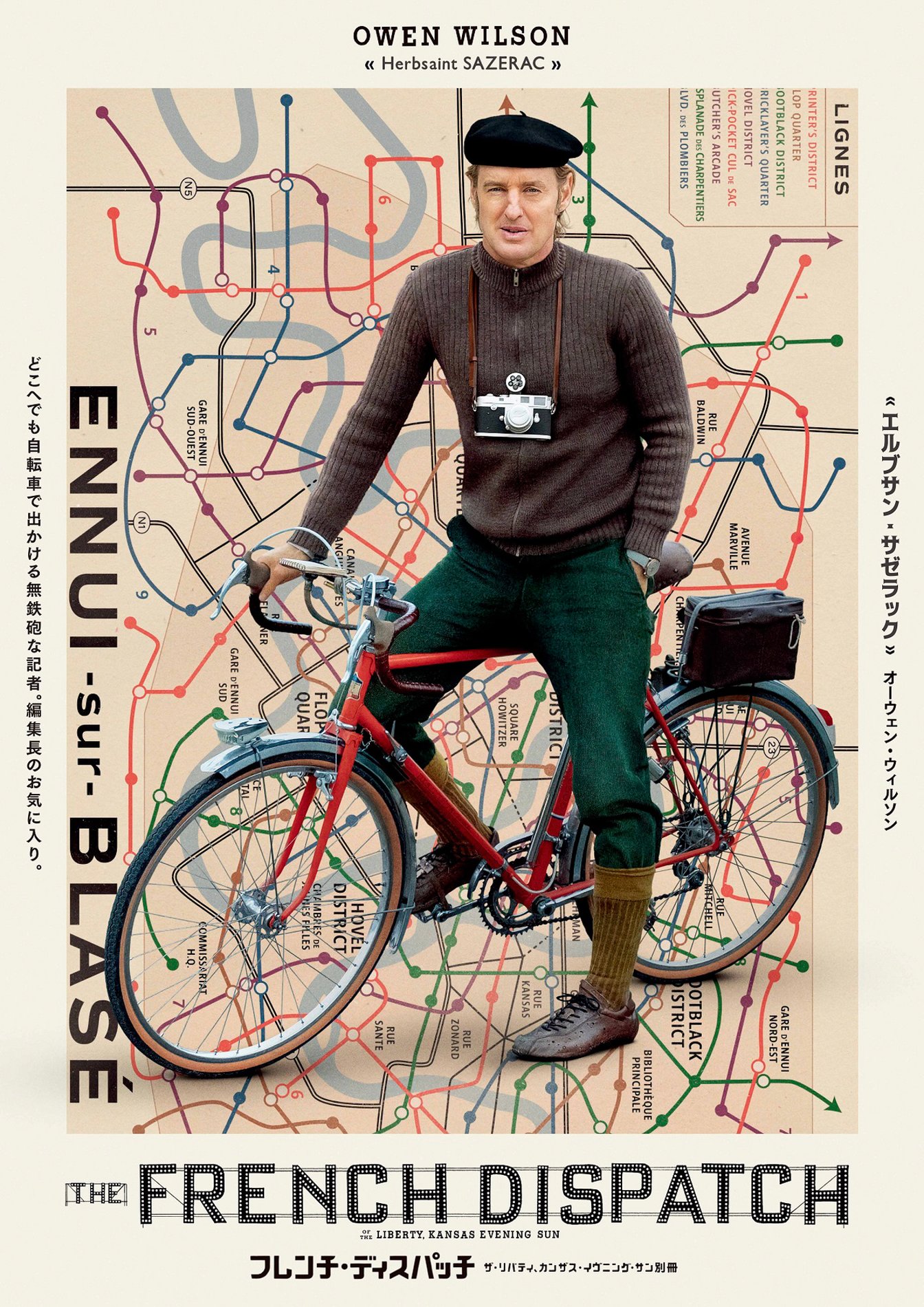 フルカティ:柱となっているのはその3作品だけど、それとは別に短い1本がある。そこではオーウェン・ウィルソン(ウェス・アンダーソンと大学生の頃からマブダチ)演じる自転車レポーターが、雑誌が発行されている架空の街 アンニュイ・シュール・ブラゼの案内をしてくれる、というもの。