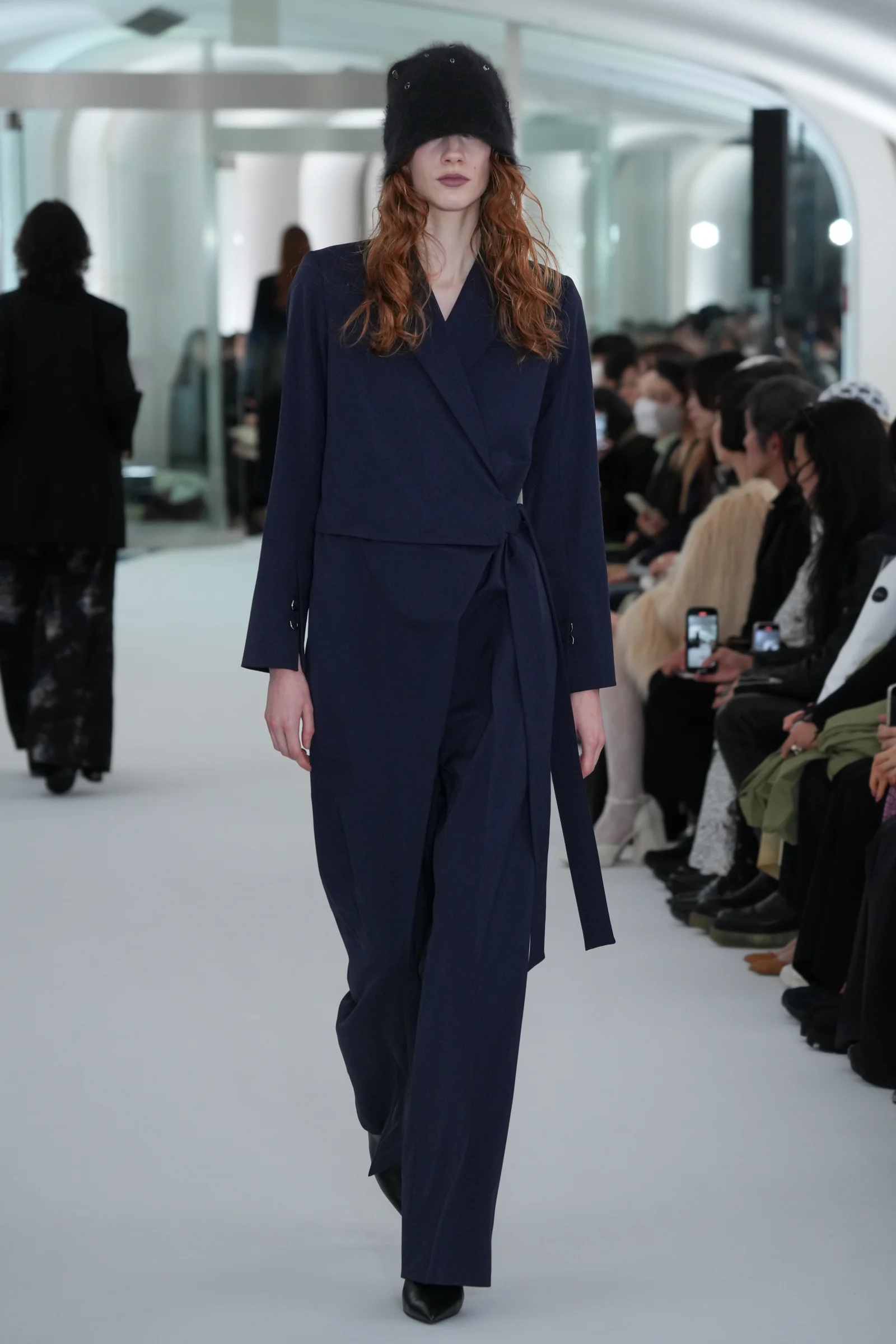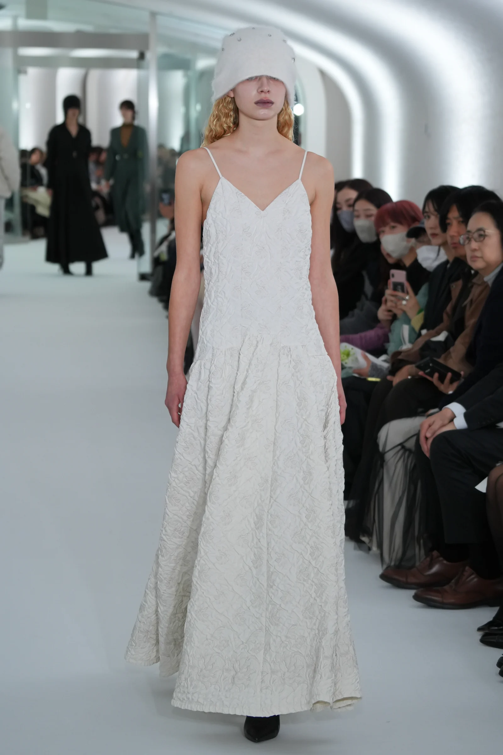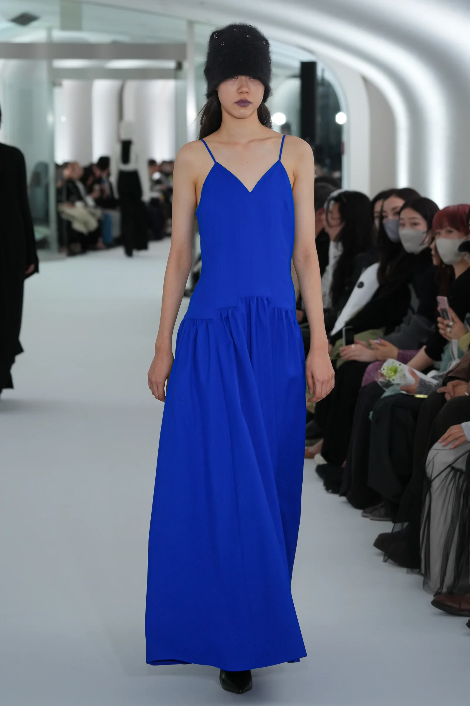 ヘッドピースとして「ラメゾンドリリス(La Maison de Lyllis)」とコラボレーションしたニット帽を発表。アンゴラ生地のニットキャップは、包みこまれるような柔らかさを触り心地、軽さ、毛の立ち方に落とし込んだという。鮮やかなブルーのドレスやキルティングのダウンとともに、ブラック、ホワイト、グレーのヘッドピースがアクセントとして登場した。