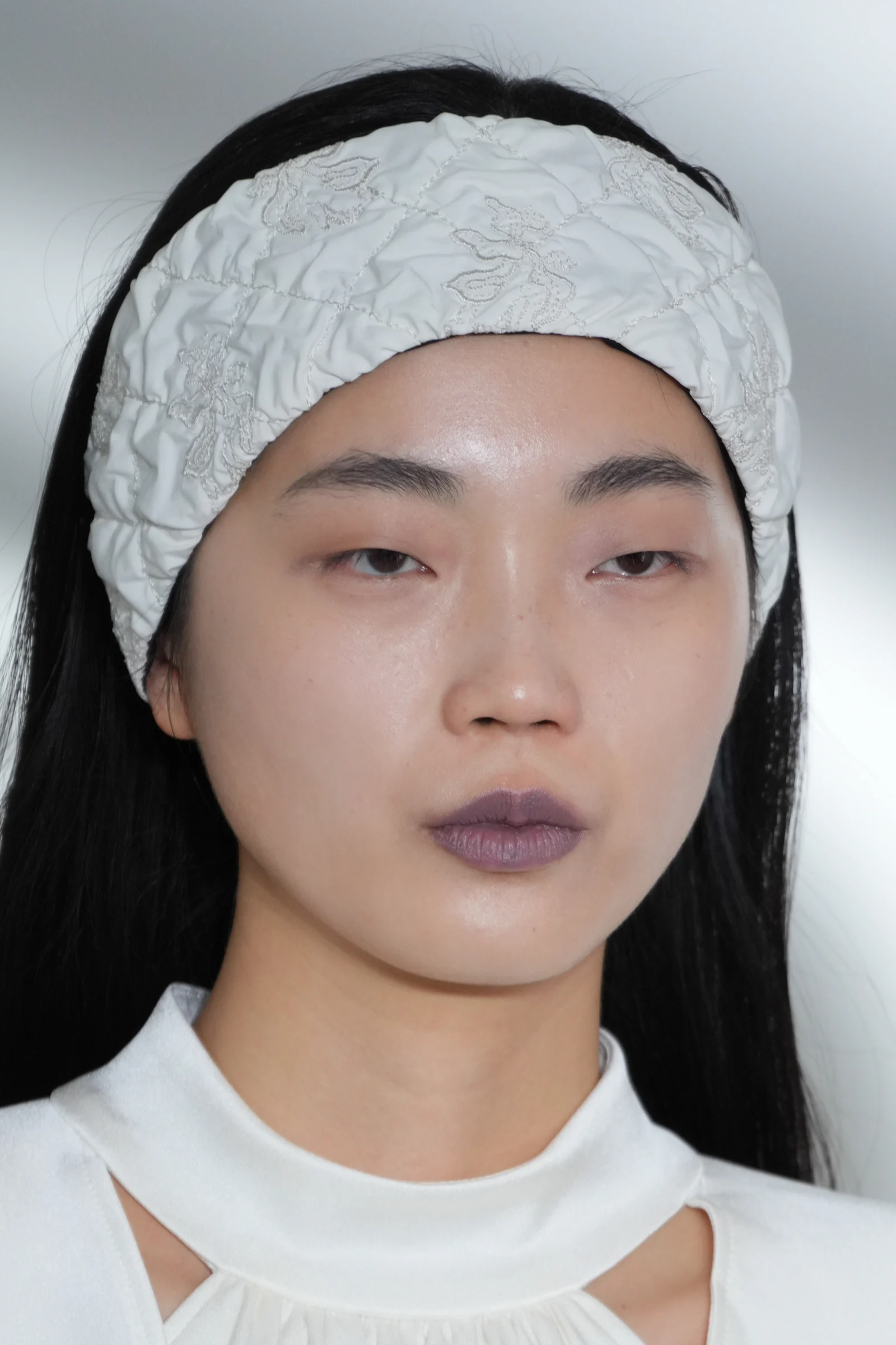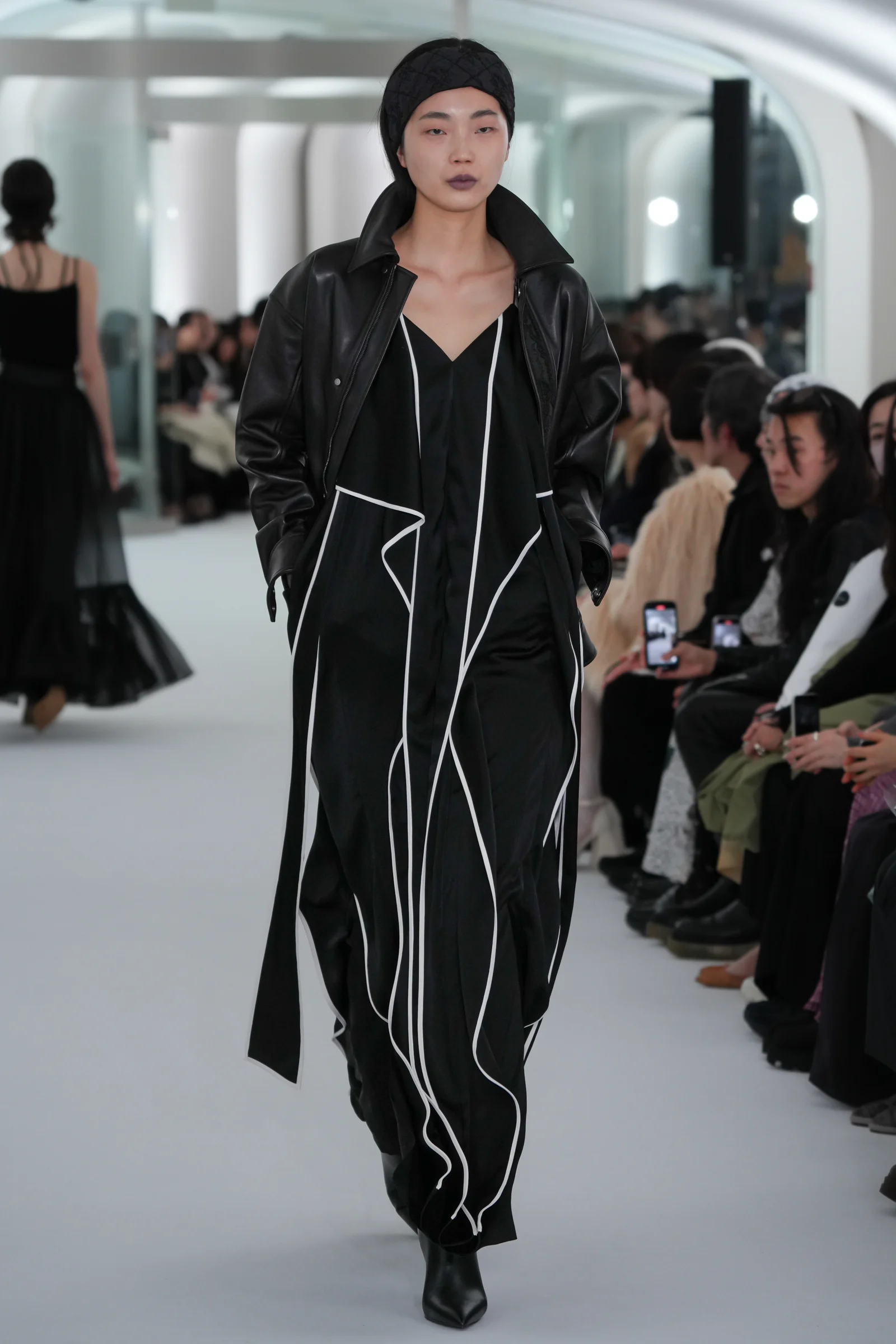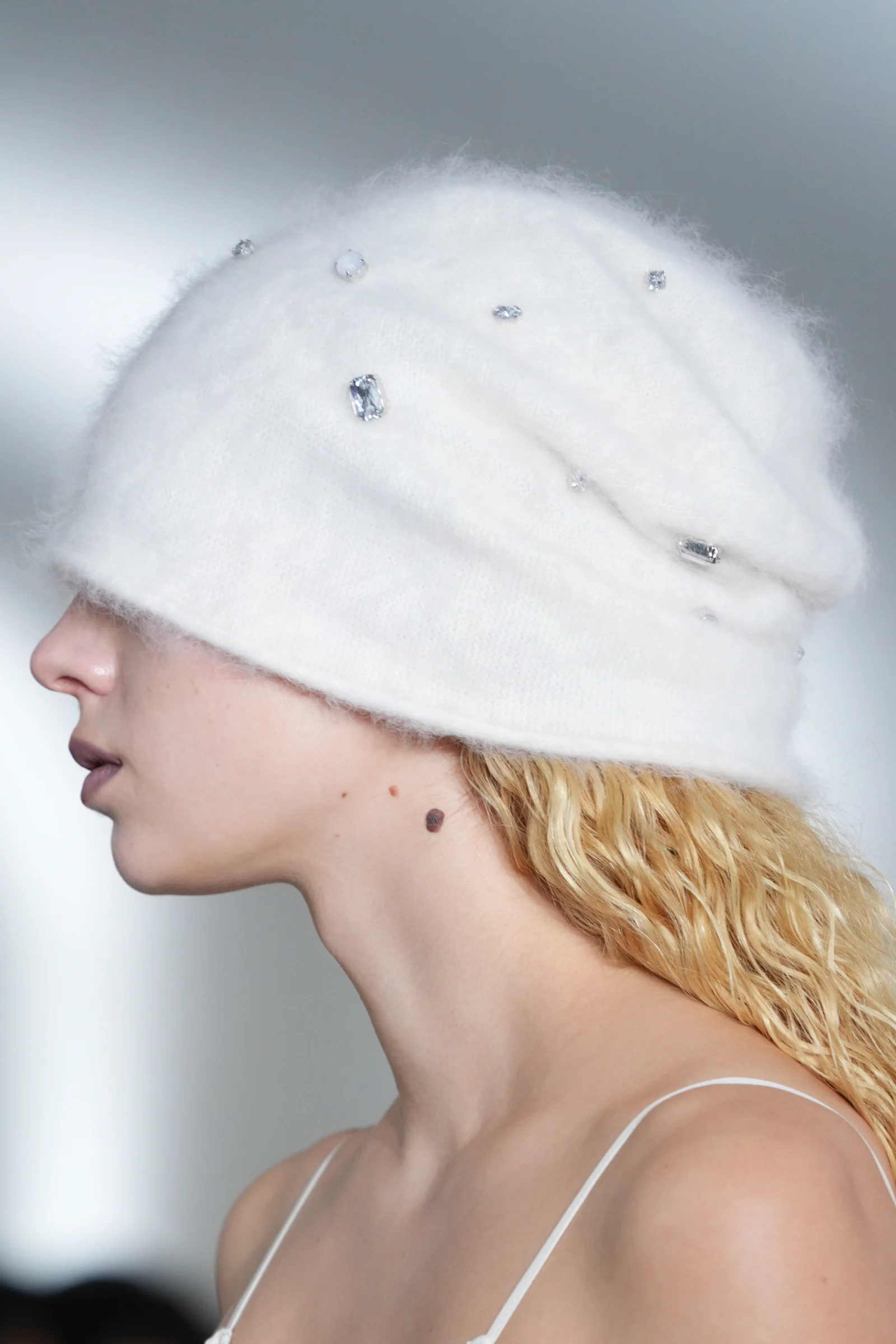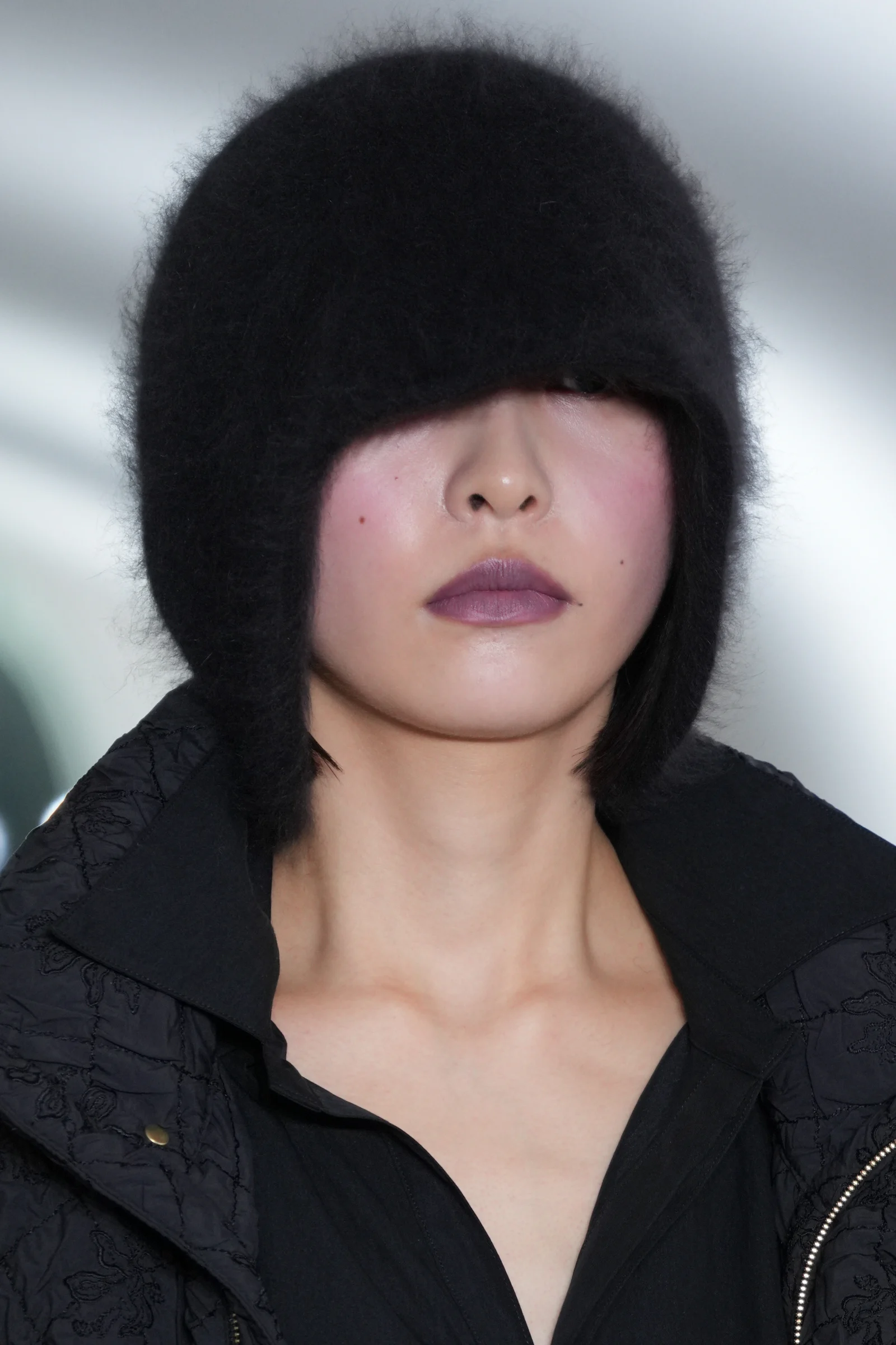 ヘッドピースとして「ラメゾンドリリス(La Maison de Lyllis)」とコラボレーションしたニット帽を発表。アンゴラ生地のニットキャップは、包みこまれるような柔らかさを触り心地、軽さ、毛の立ち方に落とし込んだという。鮮やかなブルーのドレスやキルティングのダウンとともに、ブラック、ホワイト、グレーのヘッドピースがアクセントとして登場した。