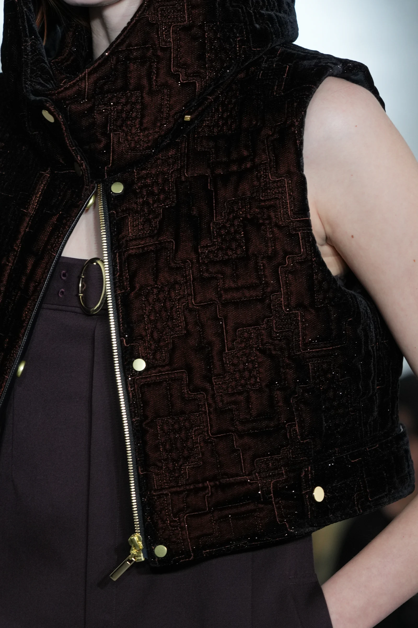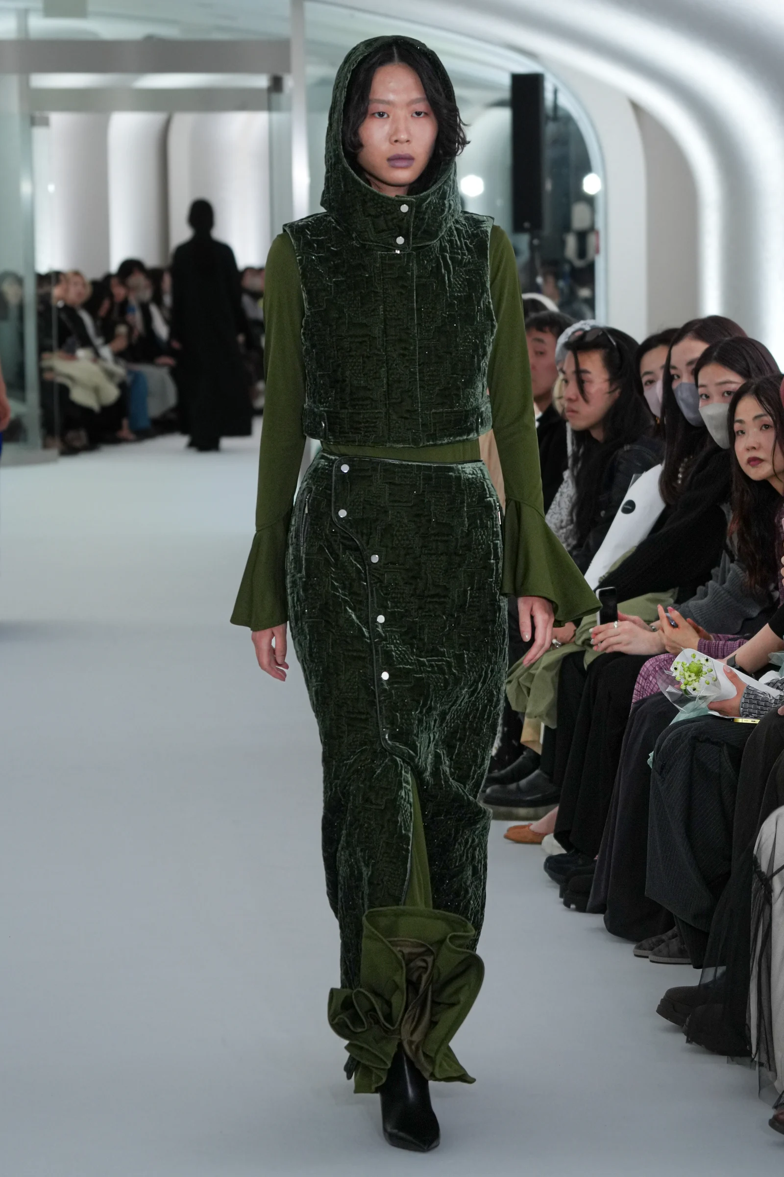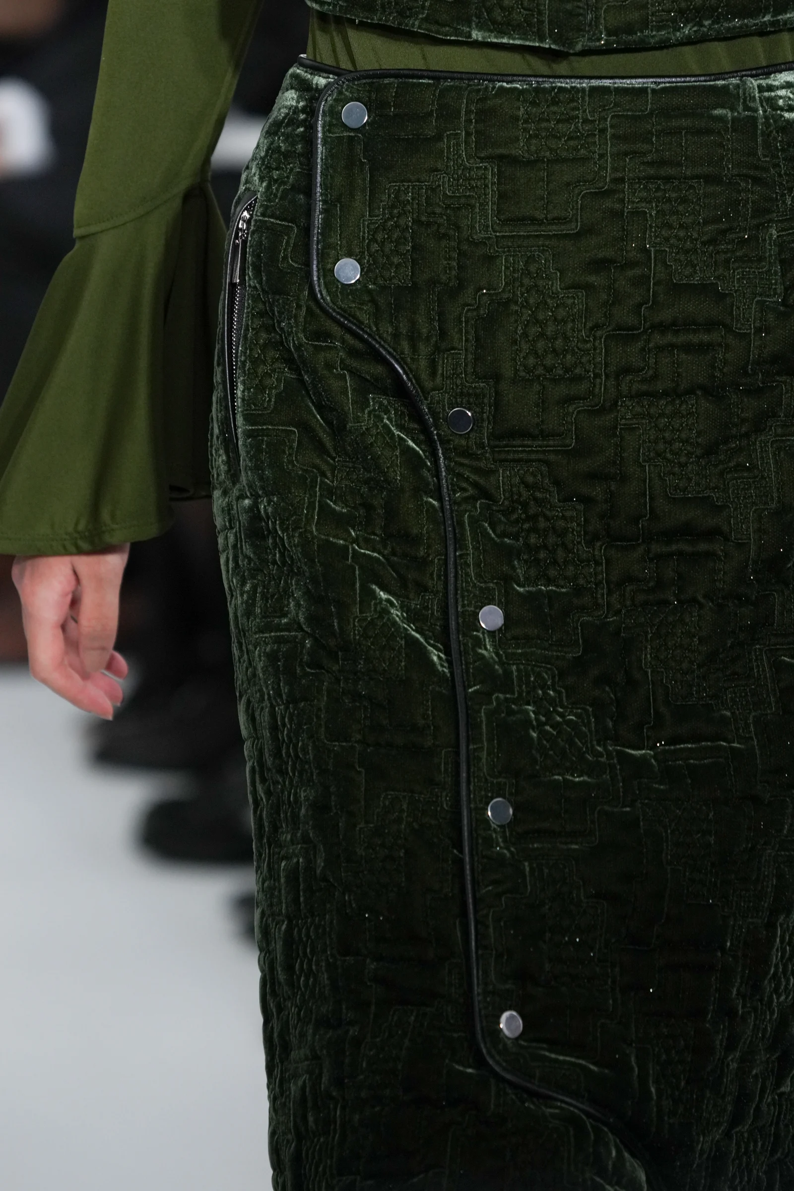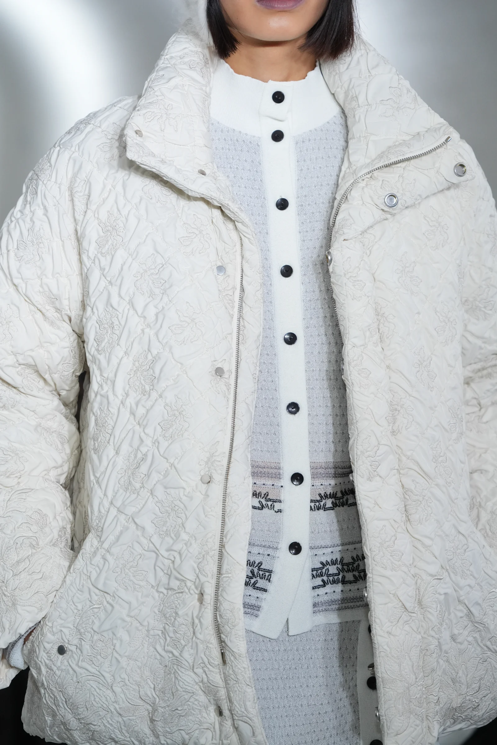 今回のコレクションで、特に目を引いたのはベルベットのキルティングアイテムとレザージャケット。フードベストやスカート、ヘアバンドなどのキルティングアイテムは、コレクションキーワードである「夜」を構成するビル群や街の風景を記号的に解釈したモチーフを、グランドと毛で染め分けしシャンブレーしたオリジナルのベース生地に刺繍した。ショーのフィナーレを飾ったレザージャケットにはコード刺繍、平刺繍、3D刺繍の3つの技法を採用。小さな面積の中に細かな立体性を表現したという。レザージャケットや収縮ナイロンに配した花柄デザインは、村松が関口に告白した際に渡したダリアをイメージし、村松にとってのwithを服へと落とし込んだ。