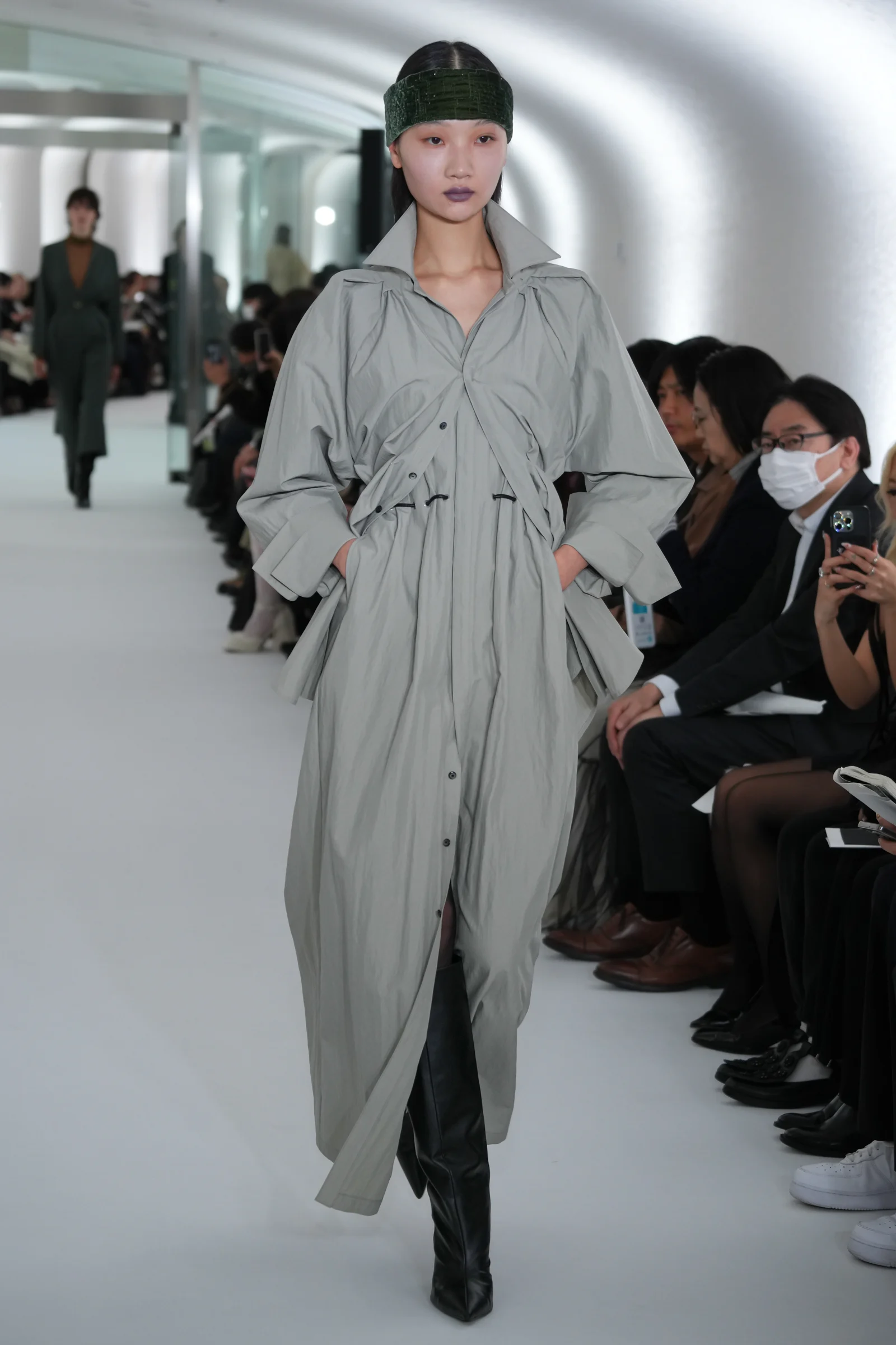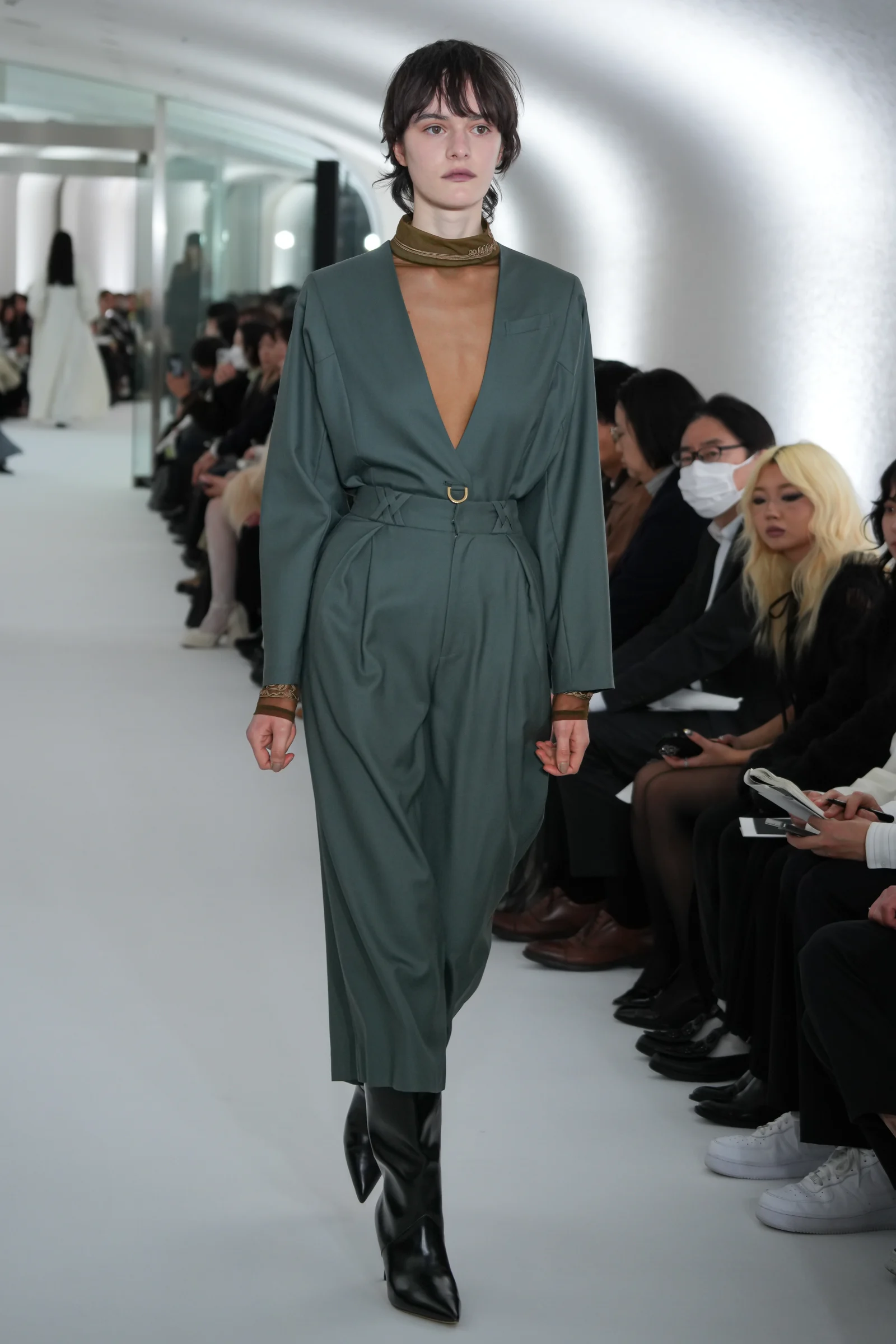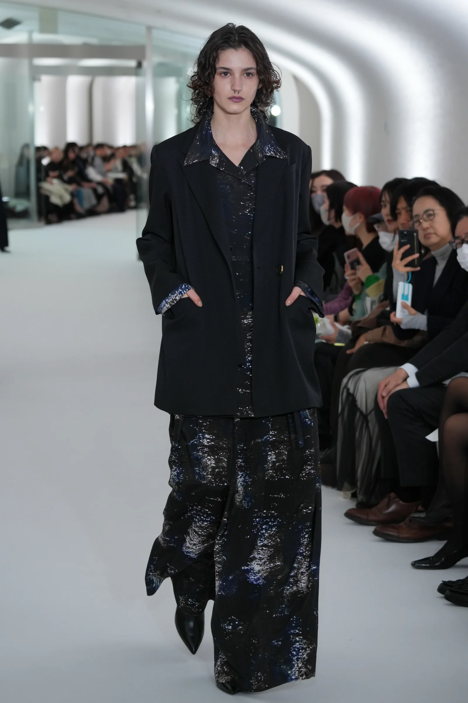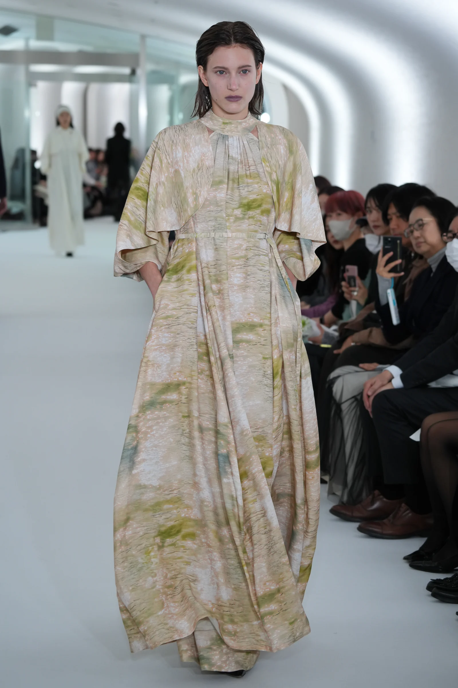 ミューラルの特徴の一つは、色鮮やかなドレスを引き立てる多種多様なアクセサリー。昨シーズンの2024年春夏コレクションでは、約1000メートルのワイヤーを使用したディップアートがショーのラストを飾るなどひと際存在感を放っていた。2024年秋冬コレクションでは、ピアスやネックレスなどの"付属品"は極力削ぎ落とし、それらを差し引いたあとに浮かび上がる純粋さを表現。アクセサリーに頼らないワンピースルックやドレス、ジャケットスタイルは関口が描いた力強い女性像そのものだった。