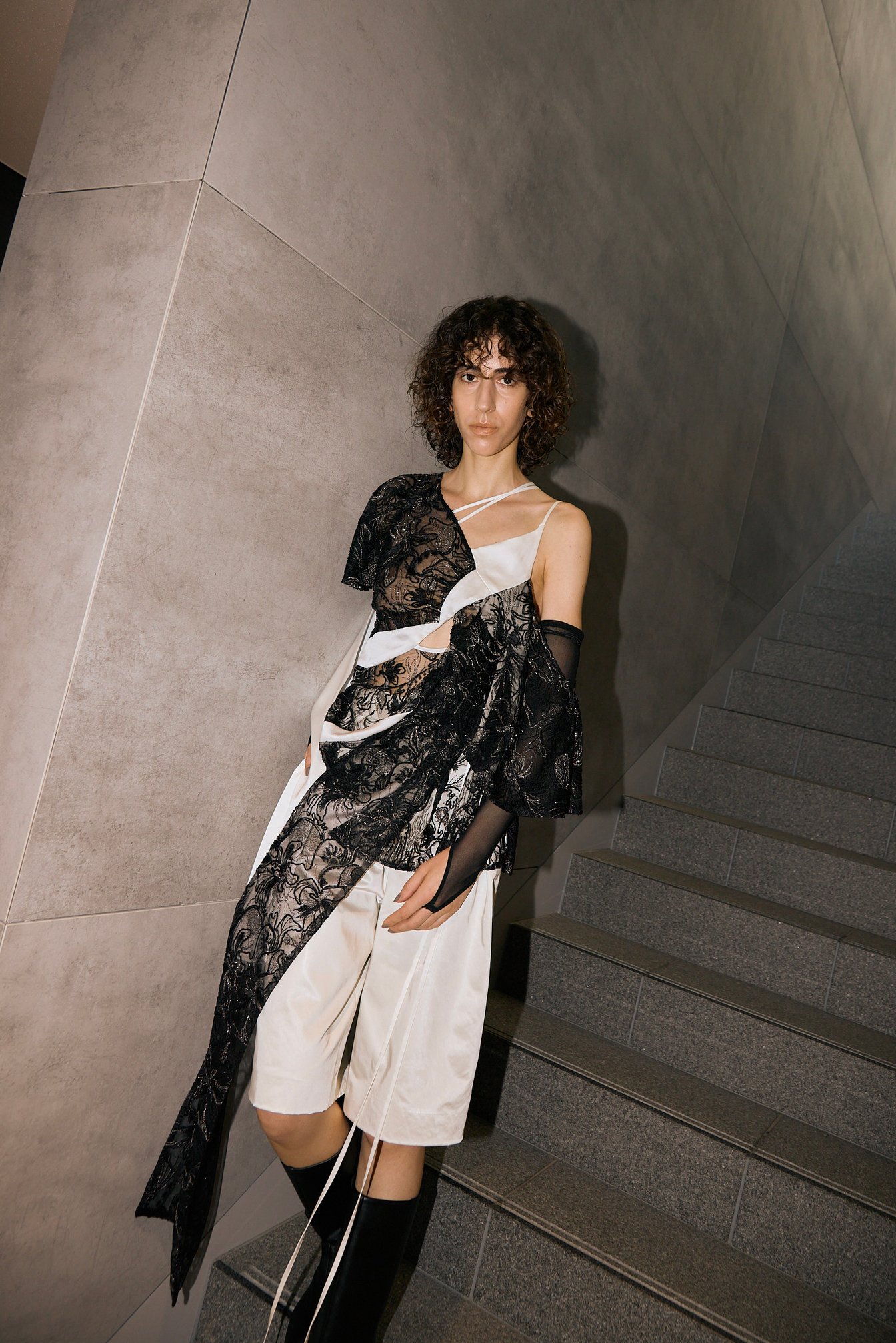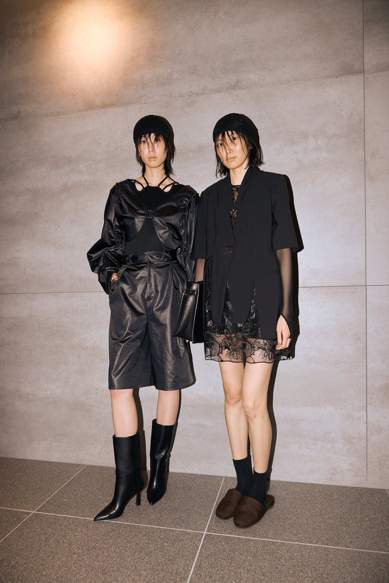 その反省をもとに、2025年春夏はブランドの核心を探ることから制作をスタートさせたというデザイナーデュオの村松祐輔と関口愛弓。公私共にパートナーである2人は、お互いが影響を受けたもの、変わらず好きなものについて語り合い、「奇妙な美しさ」というキーワードに辿り着いた。「共通していたのは、ちょっと変なものが好きということ。残酷なストーリーでも、美しい映像や音楽を楽しめる映画など、その対比に心が惹かれる」と関口は説明する。