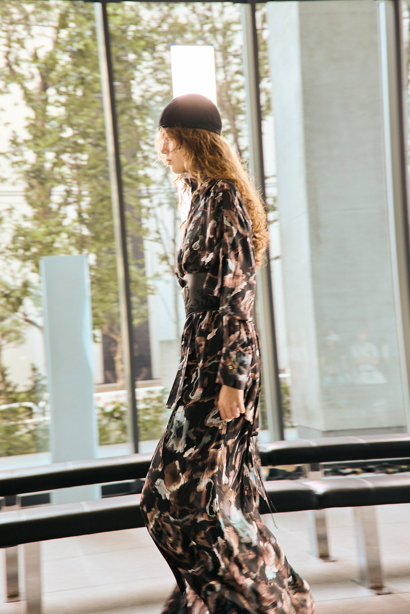 今季のテーマを象徴するルックは、序盤にまとめられている。ファーストルックは、デザイナーの関口が描いた抽象画のようなグラフィックをのせたブラウスとボトムス。これはディプサクスの花をアルコールインクで描いた後に、柄の一部を手で消し取ることで、原型を留めていない不思議な“花柄のようで花柄でない柄”が生まれたという。