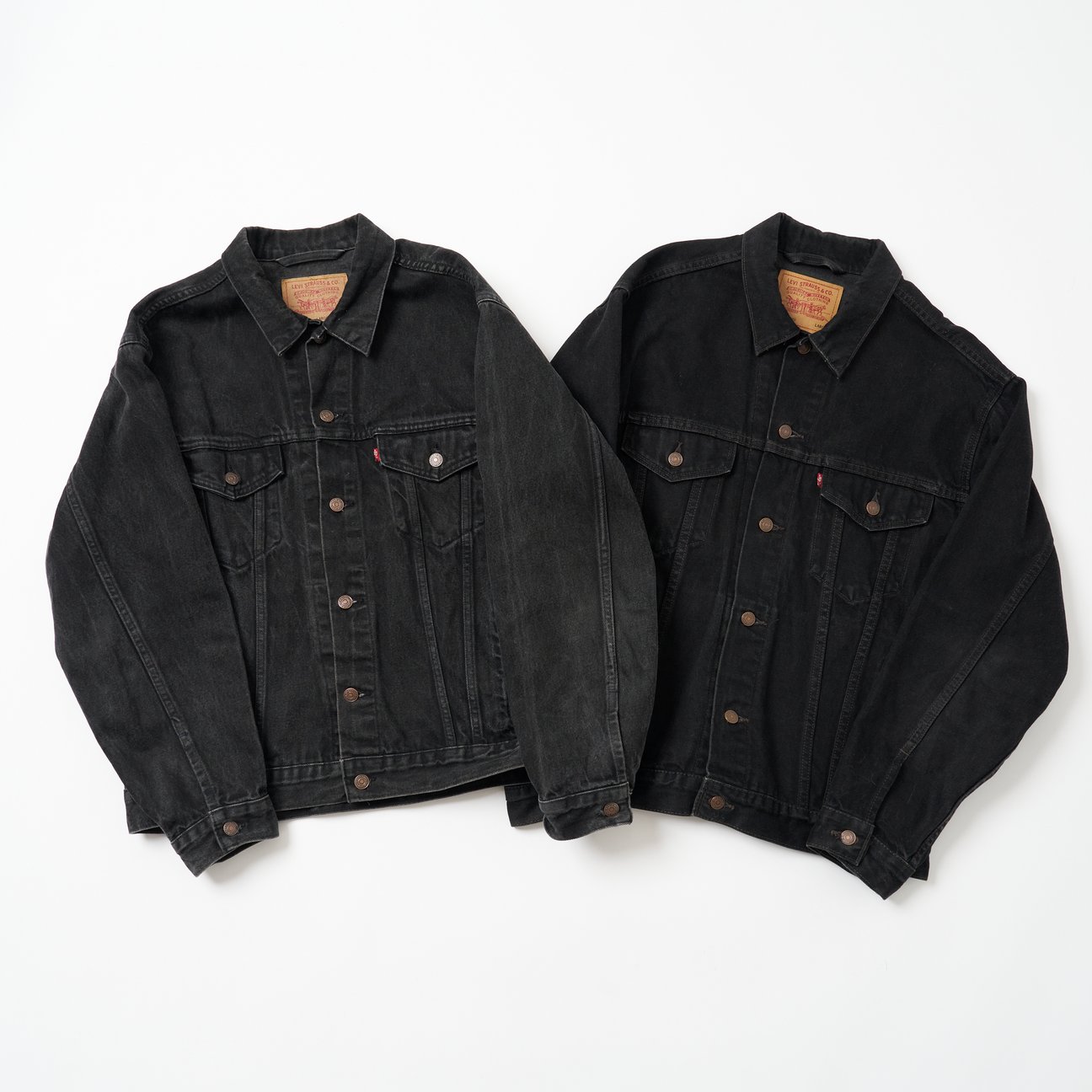 話がややこしくなって申し訳ないですが、今回紹介するのは通称「後染め」のアイテムです。「先染め」の良さももちろんありますが、「後染め」のほうが綺麗に色落ちしやすいというのが僕の持論です。百聞は一見にしかず。「後染め」の色落ちを見てみましょう。どちらも1990年代の「後染め」で、右側はほとんど着用していない状態、左側は真っ黒の状態から僕が着用して色落ちさせたものです。特別なことは何もせず、普通に着て普通に洗濯しただけですが、ヴィンテージならではの墨黒の良いアジが生まれていると思いませんか?