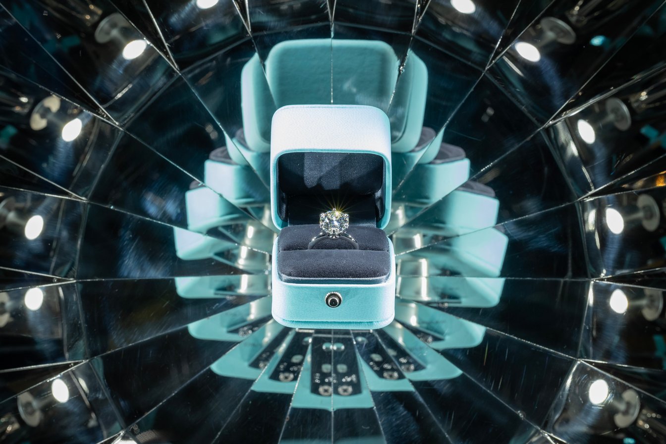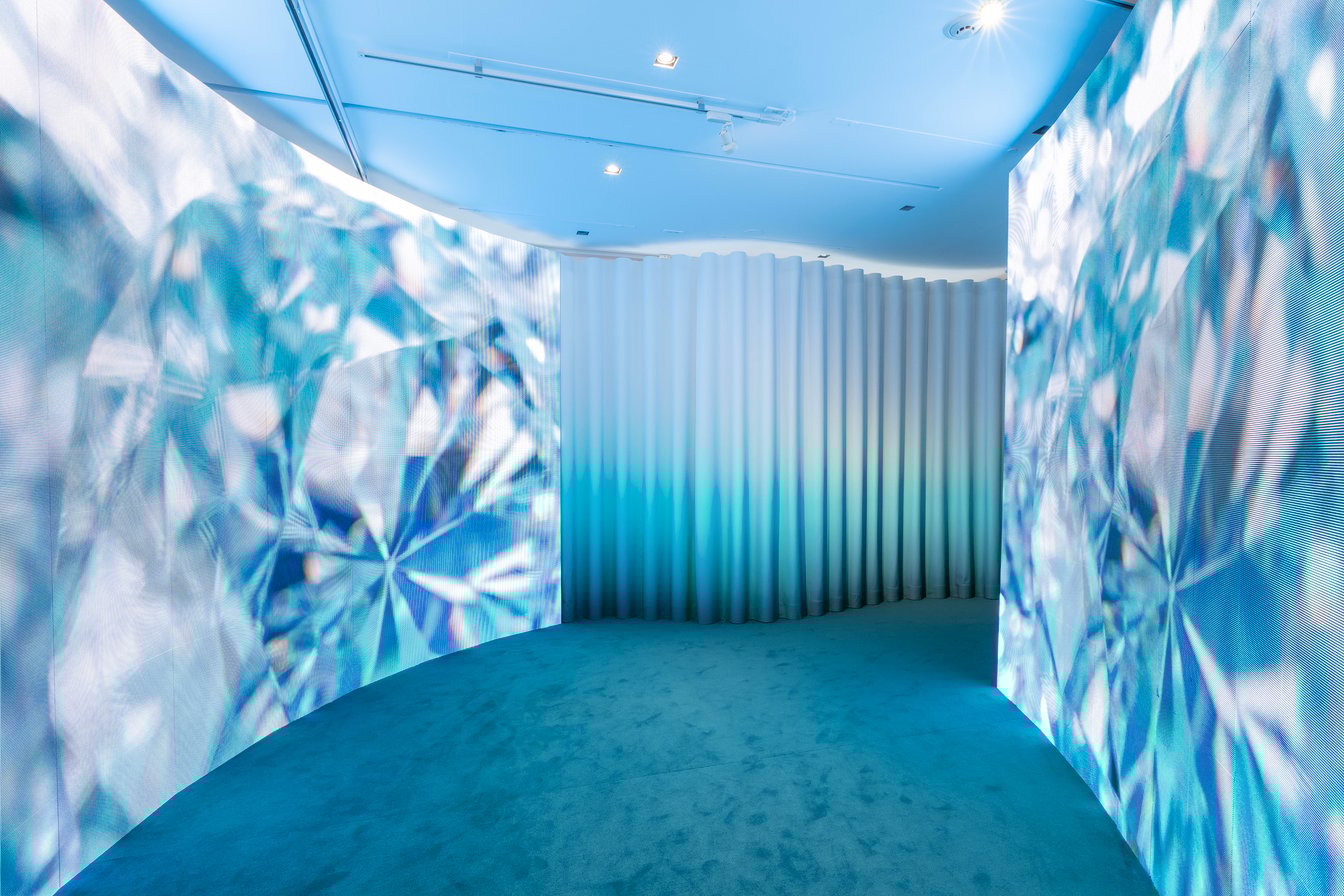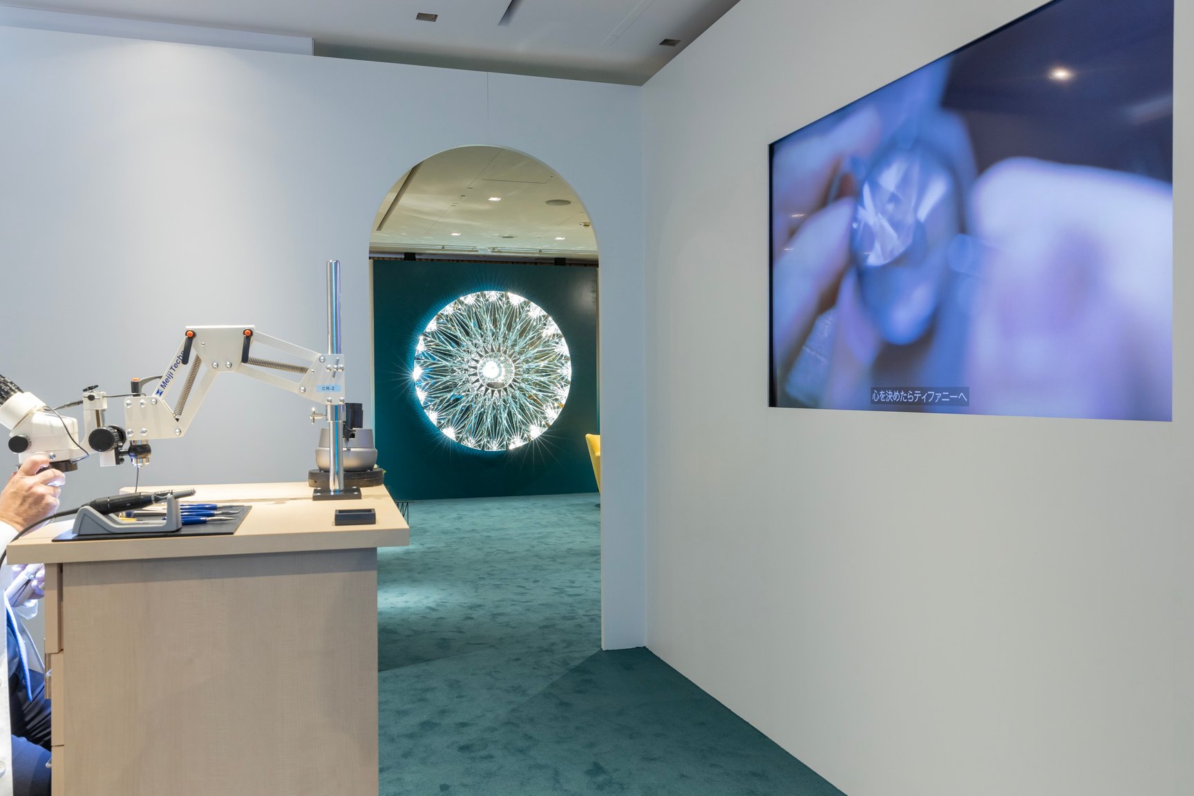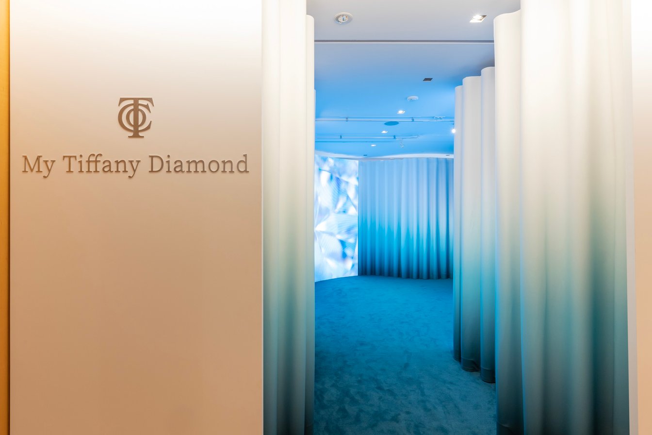 プログラムの実施期間中は、ティファニー銀座本店3階が上品なグラデーションで彩られた特別な空間に変貌。フロアのエントランスでは、大きなデジタルスクリーンに映し出される煌びやかなダイヤモンドのイメージムービーが待ち受ける。