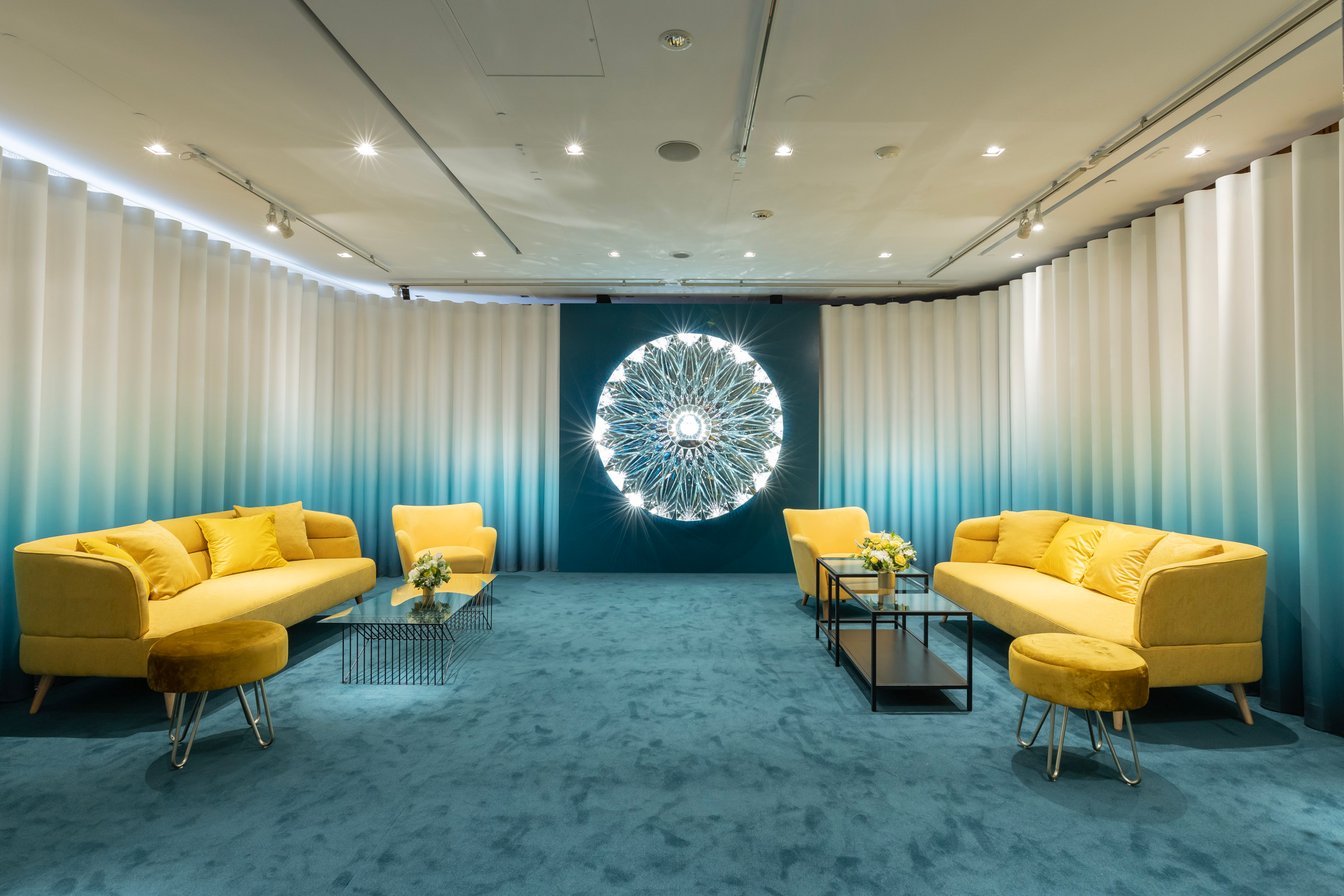 その奥には、ゆったりとしたラウンジが用意されている。中央には5カラット超を有する「ティファニー® セッティング」のエンゲージメントリングを展示。イエローの華やかなソファーは、ティファニーを象徴するイエローダイヤモンドをイメージしているという。ここでは、豊富なルースストーンやデザインから好みのものをじっくりと選ぶことができる。