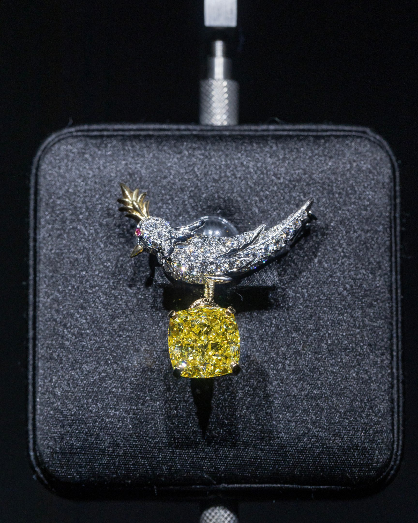 そして最後の空間には、ティファニーが誇るダイヤモンドジュエリーの数々を展示。12カラットを超える貴重なイエローダイヤモンドの「バード オン ア ロック」は、羽を休める小鳥の姿を描いた愛らしいブローチだ。伝説的ジュエリーデザイナー、ジャン・シュランバージェ(Jean Schlumberger)がティファニーのためにデザインした、アイコニックな名作となっている。