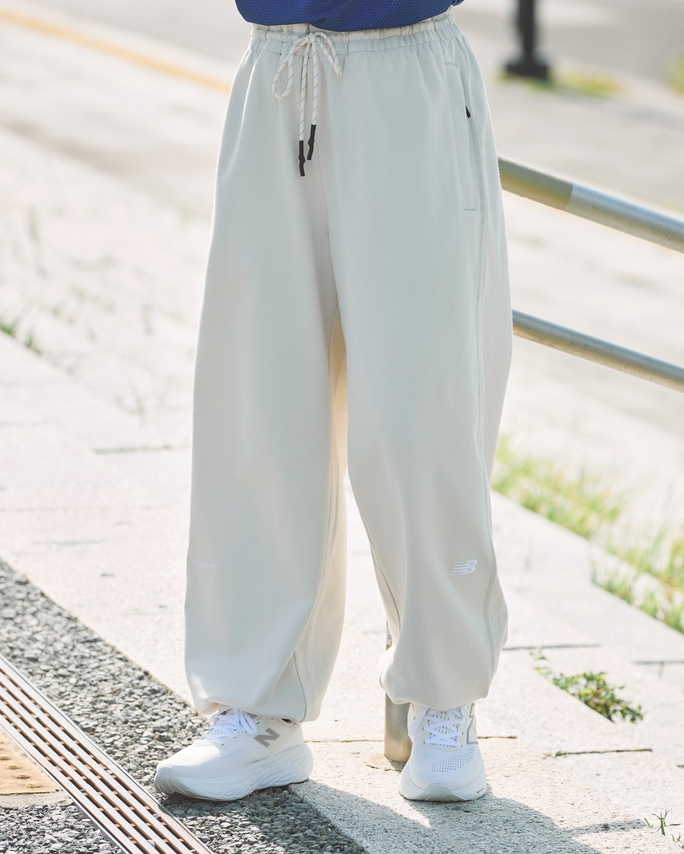 「NB GREY フリース ワイド パンツ」には、優れたストレッチ性と吸汗速乾性、保温性を備えた機能素材「NB HEAT」を使用。ラウンドポケットには、1980年代のトラックジャケットなどに見られるディテールを用いるなど、デザイン性にもこだわっています。裾はドローコード仕様になっているので、絞ってシルエットにアクセントを加えることも可能です。
