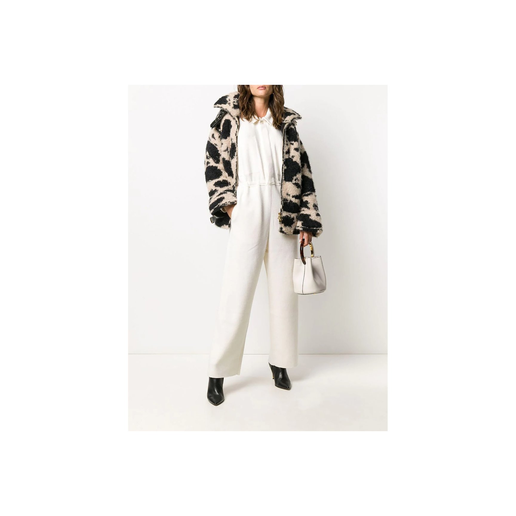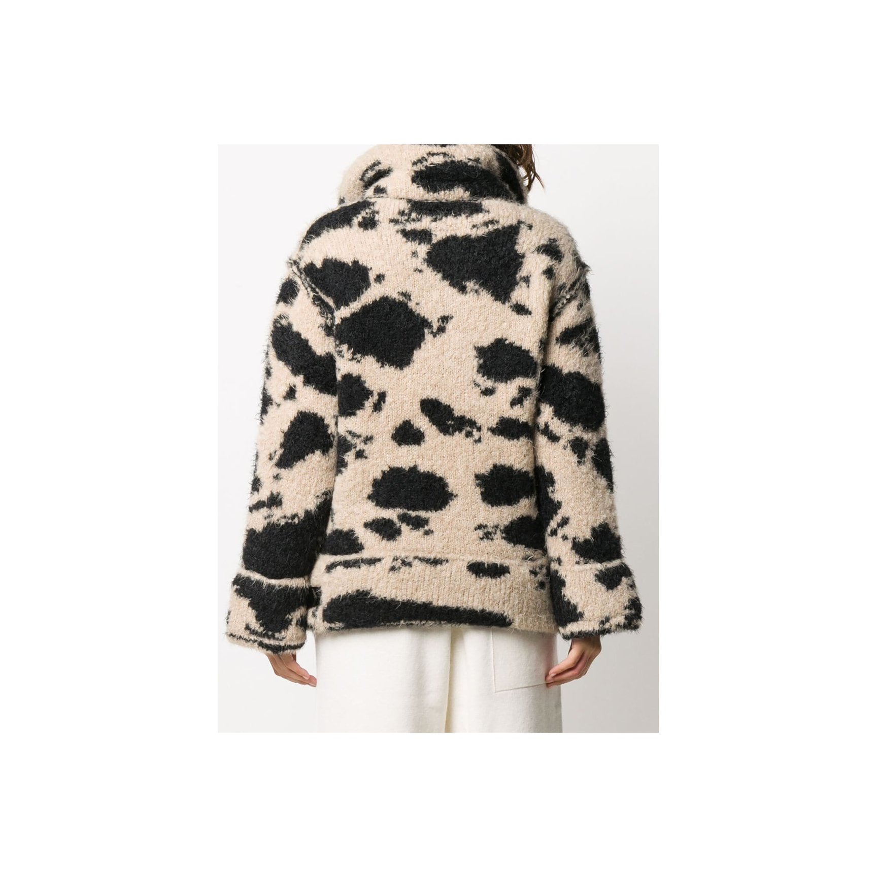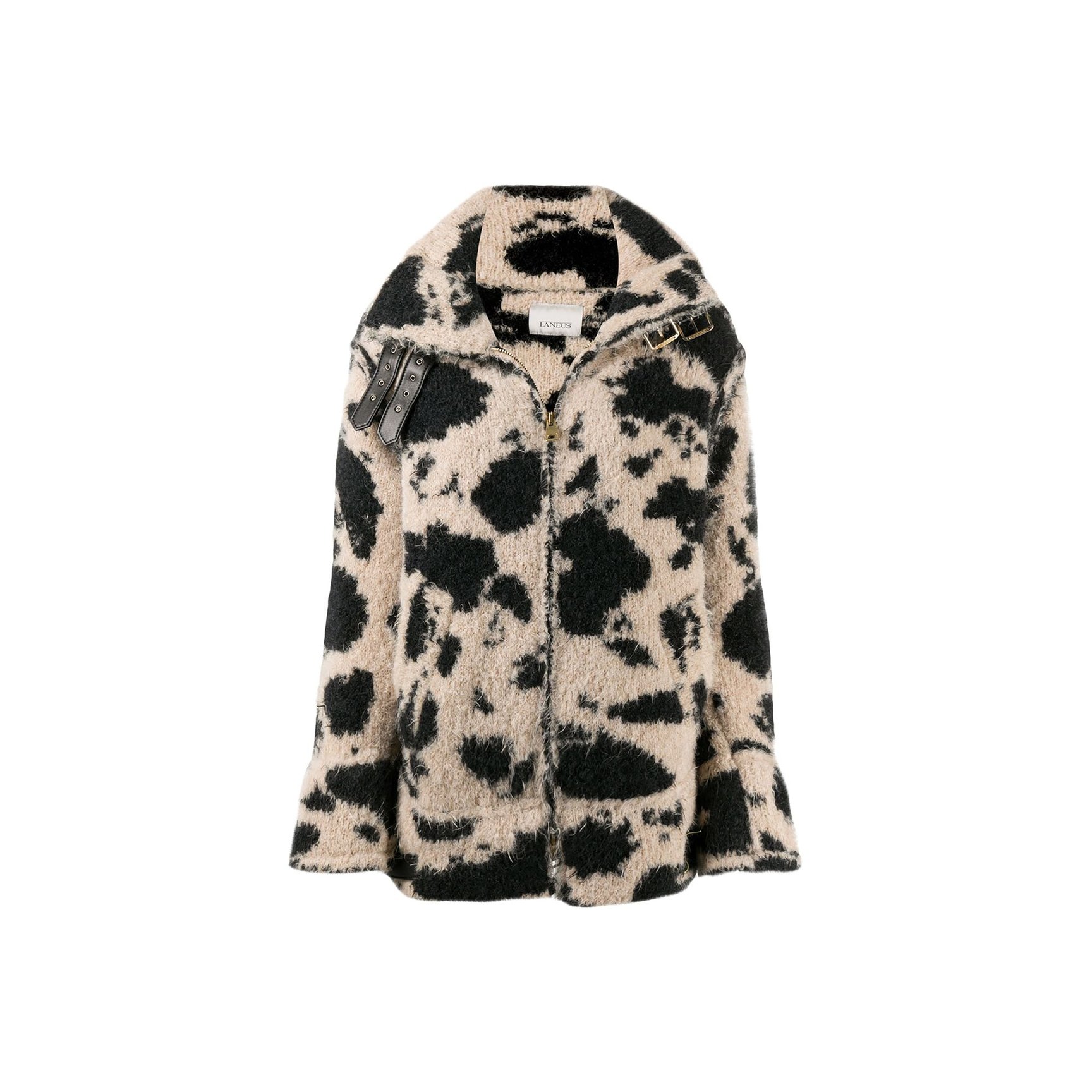 もこもことした質感の「ラネウス(Laneus)」のニット素材のジップカーディガンです。斑模様が自然なので挑戦しやすそうなアイテム。首元のベルトなど、ライダース風のディテールにも注目です。