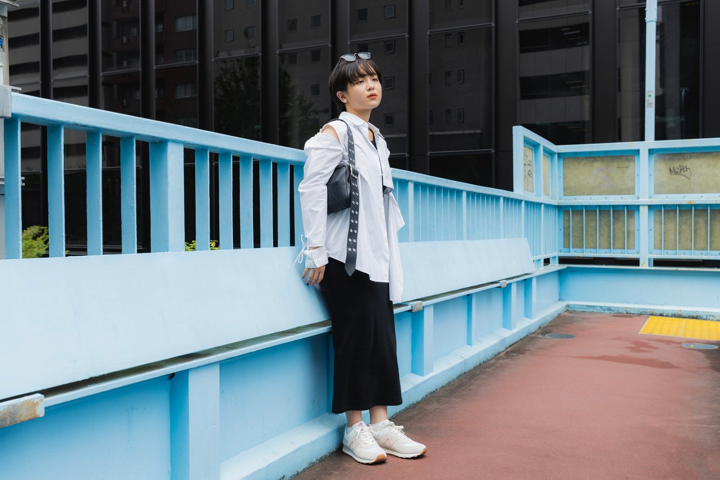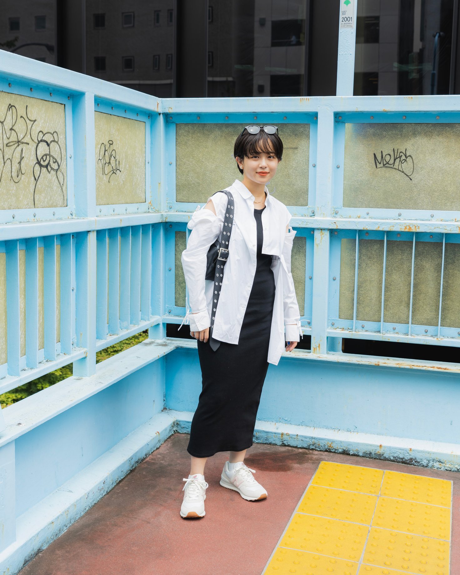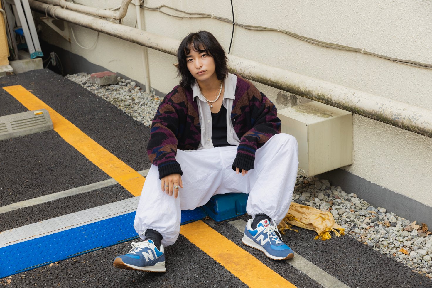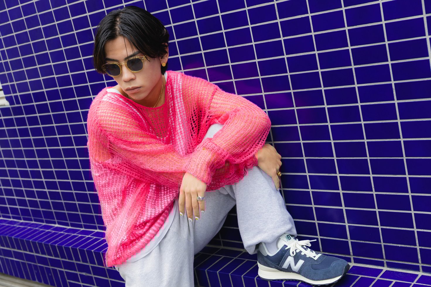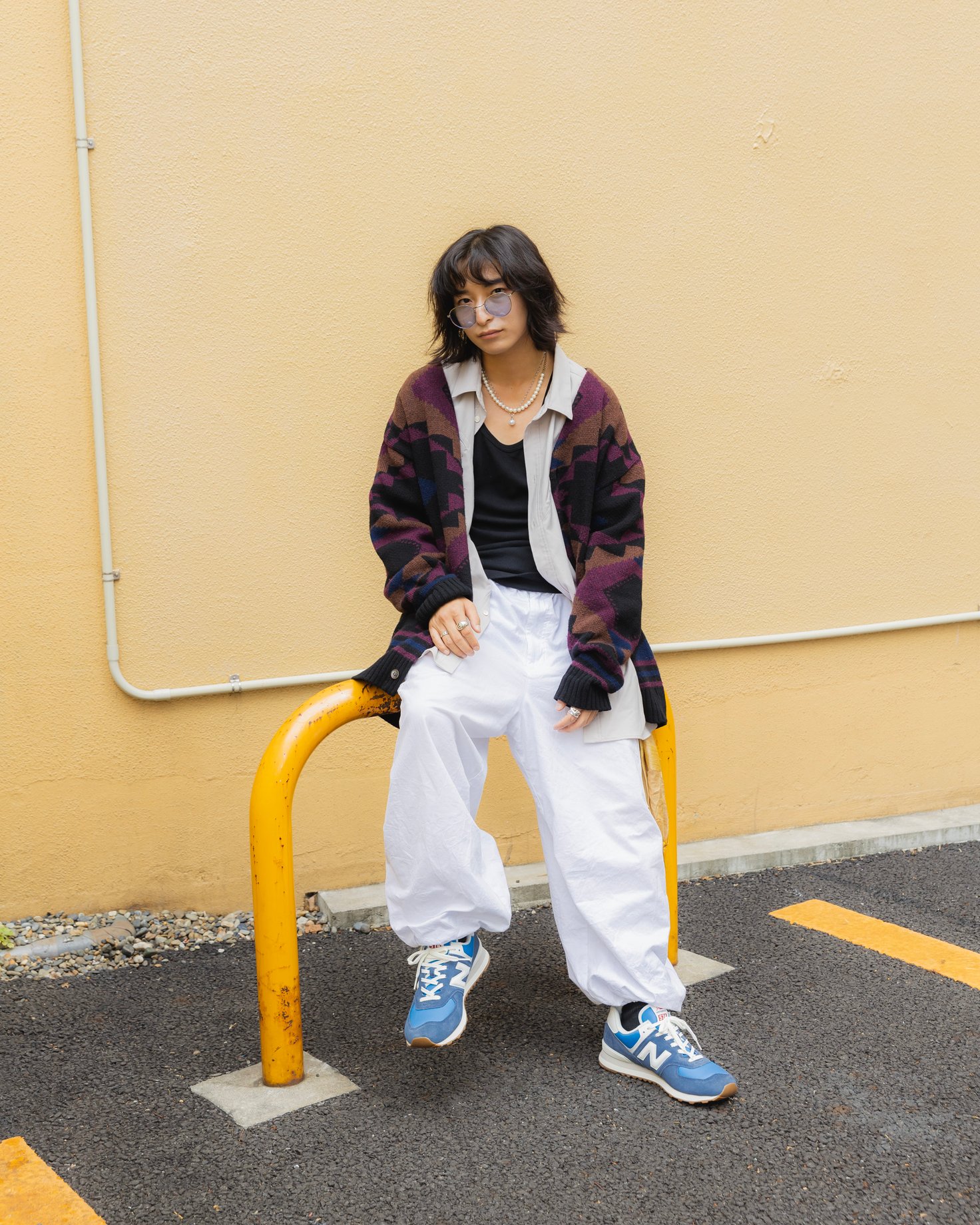 全体的にゆったりとしたシルエットのスタイリングには、「U574」がマッチ。カーディガン、シャツ、Tシャツ、パンツと全て異なるカラーで構成していますが、サングラスのレンズのカラーをシューズと合わせることで統一感が生まれています。