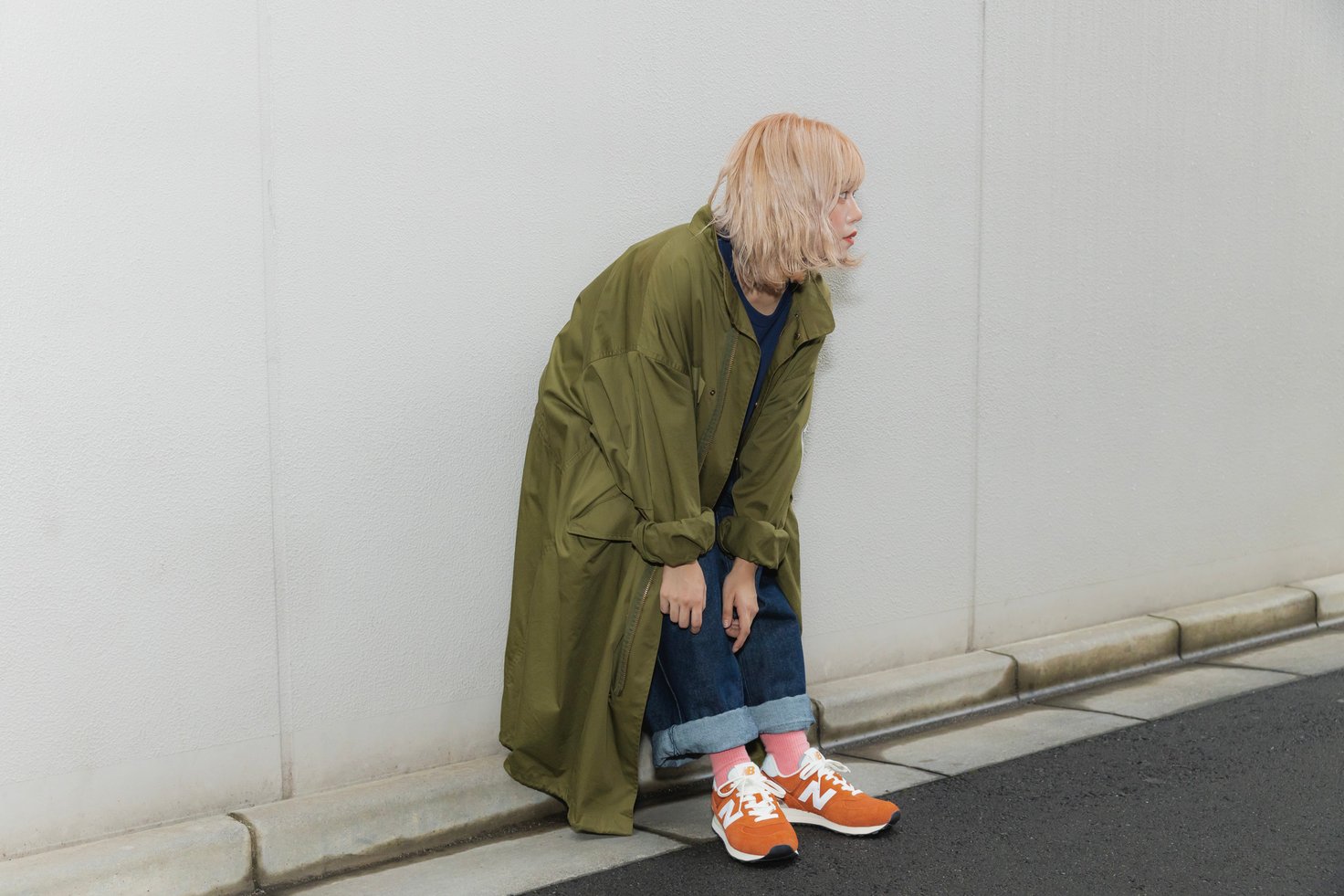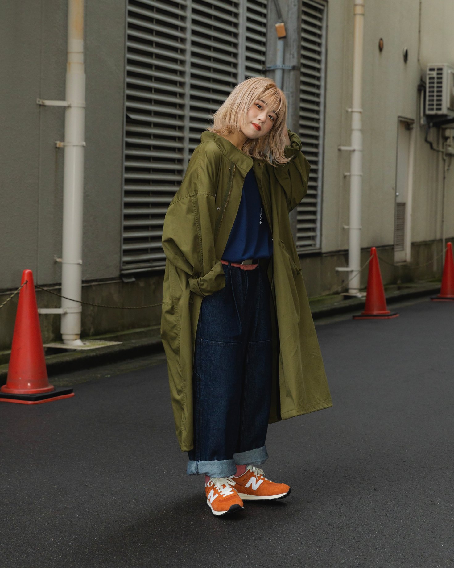 オーセンティックカラーのオレンジが鮮やかな「U574」には、シューズが映えるようリジットデニムをコーディネート。またモッズコートを中心にゆったりとしたシルエットのアイテムを選び、統一感を演出しています。