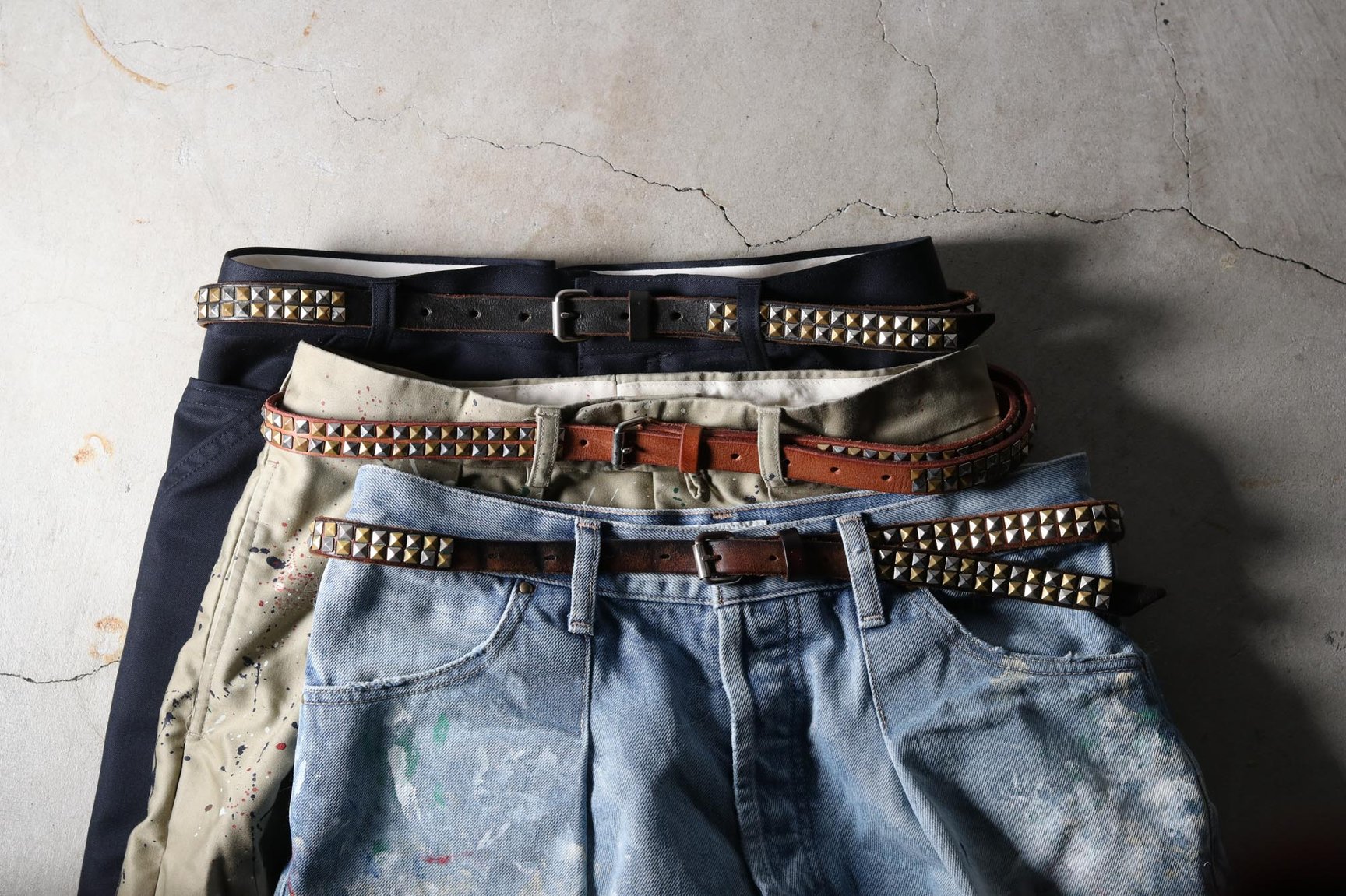 「同じベルトを15年近く使い続けてきたわけですが、自分でお店をスタートした後、縁あってマスター&コーの展示会に行けることになりました。せっかくの機会なので自分のベルトを持っていき、このベルトをアップデートさせたいです、と別注企画のお願いを経て完成したものが今回のベルトになります。形やスタッズなど、ベースとなる部分は僕が使ってきたものと全く同じで、バックルのみシルバー925に変更しています」