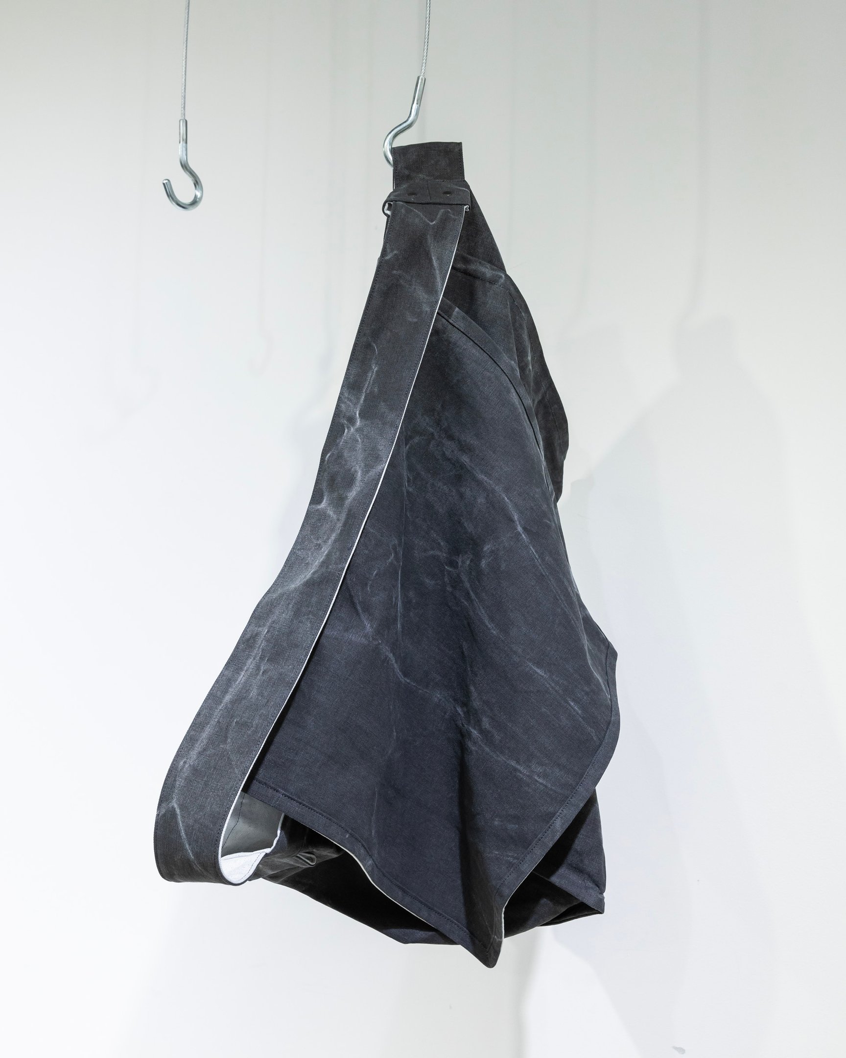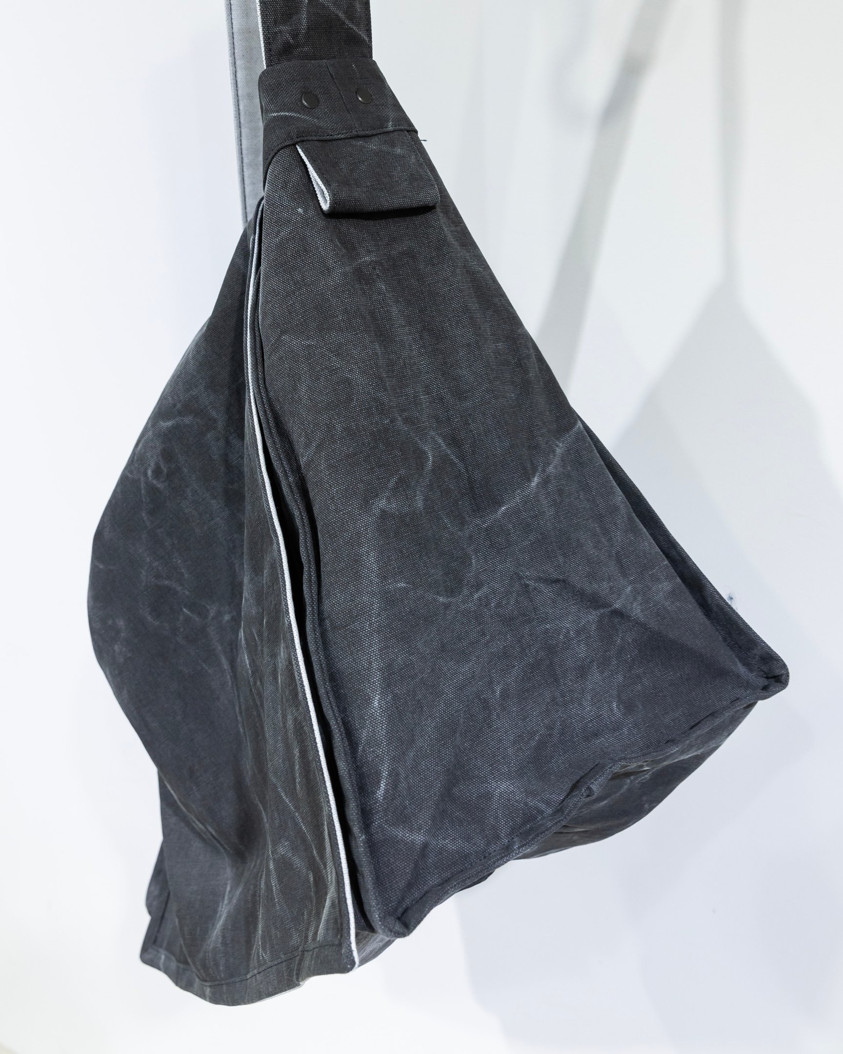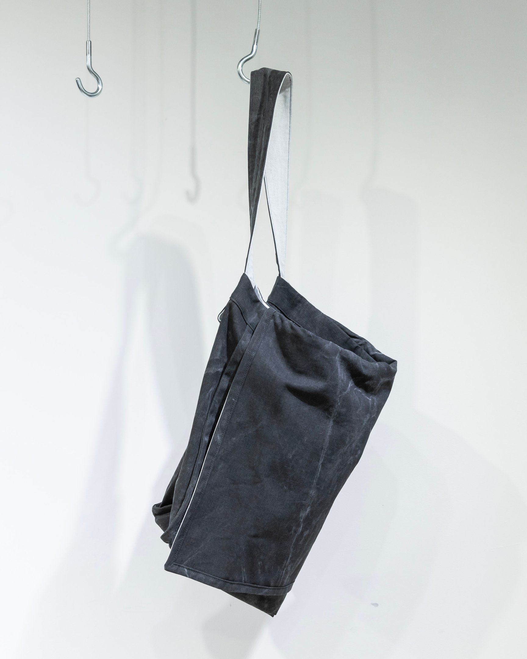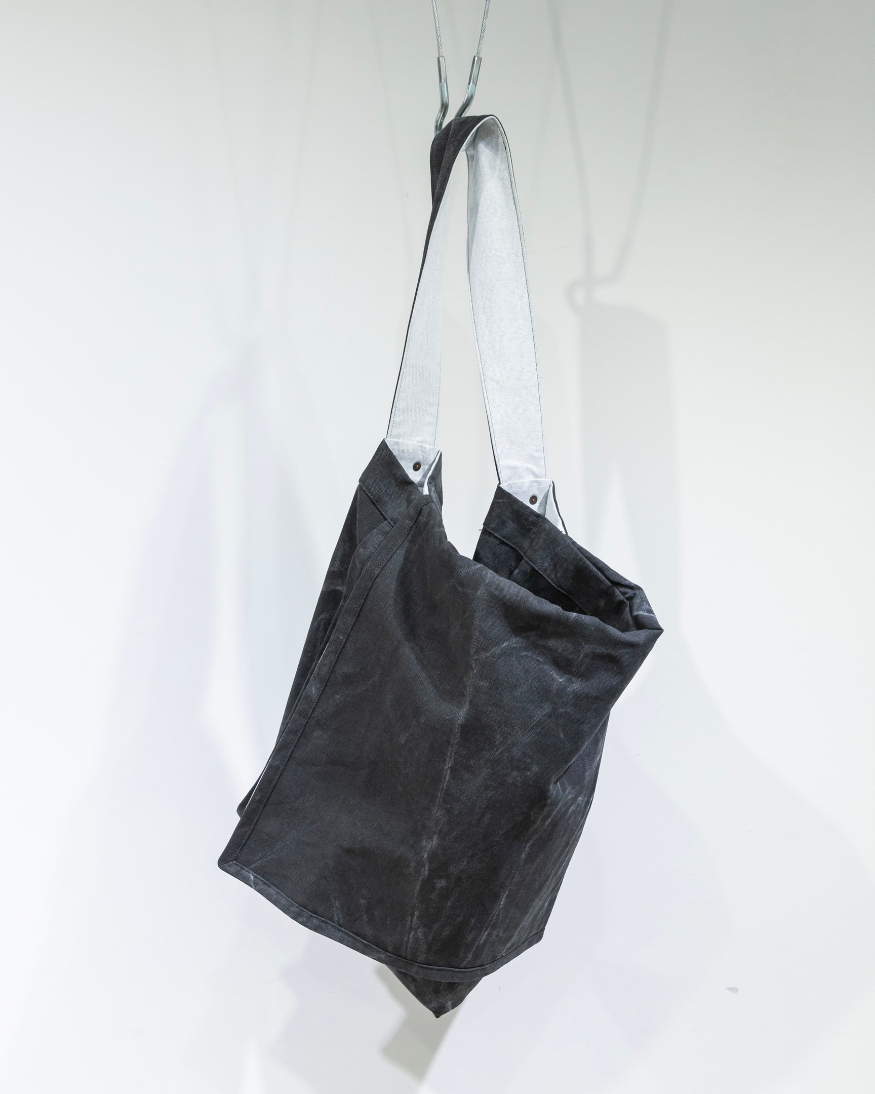 「コントール(kontor)と作った今作には洋服で展開されていた生地を使わせてもらいました。特殊な顔料を吹きつけたコットン100%のキャンバス地で、洗うことによって次第に表面がひび割れていきます。そのさまや、気楽にも扱える材質が、当時使用していたニュースペーパーバッグとリンクするように感じられたからです」